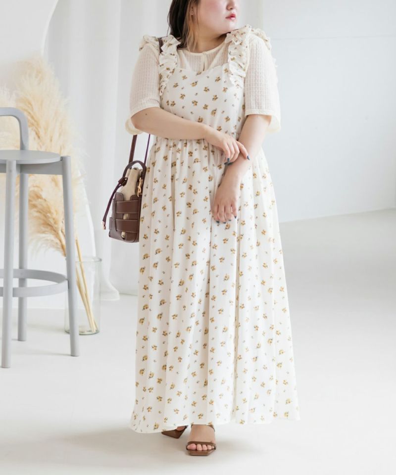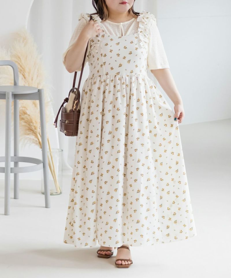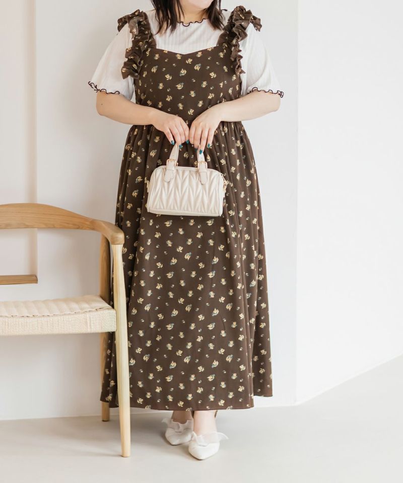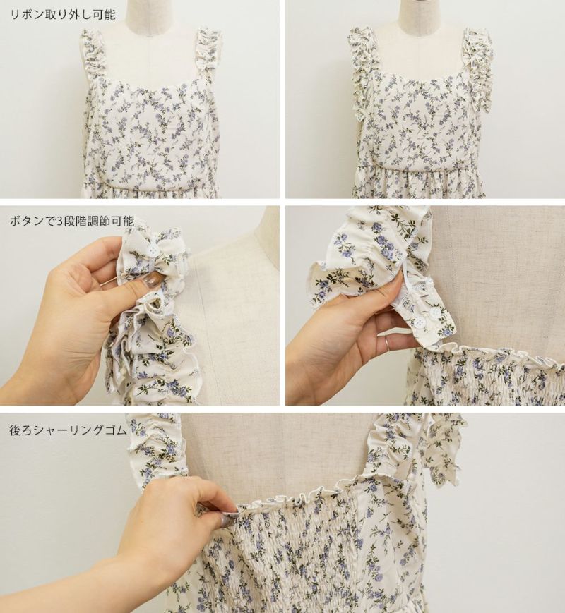 LLサイズを着用しました。肩まわりや身頃に窮屈感はなく、ウエスト位置も高めでスタイルアップして見えました◎背中はシャーリングゴムが入っていて、綺麗見えするのにらくちんなのがポイント!ふわっと広がるシルエットが可愛くて、脚のラインも自然にカバーしてくれます。肩のリボンは取り外しできるので、気分によってアレンジを楽しめるのも嬉しい!インナー次第で長く着まわせそうな、着心地も見た目も大満足の一枚です♪