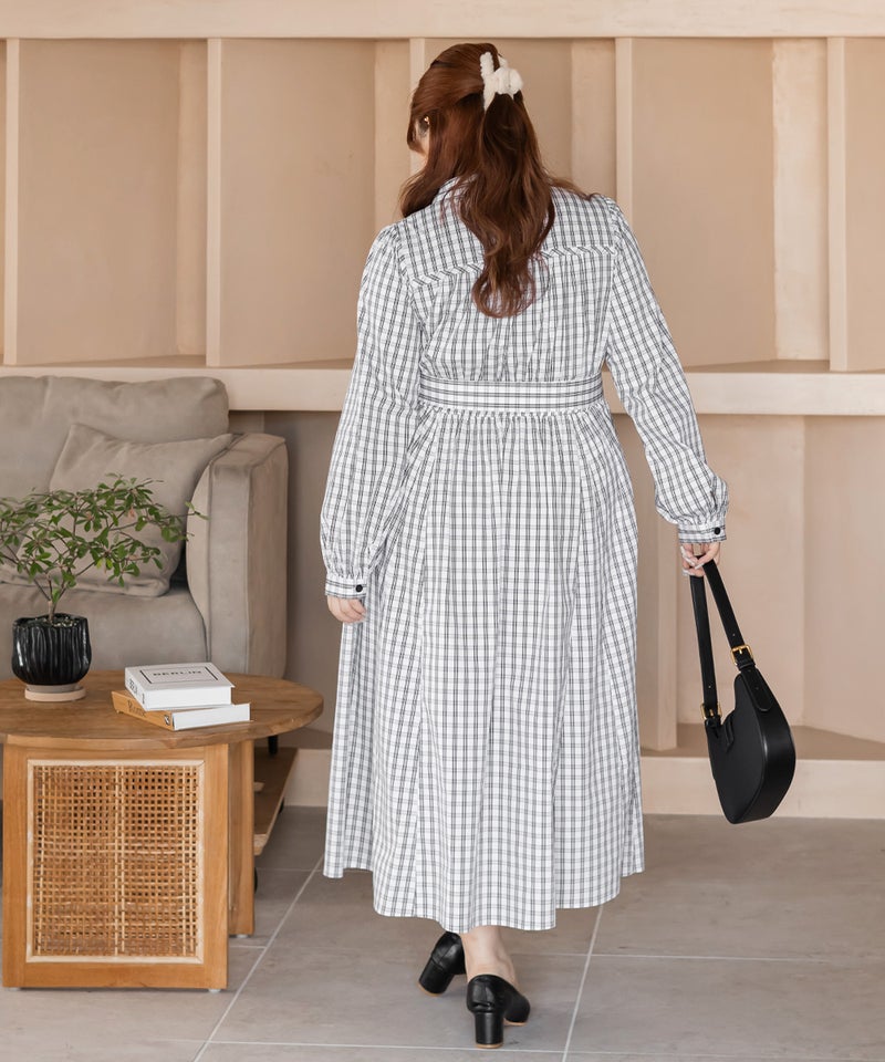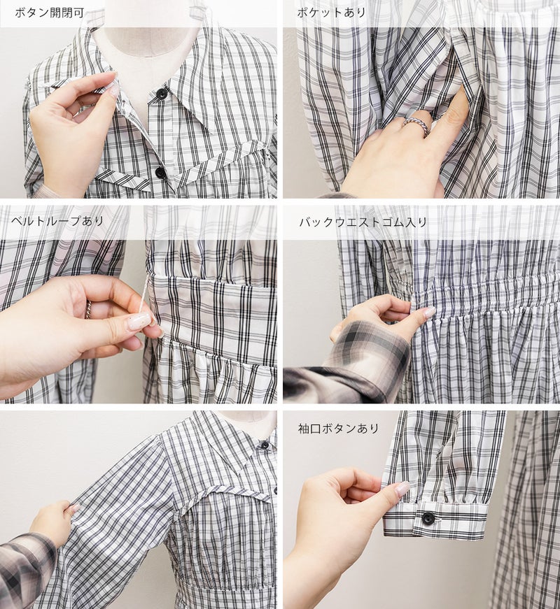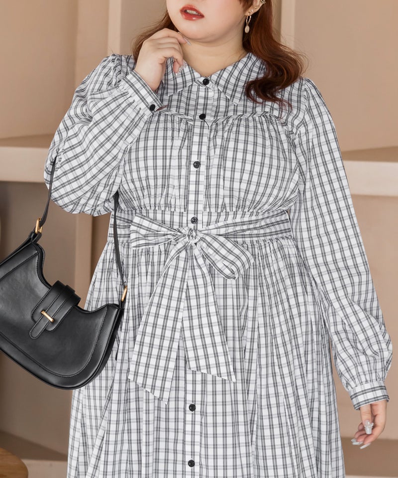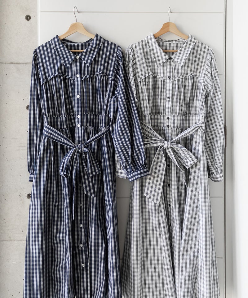 ビスチェのような胸元の切替とギャザーデザインがポイントのワンピース。レディな印象のシャツワンピデザインで着るだけで好感度高めのスタイルに。第一釦まで閉じても窮屈感がない襟と、お腹周りをカバーしてくびれをキュッと引き締めるデザインはこだわりポイント。リボン付きでフェミニンさもアップ。