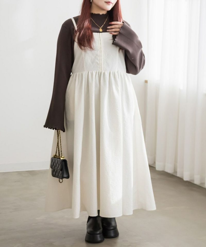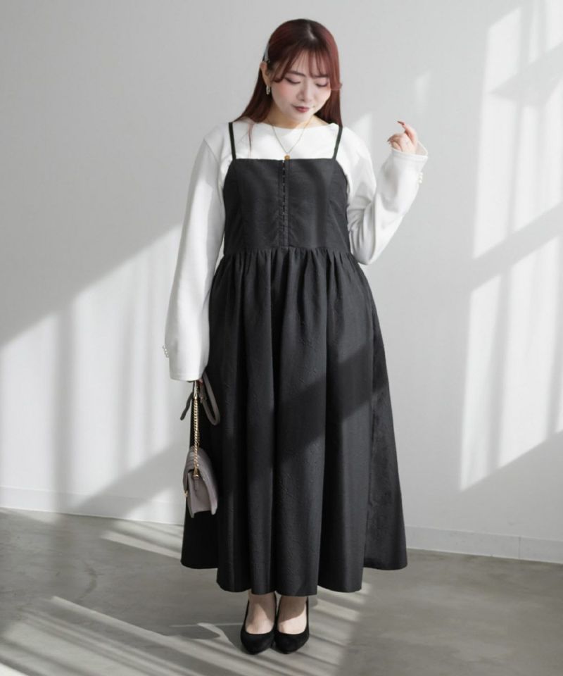 3Lサイズを着用して丁度いいサイズでした。気になる部分を隠してくれるから、気持ちも着心地もストレスフリーでした◎フロント部分はホックのデザインになっていて大人っぽい雰囲気で、甘くなりすぎずに今っぽい着こなしが完成します!凹凸のある生地感でボディラインをカバーしてくれます!後ろのデザインも可愛いので、ちょっと違った雰囲気でお洒落です!