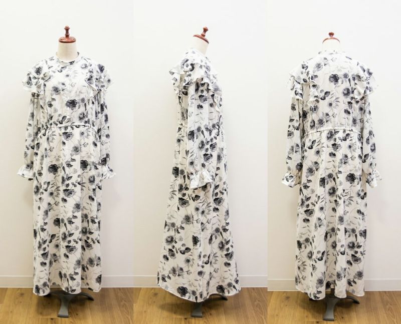 3Lサイズを着用していつも通りのサイズ感でした。ウエストはゴム入りでフィット&フレアのシルエットが女性らしいワンピースです!大人っぽいモノトーンの花柄で使いやすいワンピースです。肩にフリルがついていて肩回りの丸みをカバーしてくれます♪軽い着心地なのでお出かけや旅行など動くシーンにもおすすめです◎