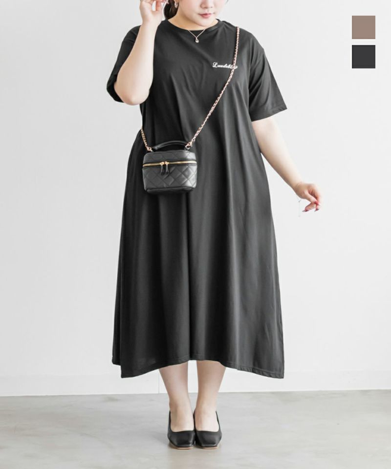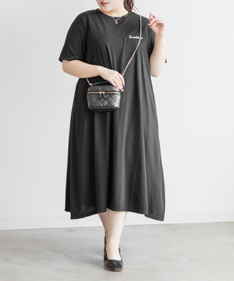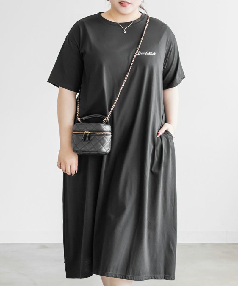 3Lサイズで全体的にちょうどよく、肩幅や二の腕まわりも窮屈感なく楽ちんです♪カジュアルなTシャツワンピも、胸元のロゴ刺繍があるだけでちょっぴりこなれ感アップ◎ 丈感もしっかりあるので、一枚でも安心して着られました。 キャップやスニーカーを合わせて王道カジュアルに、デイリー使いにぴったりの1枚です!