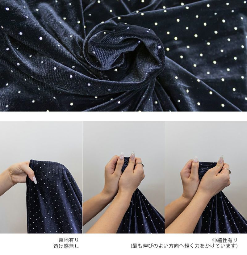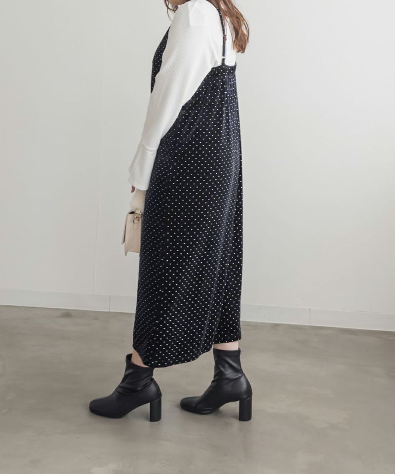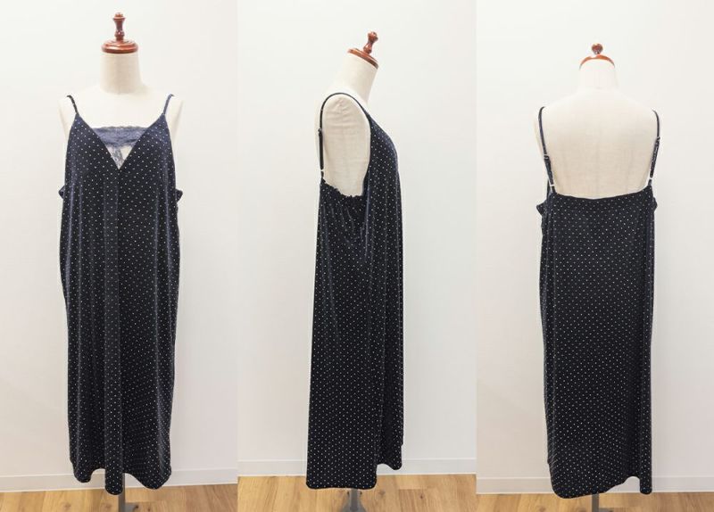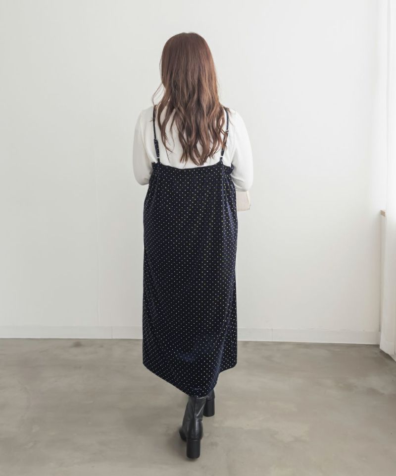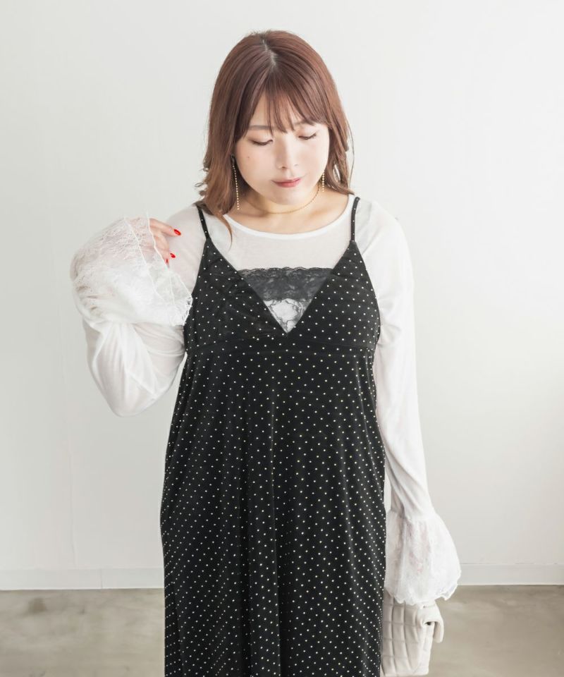 3Lサイズを着用しましたが、ちょうどいいサイズ感でした。生地自体が柔らかく伸びもあるのでらくちんに着られました!ドット柄ベロアと胸元にレースをあしらったデザインが上品で、1枚で華やかな印象を与えてくれます。ストンとした落ち感のあるシルエットで身体のラインを拾いすぎず、インナー次第でロングシーズン着回せるのも嬉しいポイントです。Tシャツやニットとレイヤードしてカジュアルにも、ブラウス合わせでフェミニンにも着こなせる万能ワンピースです。
