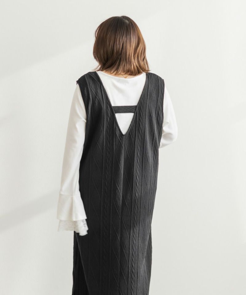 3Lサイズを着用して、ゆとりのあるサイズ感でした。3Lのサイズ感です。縦ラインのシルエットのワンピースですっきりとスタイルアップも期待できます!ケーブル編みのデザインのような生地だけど伸縮性もあり着心地が楽なのも嬉しいです。ブラウスやTシャツ、シアーインナーなどインナー次第でたくさん着回ししていただけます◎
