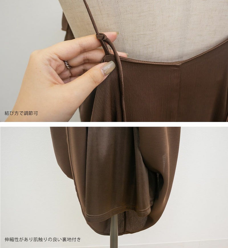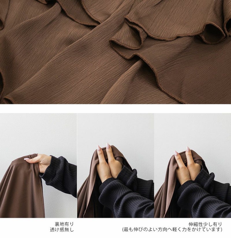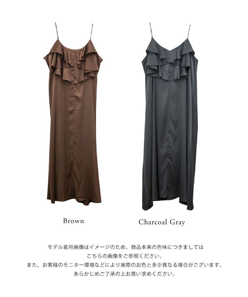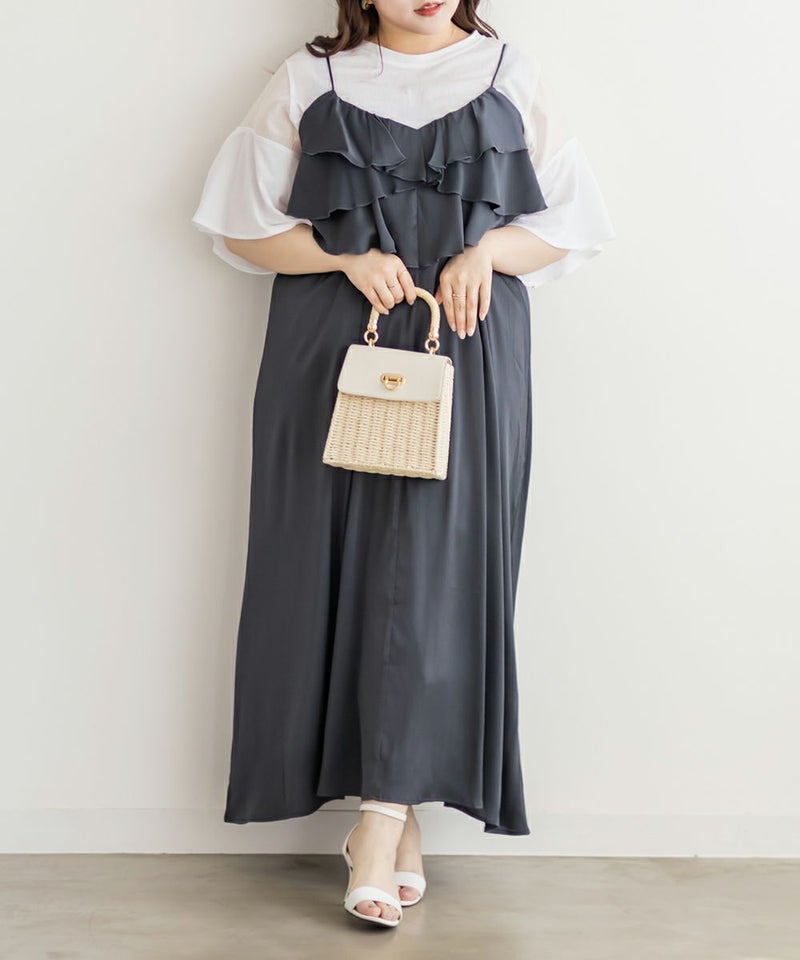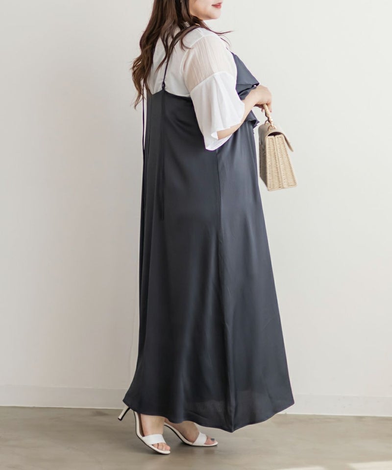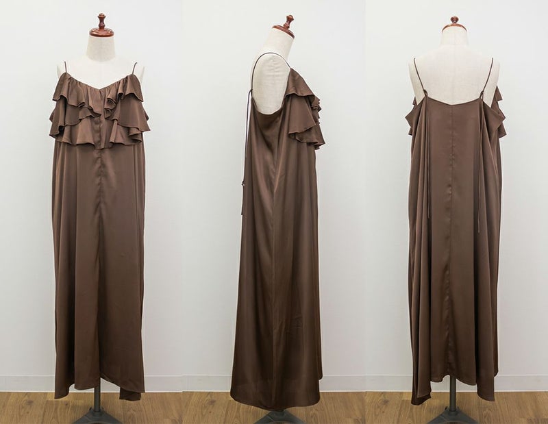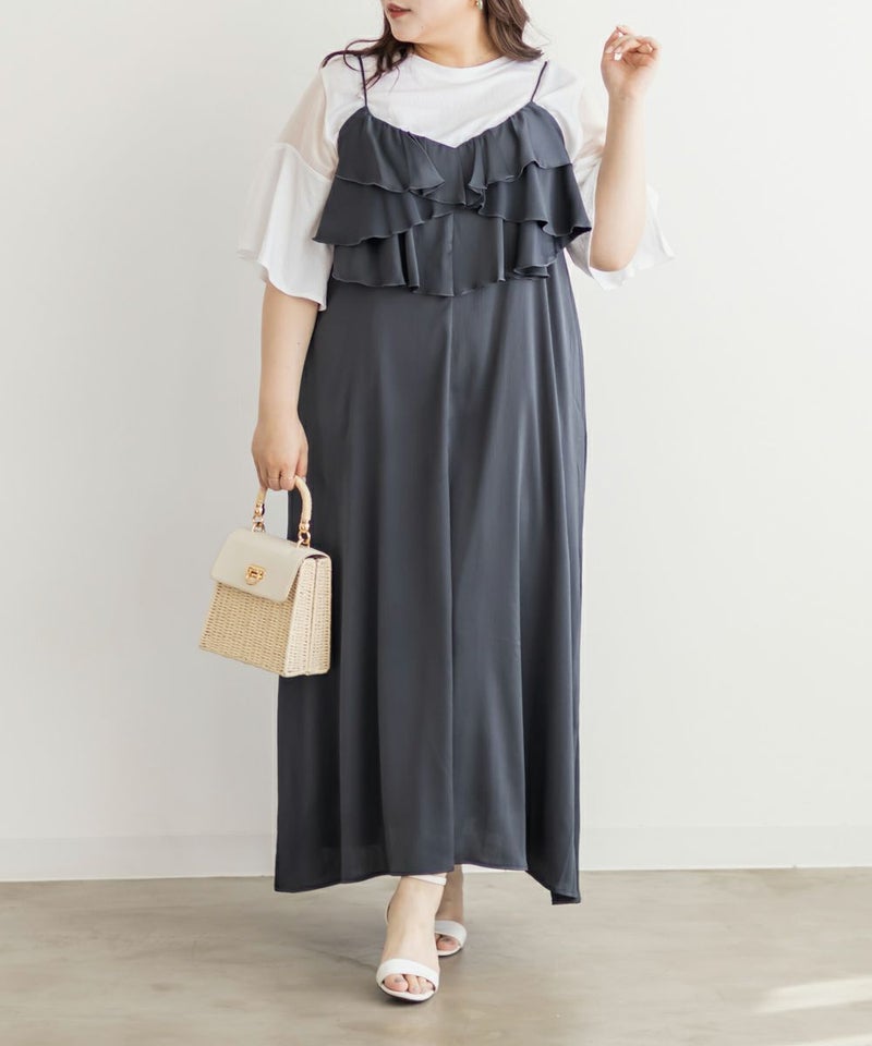 3Lを着て丁度いいサイズでした。胸元のラッフルデザインがかわいく、顔回りをすっきりさせてくれる効果も◎全体的にすっきりした縦のシルエットで着用出来るので、華奢な印象です♪さらりとした艶感のある生地が今っぽくて一気にトレンドコーデに!大人っぽい印象になれちゃう1枚でデートや旅行におすすめのワンピースです!