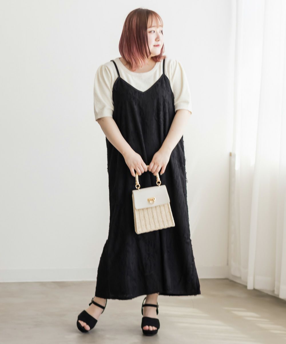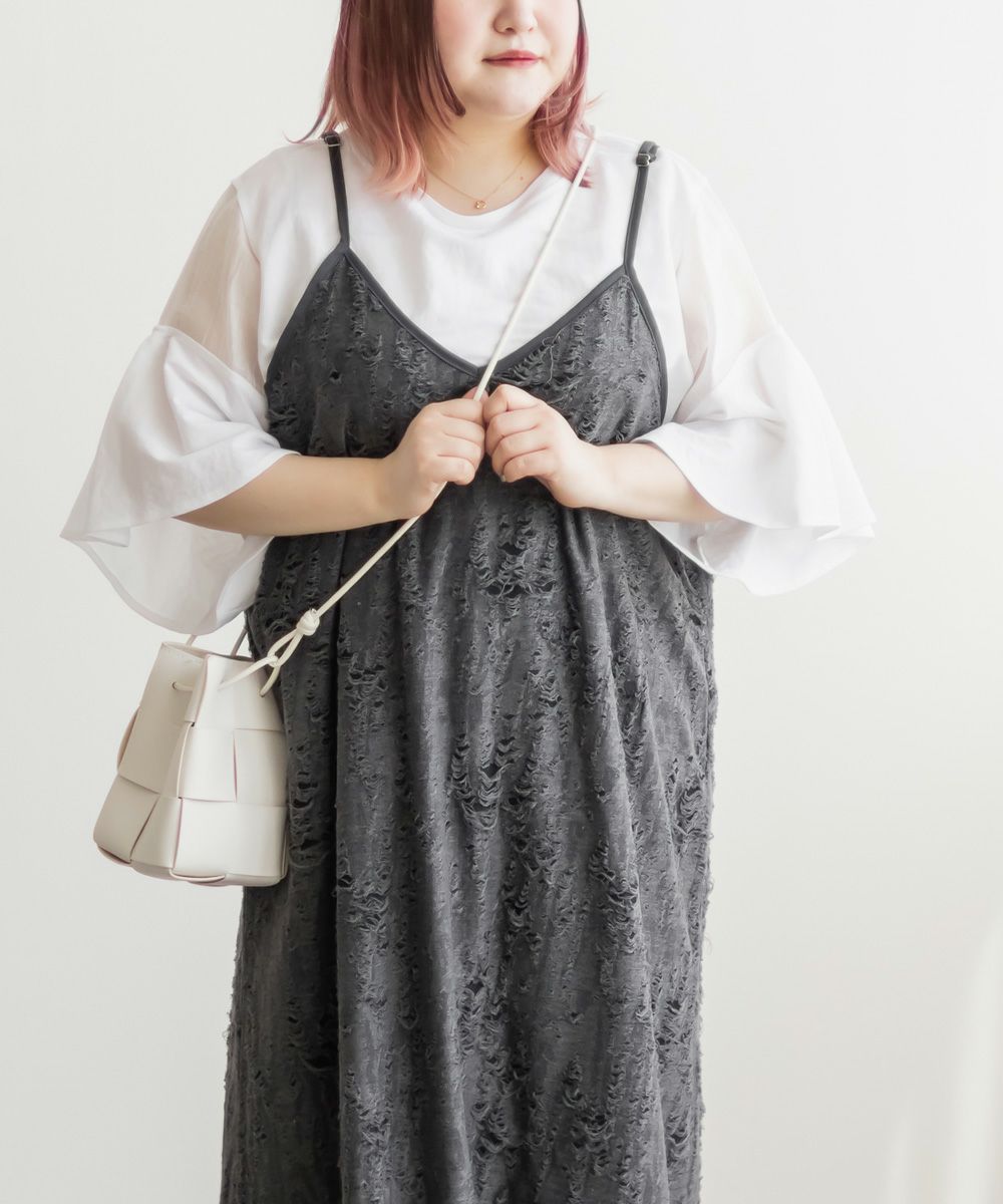 3Lサイズを着用して、ゆとりのあるサイズ感でした!肩紐は調整可能なので、自分の身長や好みに合わせて着丈を微調整できるのがうれしいポイント♪Aラインに広がるシルエットで、足さばきがよく、見た目にも軽やかです◎ダメージカットデザインがアクセントになっていて、シンプルながらもお洒落感のある着こなしが楽しめます♪インナー次第で着回せるので、季節問わず活躍しそうです◎ウエスト周りも締め付け感がなく、リラックスして着られました!今っぽい加工感のある生地がかわいく、簡単にいトレンドコーデが完成します!