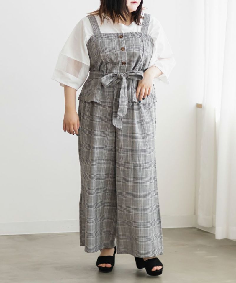 チェック柄ウエストベルト付きビスチェ&ワイドパンツセット 大きいサイズ 3L 4L クレット チェック柄ウエストベルト付きビスチェ&ワイドパンツセット