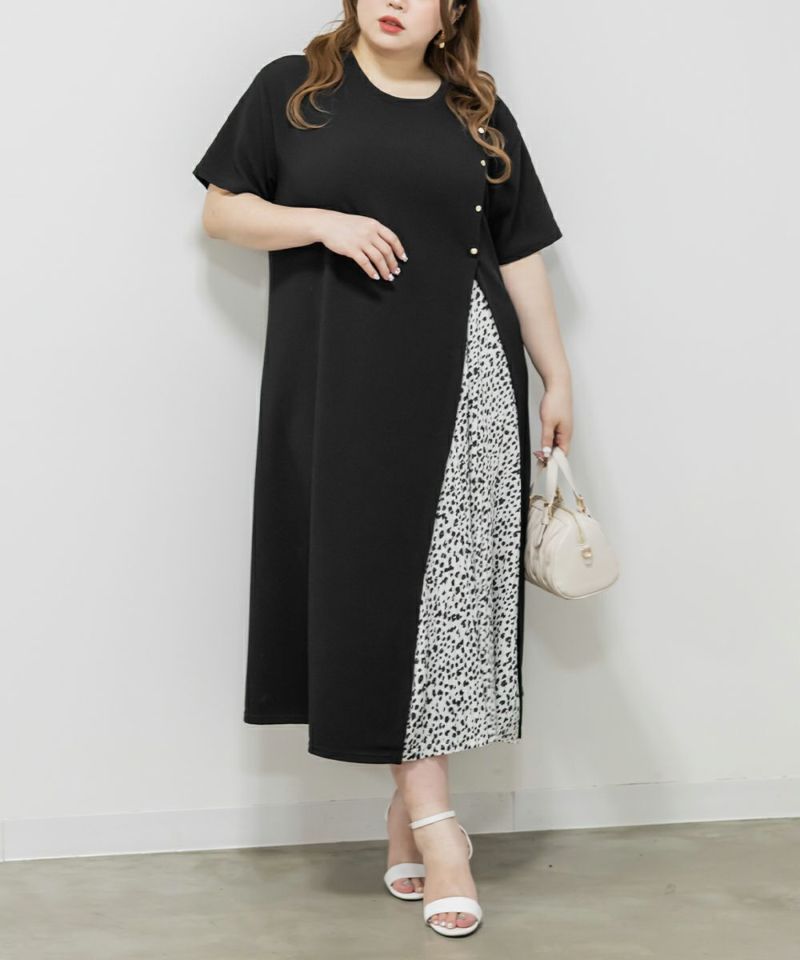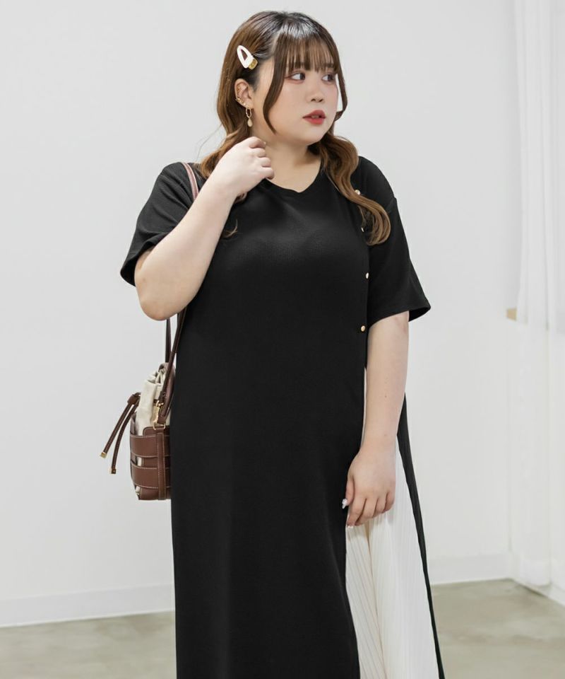 3Lを着て、ちょうどいい着心地でした。らくちんなシルエットながら、プリーツ切替やボタンデザインでしっかり抜け感もある1枚です♪1枚でサマになるワンピースなので、小物を変えるだけでオン・オフどちらにも使えそうです!