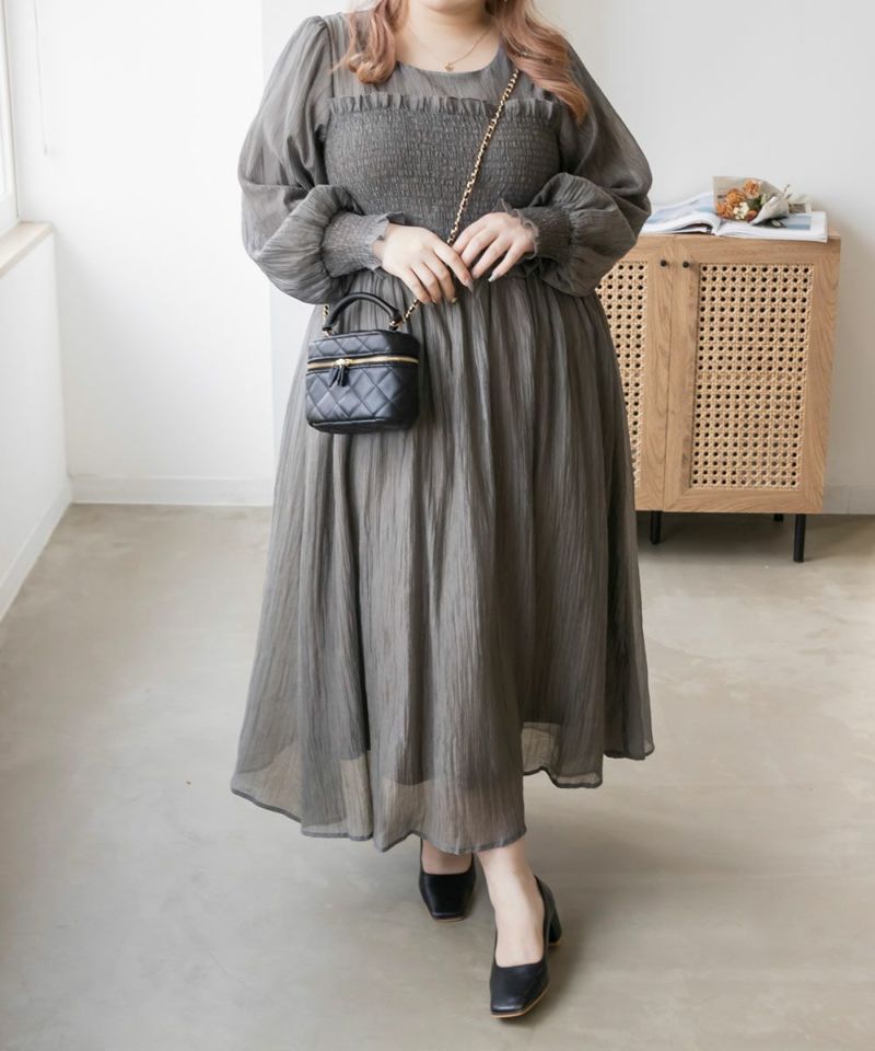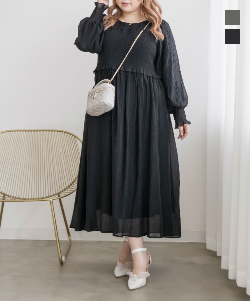 3Lをきてちょうどいいサイズでした。シャーリング部分は身体にフィットしますが、気になるお腹から裾にかけてフレアに広がってくれるので、メリハリのあるシルエットで着やせできます!もともとシワ加工をされたような生地なので、シワを気にせず使えそうだから、旅行にもおすすめです♪女性らしいけどさらっと大人っぽく着られる、色々な方におすすめしたワンピースです!