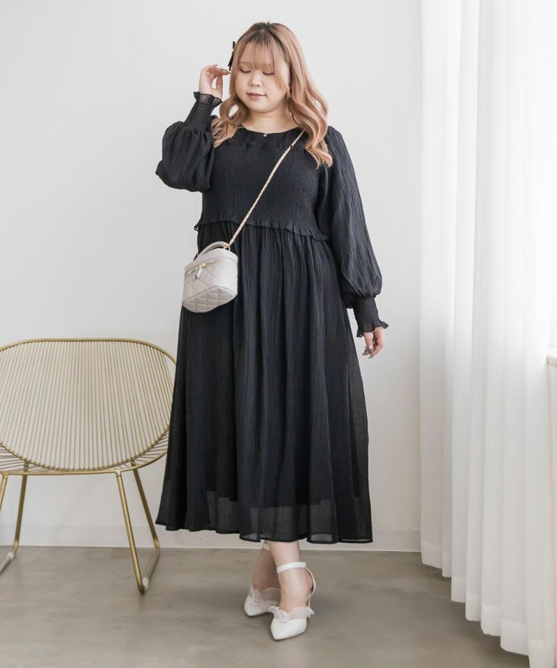 4Lブラックを購入しました。(普段4L着用) 胸元のシャーリング部分が胸や背中の肉感的を拾わないか不安でしたが、柔らかいシャーリングなのでそこまで目立たず安心です。身長は160cmで、着丈はくるぶし位まで隠れます。ふわっとしていて着やすいワンピースで、若干着痩せして見えるのでおすすめです。