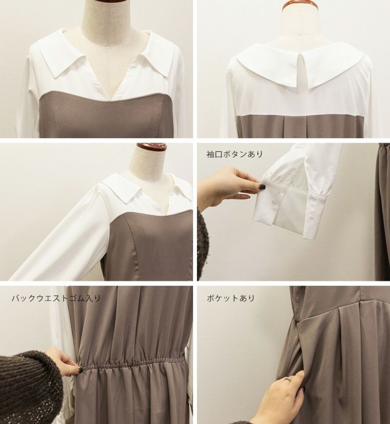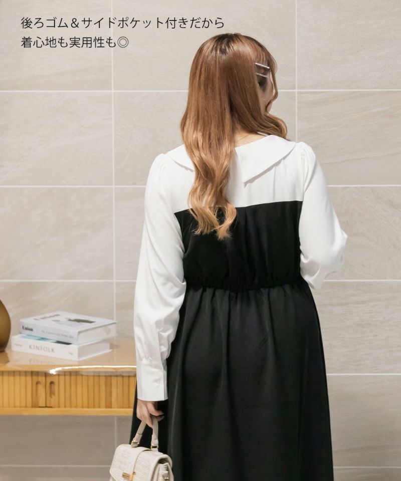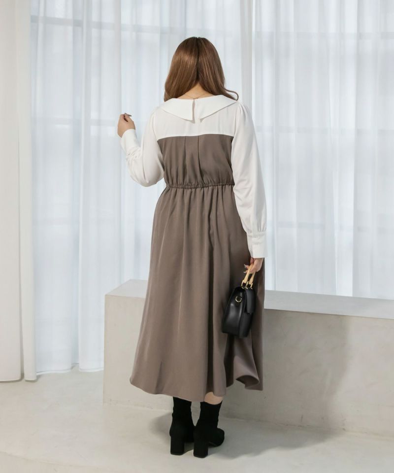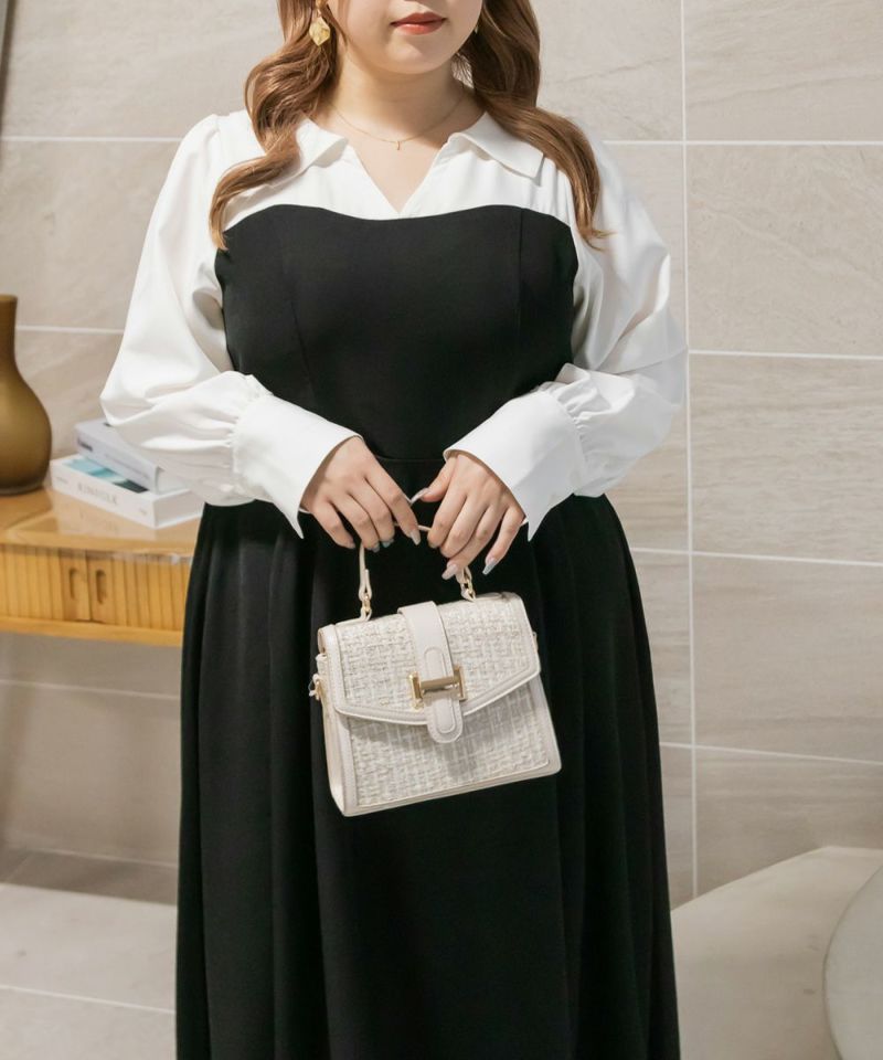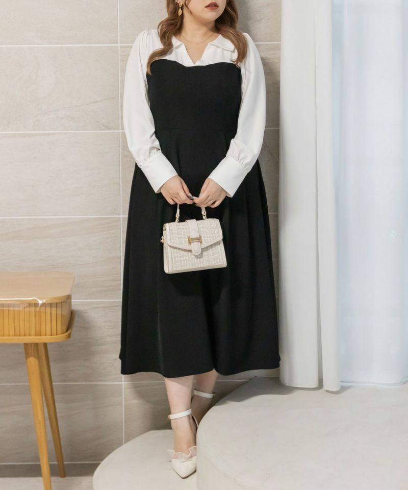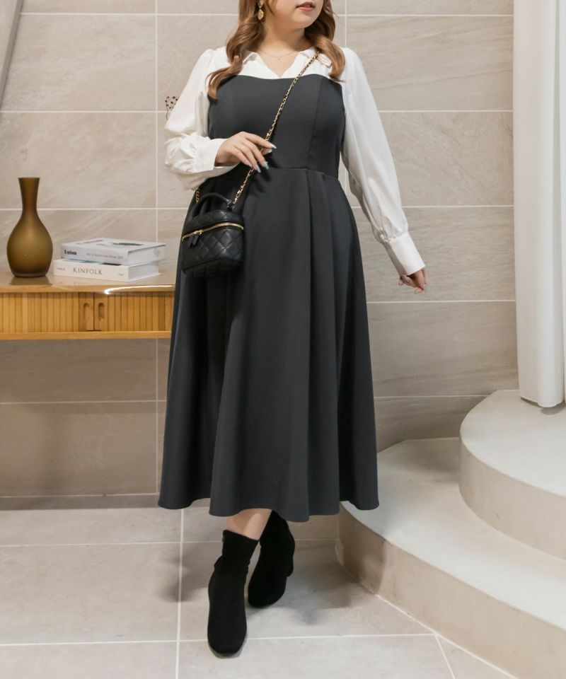 クレット ぽっちゃり 大きいサイズ ロングワンピース デート ビスチェワンピース シャツワンピース 着やせ CLETTEオリジナル★シャツレイヤード風ドッキングワンピース