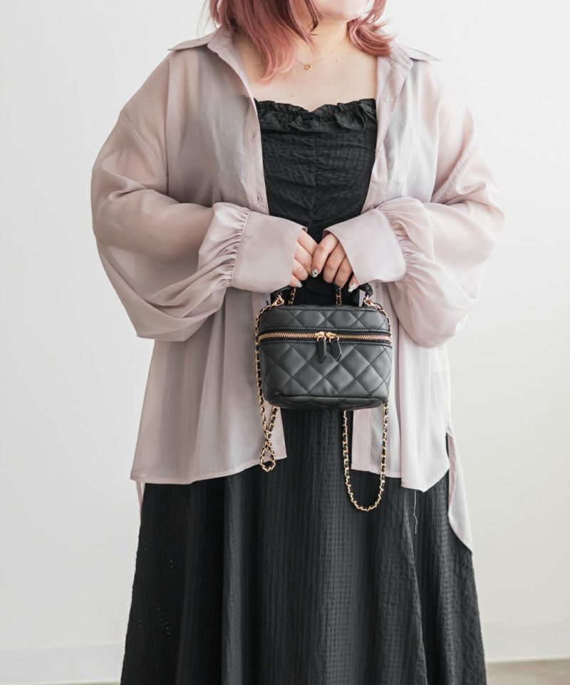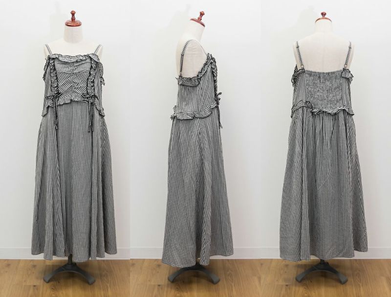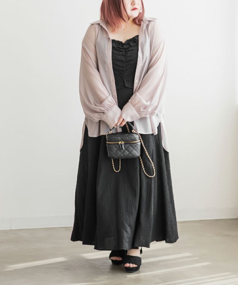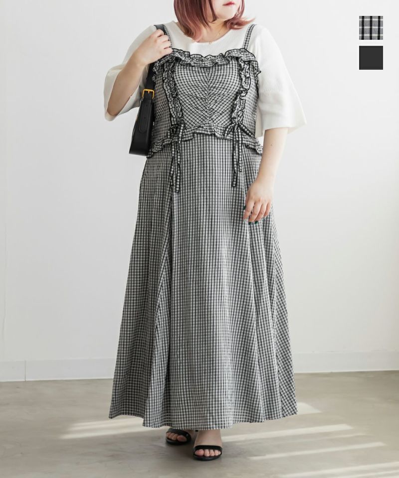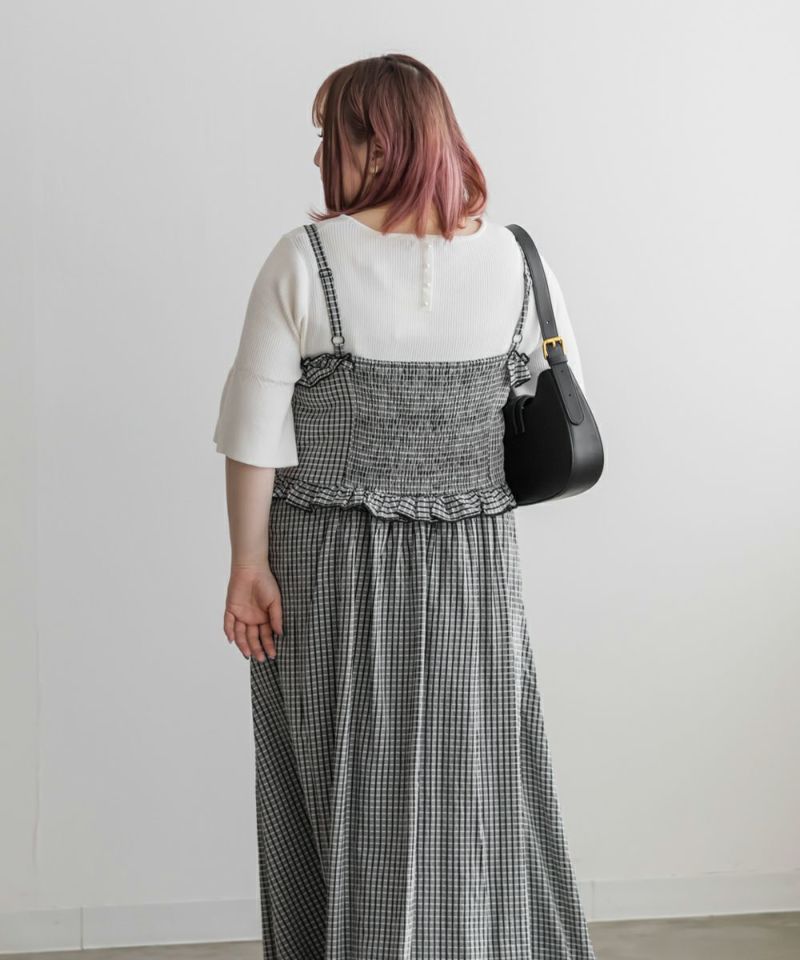 3Lサイズを着用しました。肩紐で長さが調整できるので、身長に合わせてバランスよく着られてちょうどよかったです◎ 身幅にもゆとりがあり、締め付け感なく楽な着心地なのに、広がりすぎないシルエットで大人っぽく着られるのがうれしいポイント♪ 胸元のフリルデザインが存在感があって、シンプルなインナーに合わせるだけでコーデが華やかになります。 光沢感のある素材で高見えするので、おでかけやお食事などちょっと特別な日にもぴったり!