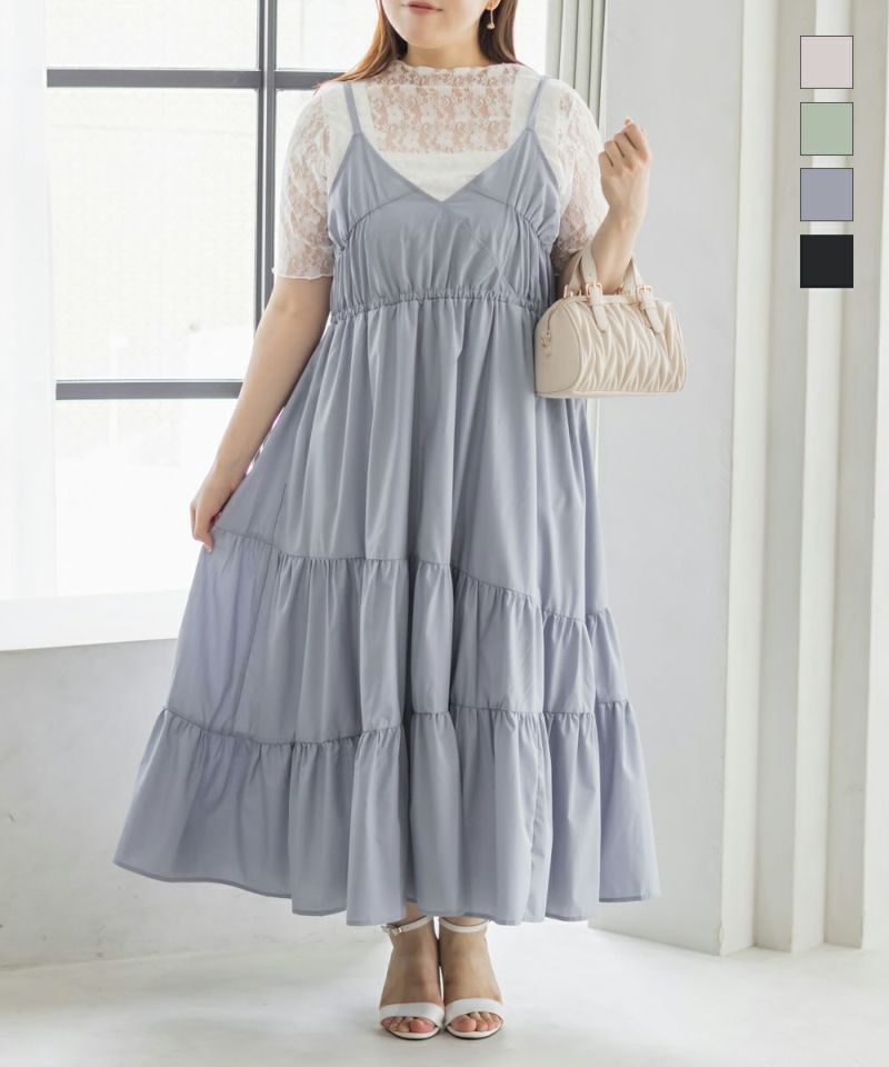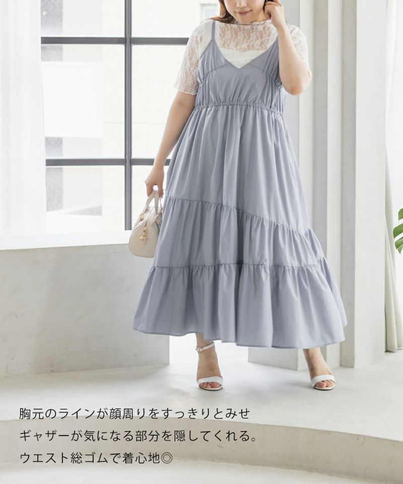 3Lサイズを着用しました。程よくゆとりを持たせたシルエット感で、厚みのあるインナーを合わせても問題なさそうです◎ 胸元の切替やギャザーで自然にメリハリが出て、バランスよく着こなせました! 斜めのティアードデザインが広がりすぎずフェミニンな雰囲気になって、シンプルなキャミワンピに飽きてきた方にもおすすめ!無地なのでインナーや小物合わせで印象チェンジしやすく、着回し力も高そうです!カラバリが可愛くて、テンションの上がるキャミワンピです♪