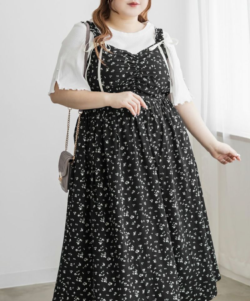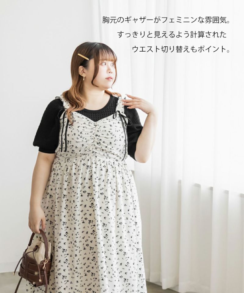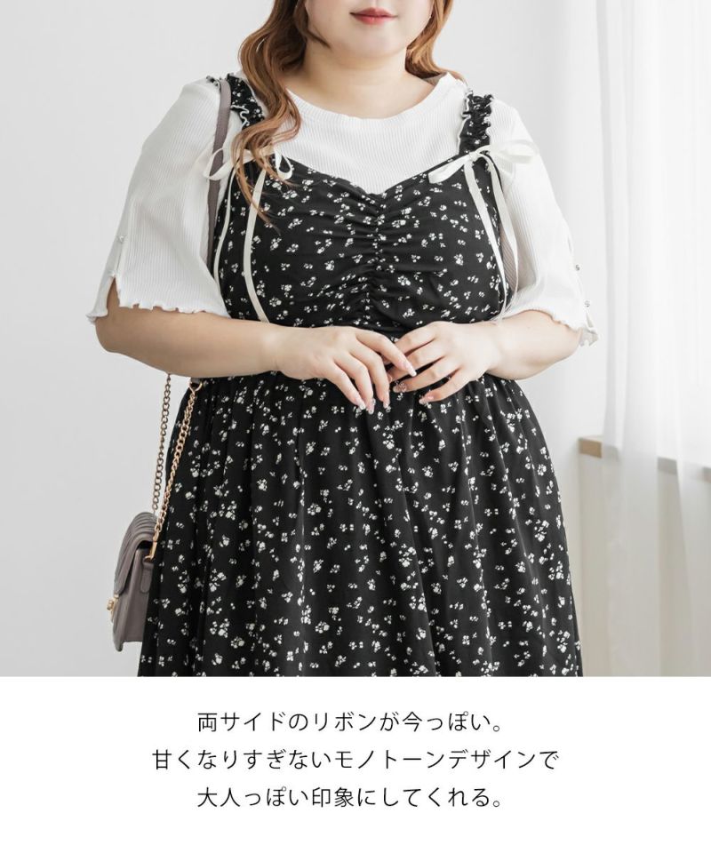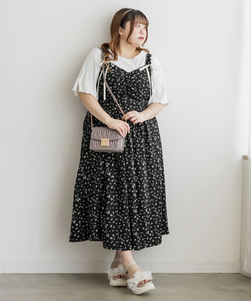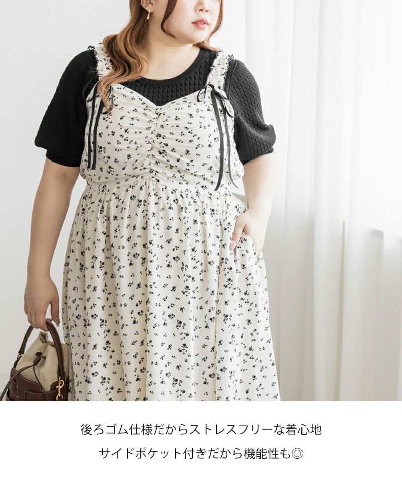 3Lを着てちょうどいいサイズ感した。身頃は程よくゆとりがあって、窮屈感なくリラクシーに着られます。華やかなフラワープリントが目を惹くワンピースは、肩に配色リボンがついていてかわいいアクセントになります!生地は程よく落ち感があって、広がりすぎないシルエットなのも大人っぽく着られるポイント◎ロングシーズン着られて、涼しくなってきたらカーディガンやデニムジャケットを羽織ってカジュアルダウンするのもおすすめです!一枚でしっかり映える主役級ワンピなので、ちょっとしたお出かけや女子会にもぴったりです♪
