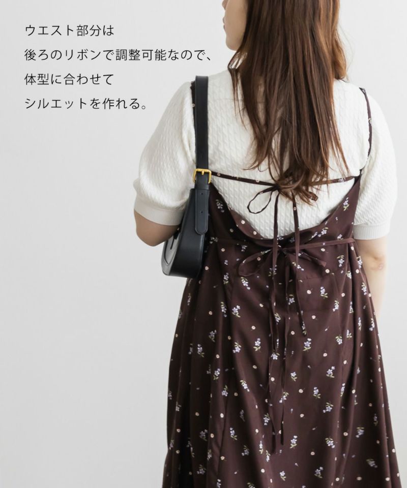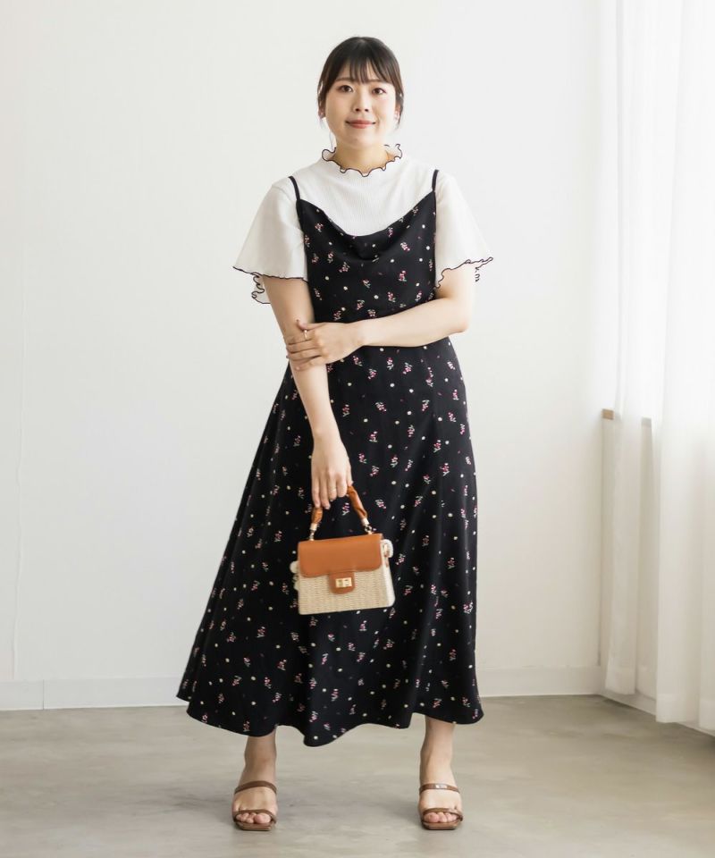 3Lサイズを着用して、ウエストやヒップまわりまでゆとりがあり、背中とウエストは紐で調節するので、自分好みのサイズ感で着用出来ました。ゴムが入っていないので、心配な方はサイズ確認をお勧めします!すっきりしたシルエットだけどパネル切替でラインを拾わずリラクシーな着心地でした◎胸元と背中はのドレープデザインになっていて女性らしい印象で、繊細な花柄と相まって、着るだけで華やか見えが叶います♪肩紐はアジャスター付きで調節可能なので、インナーや合わせるトップスによってバランスが取りやすく、好みの着丈に合わせやすいのも嬉しいポイント。裏地付きで透け感も気にならず、1枚でさらっと着られるのも◎Tシャツやシアートップスとレイヤードして、春夏らしい軽やかなスタイリングがおすすめ!ロングシーズン着回しできるのも嬉しいです。