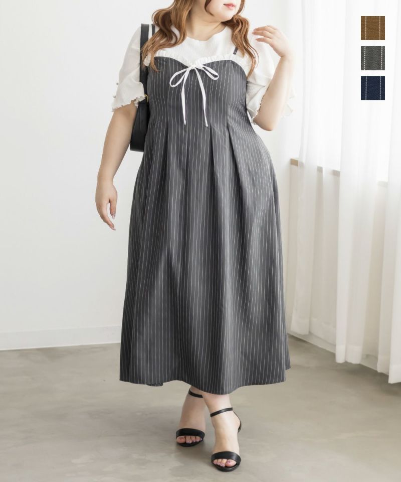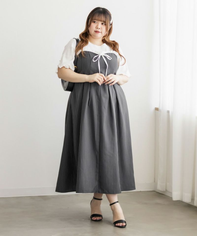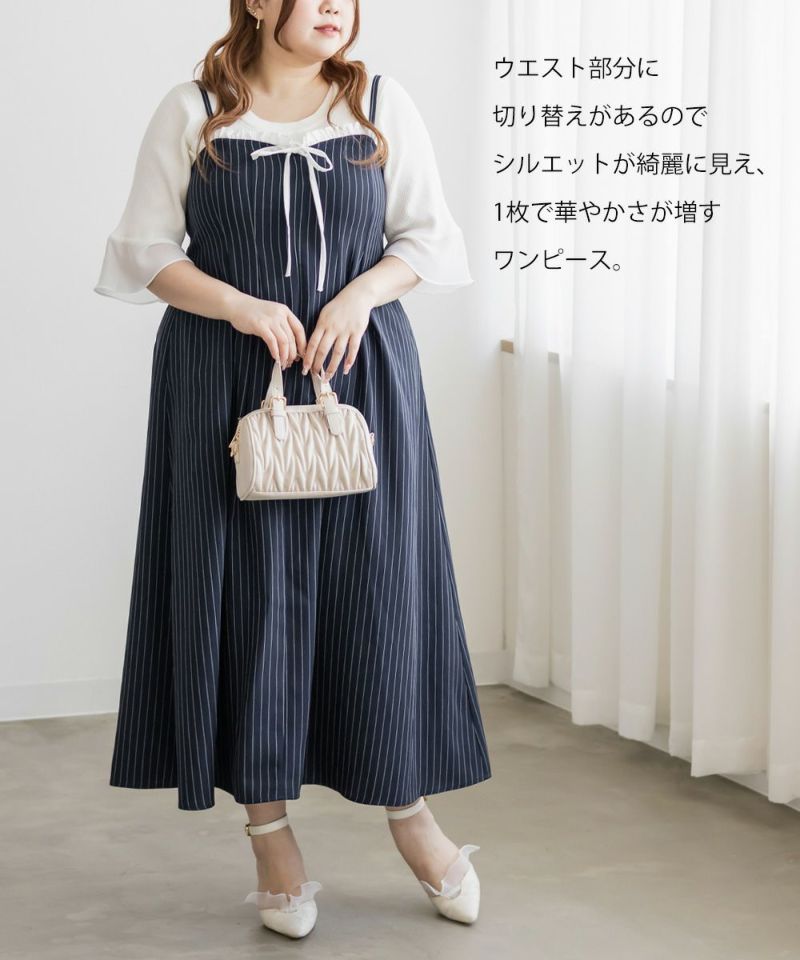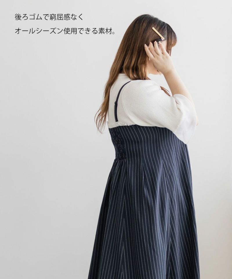 3Lを着て、見頃なども丁度良くすっきり綺麗に着用出来ました。後ろはゴムなので、フィット感がありながら窮屈感はなかったです!ウエスト部分にタックがたっぷり入っていてお腹周りもすっきりカバーしてくれます!すらっとしたシルエットながら、しっかりボディラインをカバーしてくれるディティールでした。ストライプ×リボン×フリルのときめき要素が詰まったキャミワンピで、アジャスター付きで肩紐の長さを調整できるので、バスト位置もちょうどよく着られました。Tシャツやブラウスを合わせて甘めに、シンプルなトップスでカジュアルに、着回し力も抜群の一枚です◎