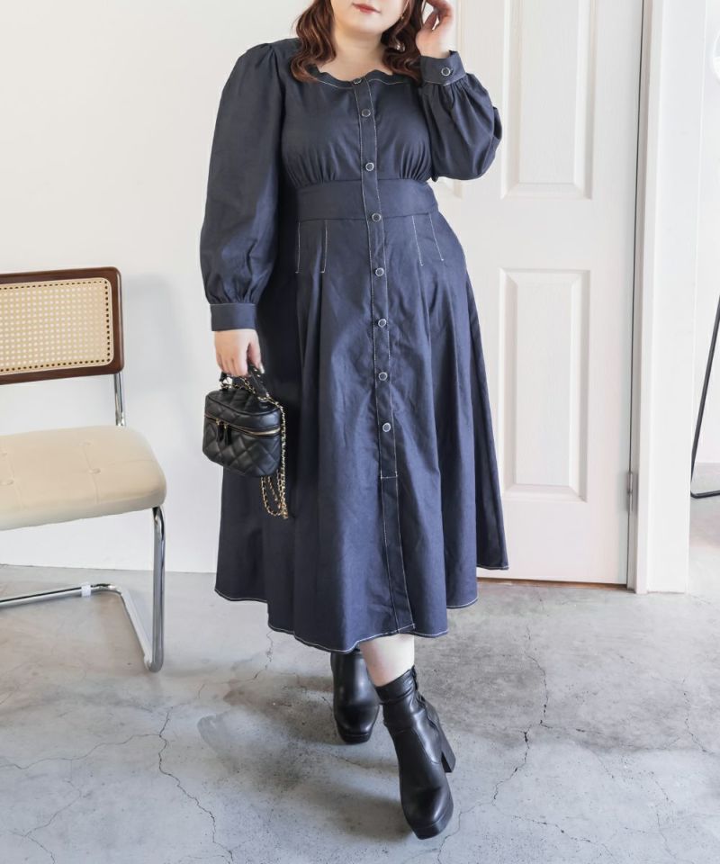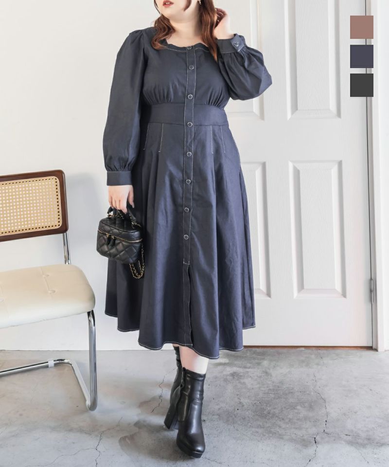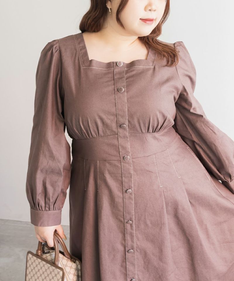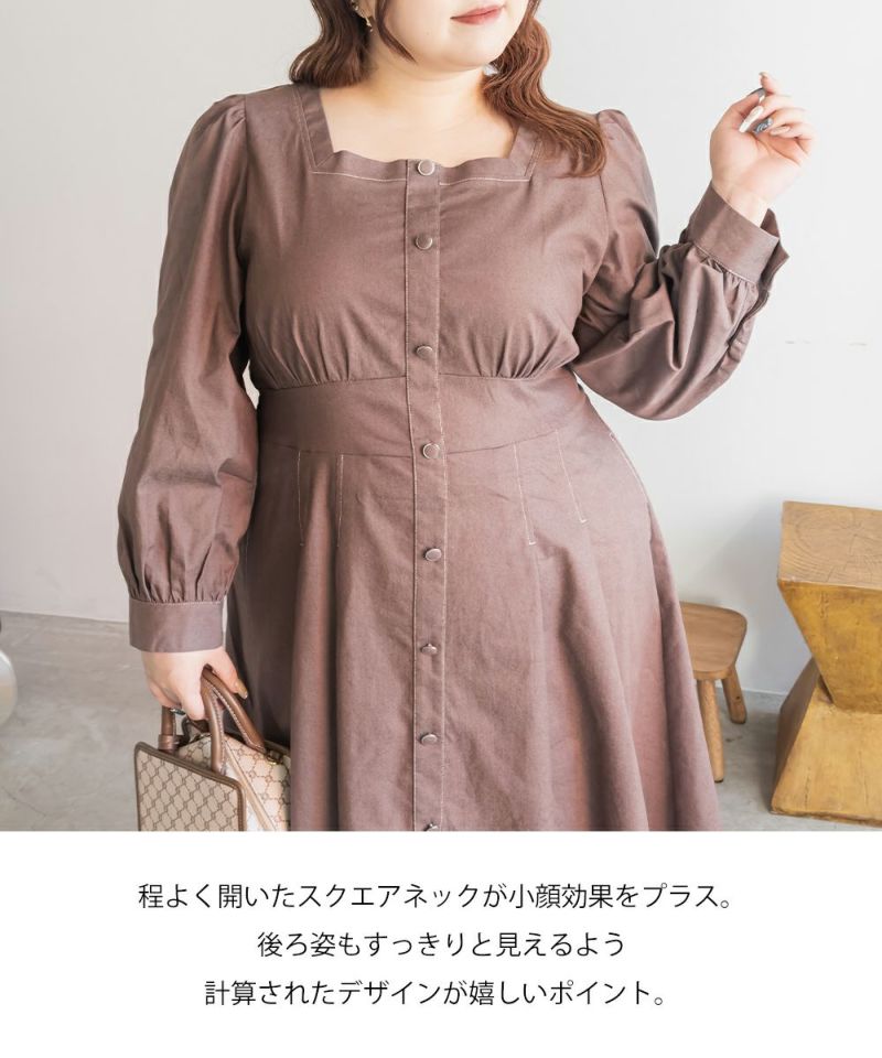 3Lサイズを着用て丁度いいサイズ感でした。スクエアネックなので、デコルテを綺麗に魅せてくれます!背中側はあまり開いてないのも嬉しいポイントです◎フロントは大きめのボタンがついているのと配色ステッチでメリハリのあるすっきりとした印象です!1枚でコーデが完成する主役級ワンピースで、丈感もしっかりありいろいろなシーンで着られるのが嬉しいです!上品で大人っぽいデザインなので、お出かけはもちろん、ちょっときっちりしたいシーンなどでも活躍できそうです!