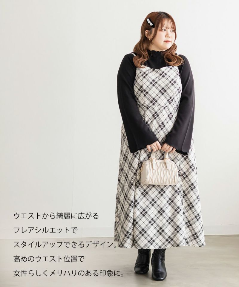 3Lサイズを着用して、ちょうどよくリラックスして着られました◎後ろはらくちんなシャーリングゴムで、ウエストから綺麗に広がるデザインが体のラインを拾わず、動くたびに軽やかに揺れてとても華やかです♪トレンド感たっぷりのチェック柄が、大人の甘さをプラスしてくれます!肩紐の長さ調整ができるので、好みの丈感に合わせられて安心感もあり、Tシャツやブラウスを重ねれば、オールシーズン着回せそうな優秀アイテムです!