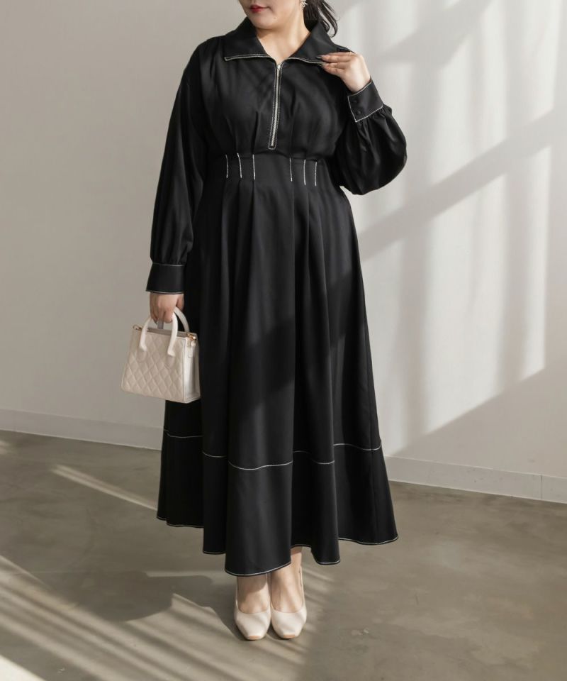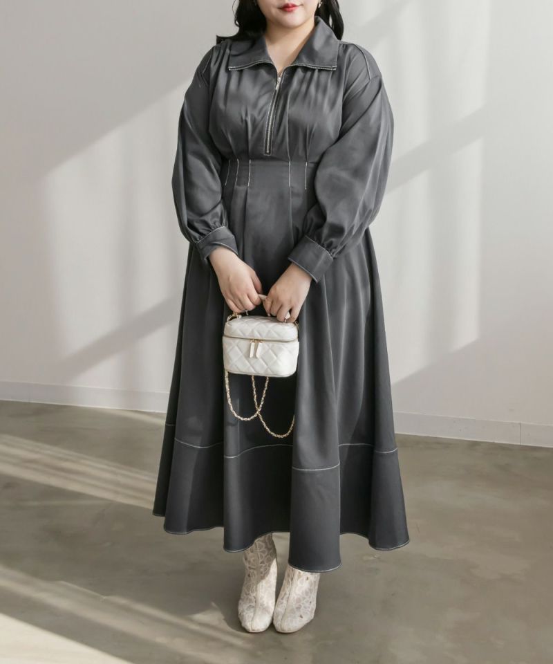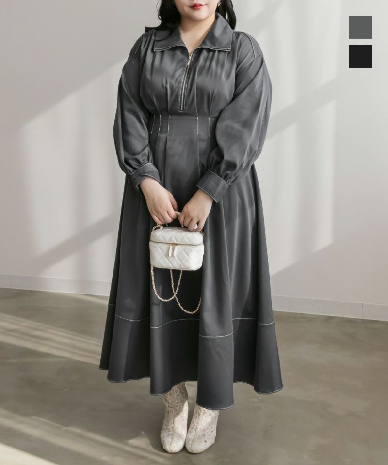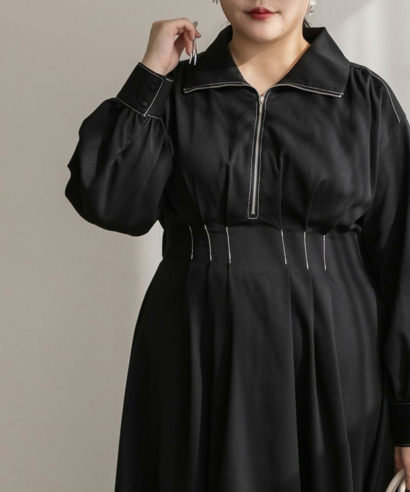 3Lを着用してぴったりのサイズ感でした。後ウエストはゴムになっているので窮屈館なく着用できました。心配な方はバストサイズの確認をお勧めします!おなか周りにタックが入ったデザインで、ウエストをキュッと細く見せてくれます。高めのウエスト位置から裾に向かってひらりと広がり、スタイルアップして女性らしさのある1枚!ステッチが配色になっていたり、ハーフジップだったりとメリハリの出るポイントがあって可愛いだけじゃなく着やせ効果も感じました◎