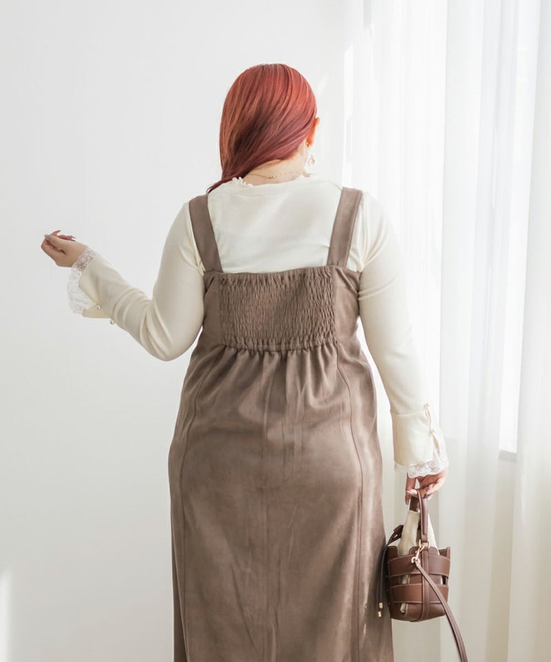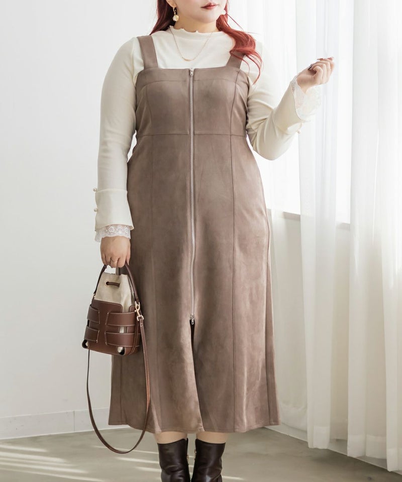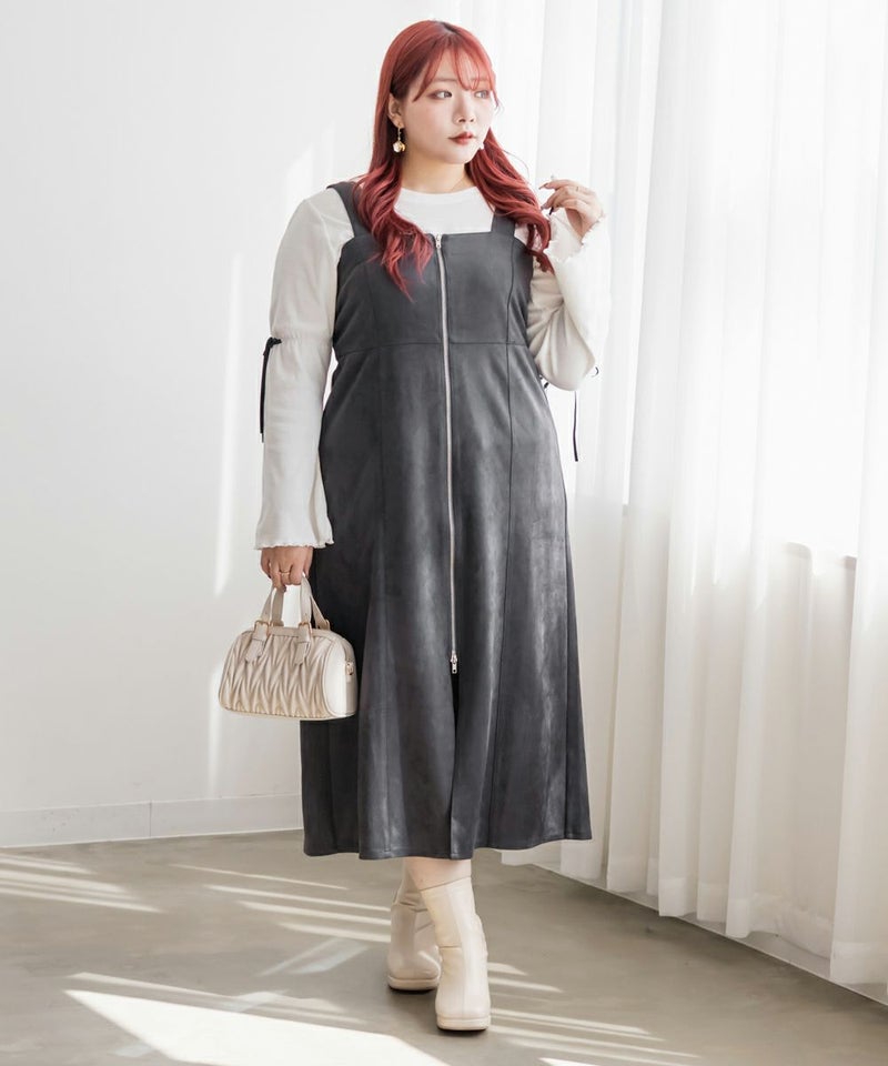 3Lサイズを着用してピッタリのサイズ感でした。やわらかいスエード調の生地で着心地ラクチンでした◎切り替え位置が高めなのでスタイルアップしてすっきりした印象で着ることができました!真ん中ジップデザインが縦のラインを強調してくれるのもポイントです!Iラインのワンピースだけど、タイト過ぎないシルエットなので、ボディラインも拾いにくいのが嬉しいです。インナー次第で様々な雰囲気になれるのでたくさん着回しできます♪