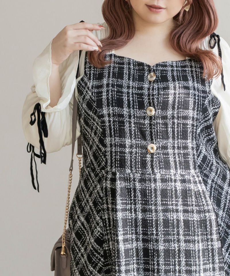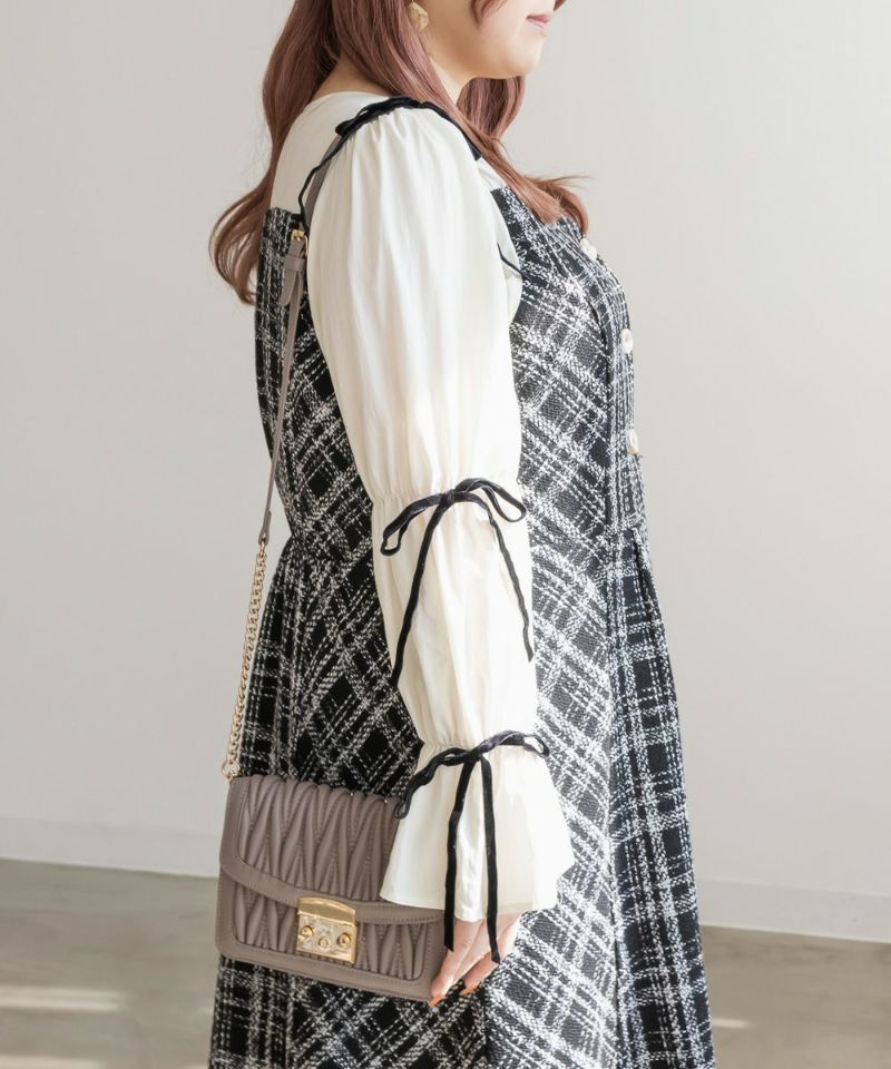3Lを着てちょうどいいサイズでした。しっかりとした生地だから、ボディランは全く拾いません◎後ろウエストはゴムだから着ている時も窮屈感はありませんでした。袖にはベロアのリボンがついていて細目で上品だから子供っぽくならない印象です。しかも袖がクシュっとしたデザインだから、二の腕がすっきり細く見えます!チェック柄が実はサイドだけ斜めになっていて、身体を細く見せてくれるのも嬉しいポイントです。お出かけやデートにたくさん着ていきたいです♪
