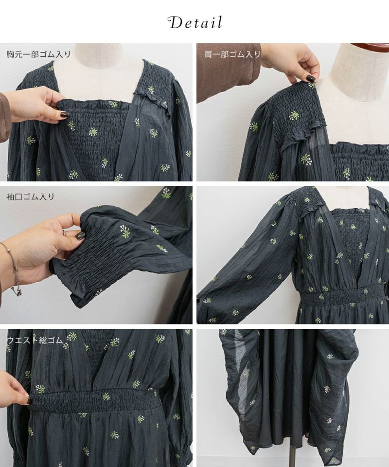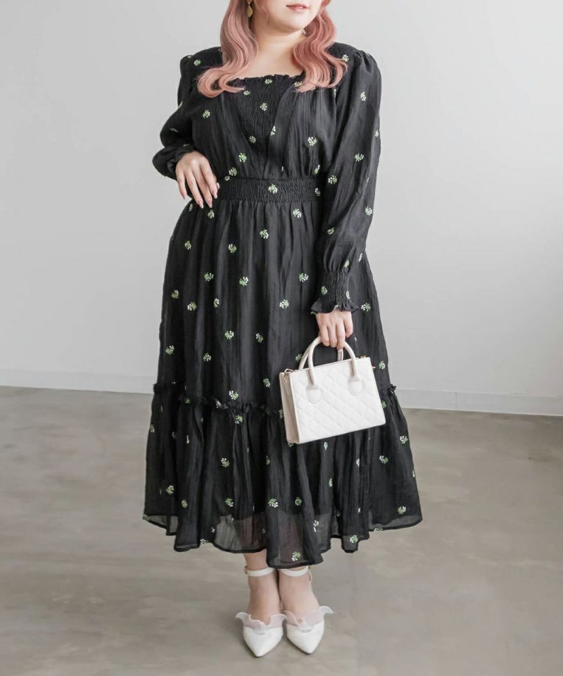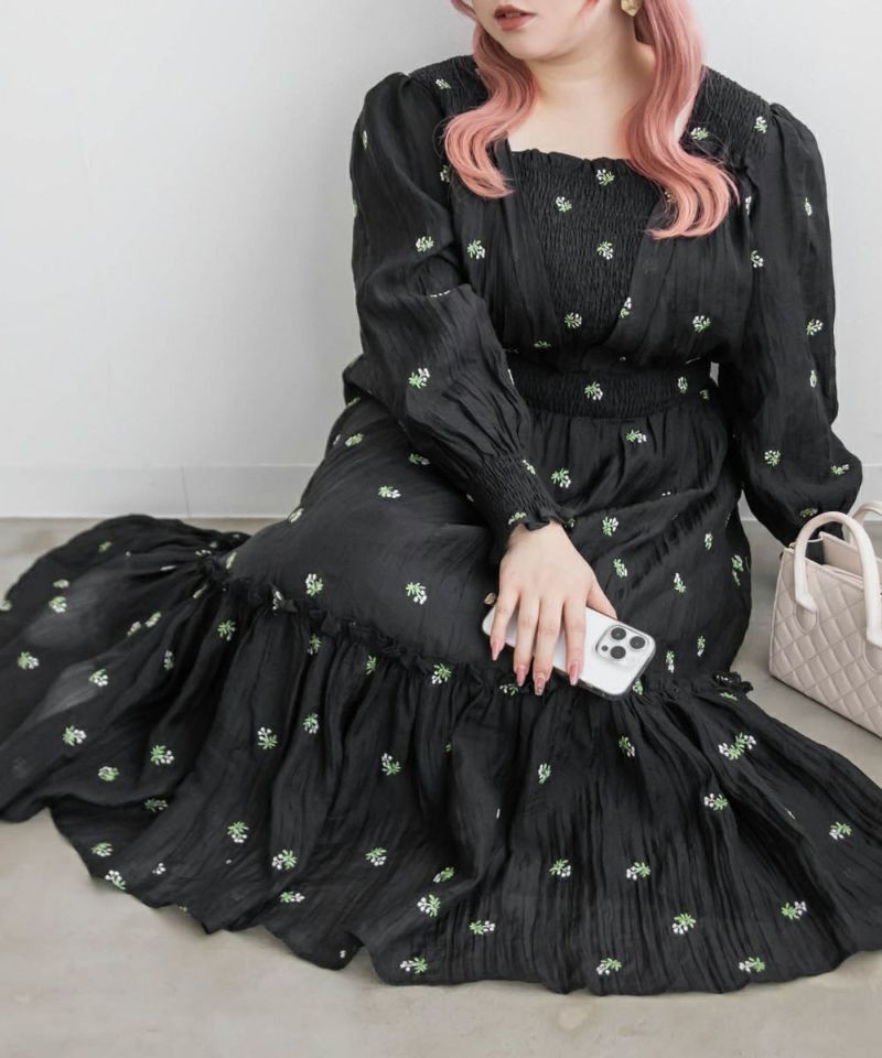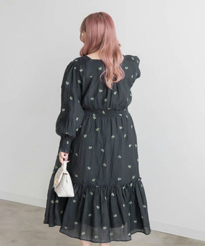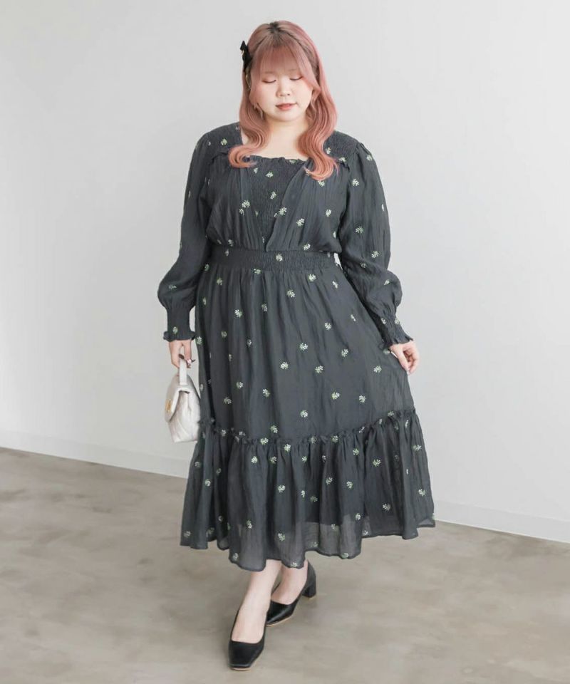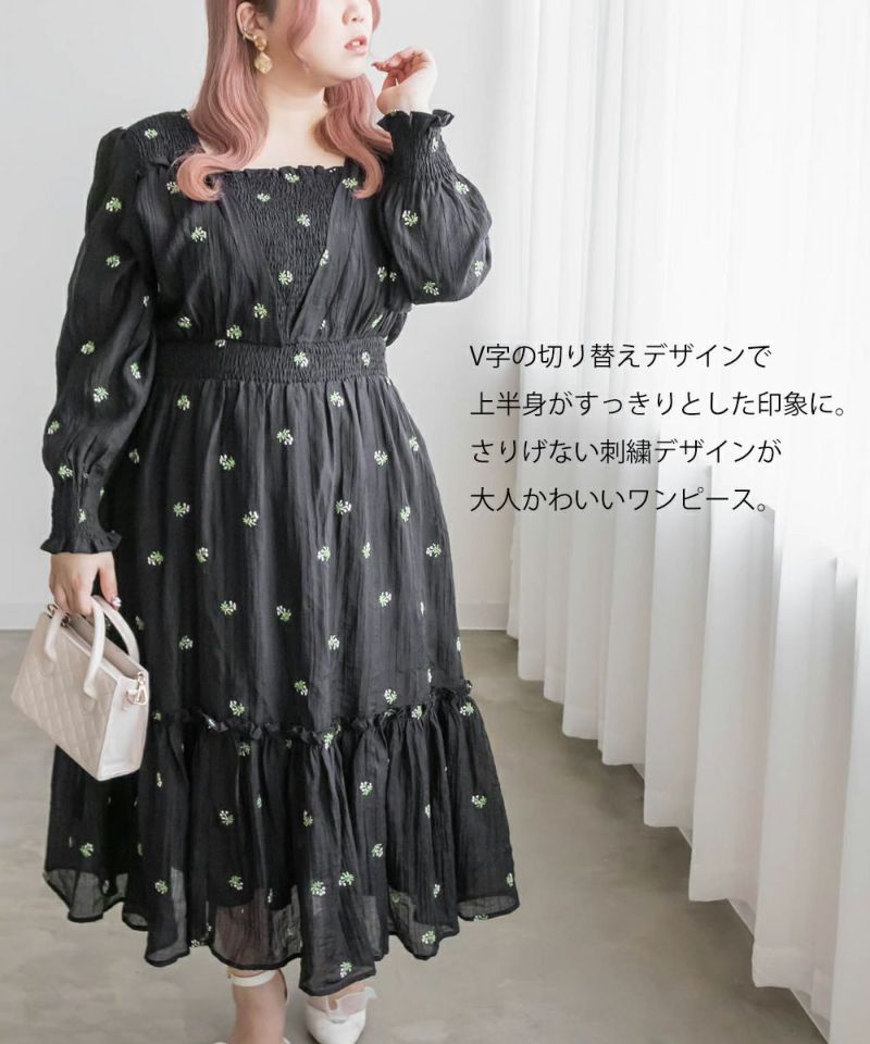 3Lを着てちょうどいいサイズでした。花柄の生地が派手ではないけど洗練されたデザインになっていて、細かいところまで可愛いです!胸元が見えないけれどすっきりとしたネックデザインがポイントでウエストシャーリングで着心地が楽なのも嬉しいです!大人っぽいけどフェミニンになれる、他にはないワンピースです♪