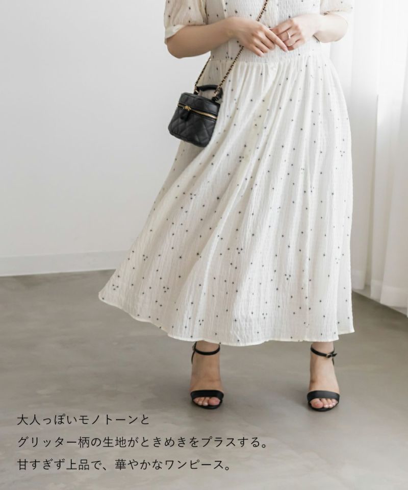 3Lサイズを着用して、全体的にちょうどいいサイズ感でした。ウエスト部分は後ろゴム仕様で、締めつけ感なくリラックスした着心地♪ふわっと広がるスカートと、グリッター柄の生地が華やかさをプラスしてくれるので、シンプルなワンピースながら着映え感抜群です!袖のボリュームも可愛くて、二の腕カバーにも◎1枚でお出かけ仕様になる、お気に入りになりそうな1着です!