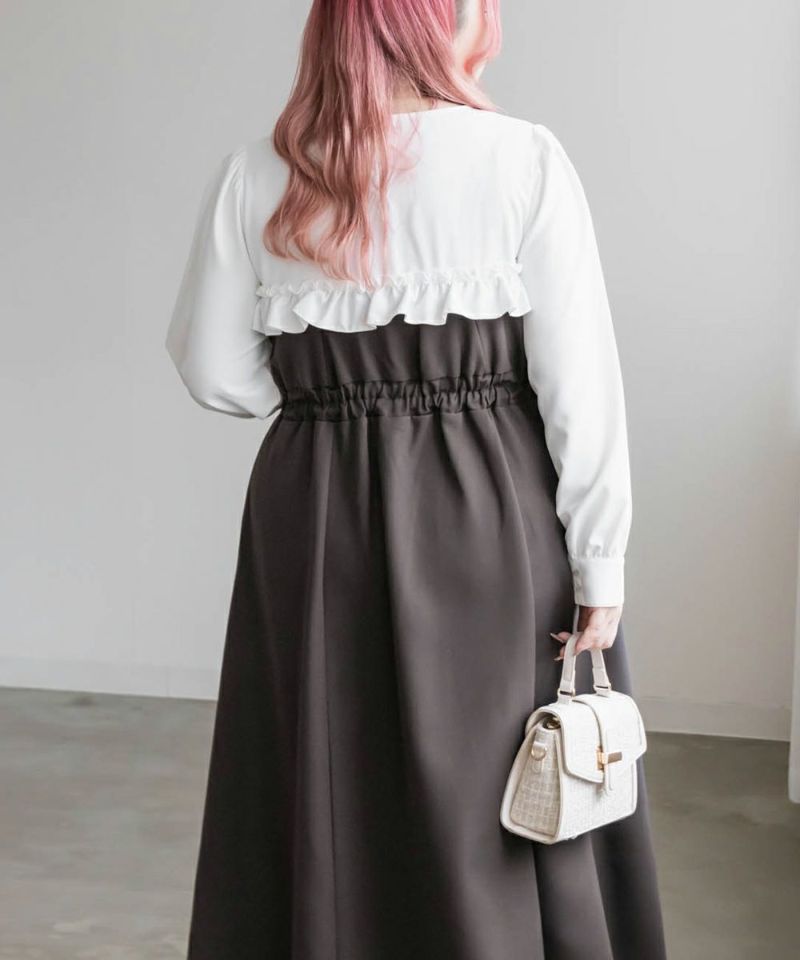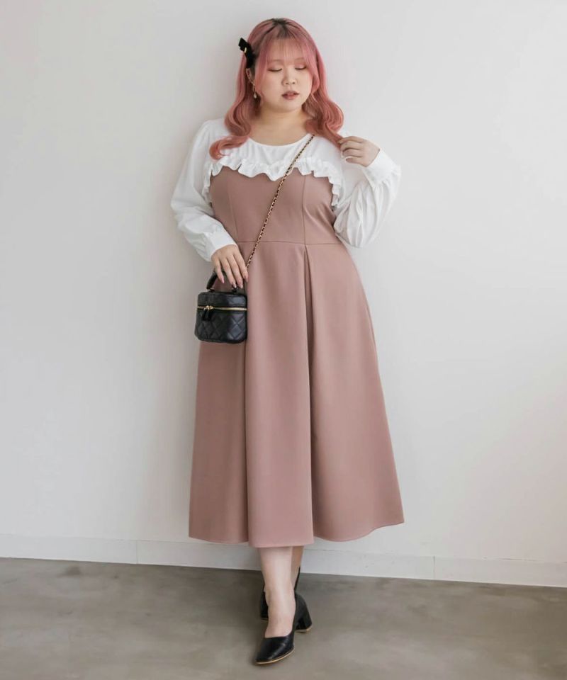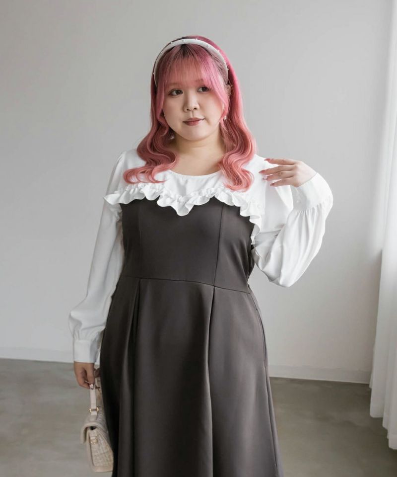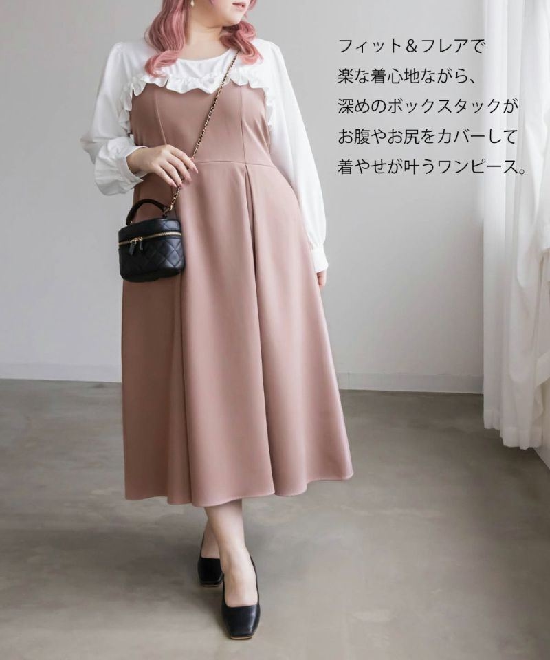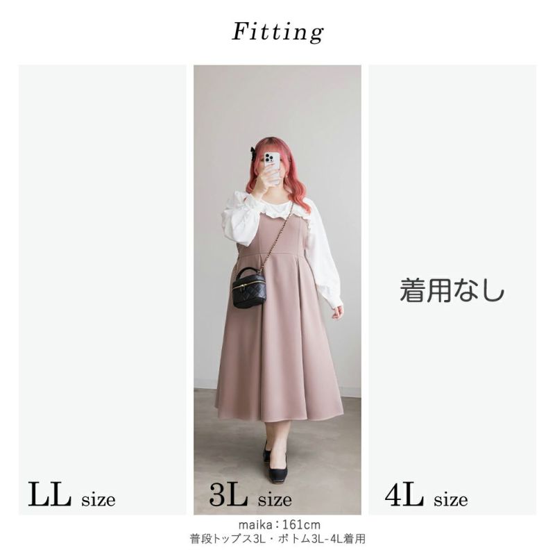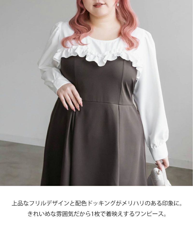 3Lサイズを着用してちょうどいいサイズ感でした。ウエストは後ろゴムなのと首回りも詰まっていないのでとっても楽ちんな着心地です!お腹やヒップはフレアに広がるスカート部分がしっかりカバーしてくれます!1枚でさらっと着られるけど、デザインが可愛いし、こなれた印象になれるワンピースです♪ドッキング切替になっていて、ブラウスを重ね着しているような着こなしになれます◎胸元のフリルが華やかで、女性らしく着こなせます!