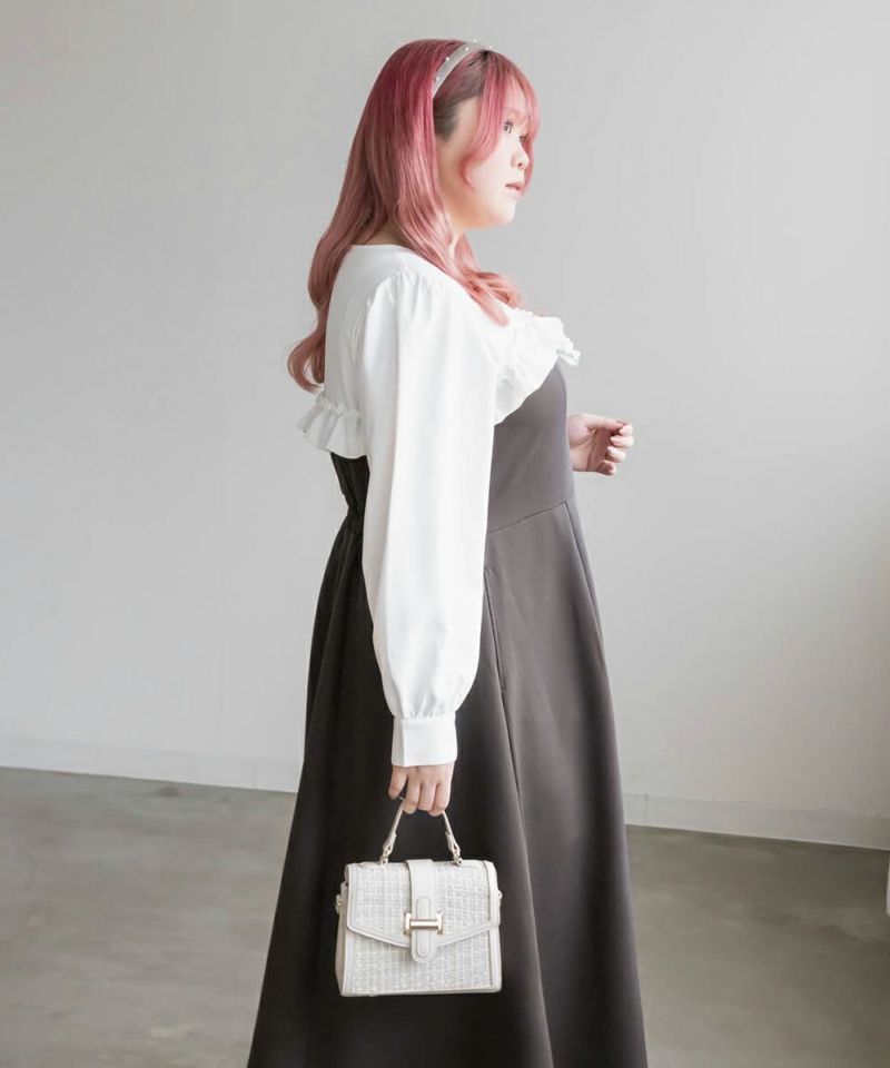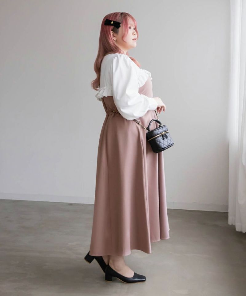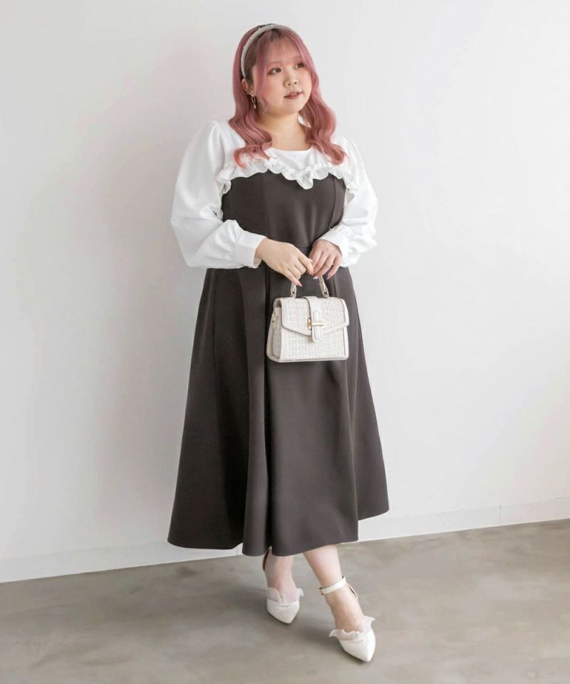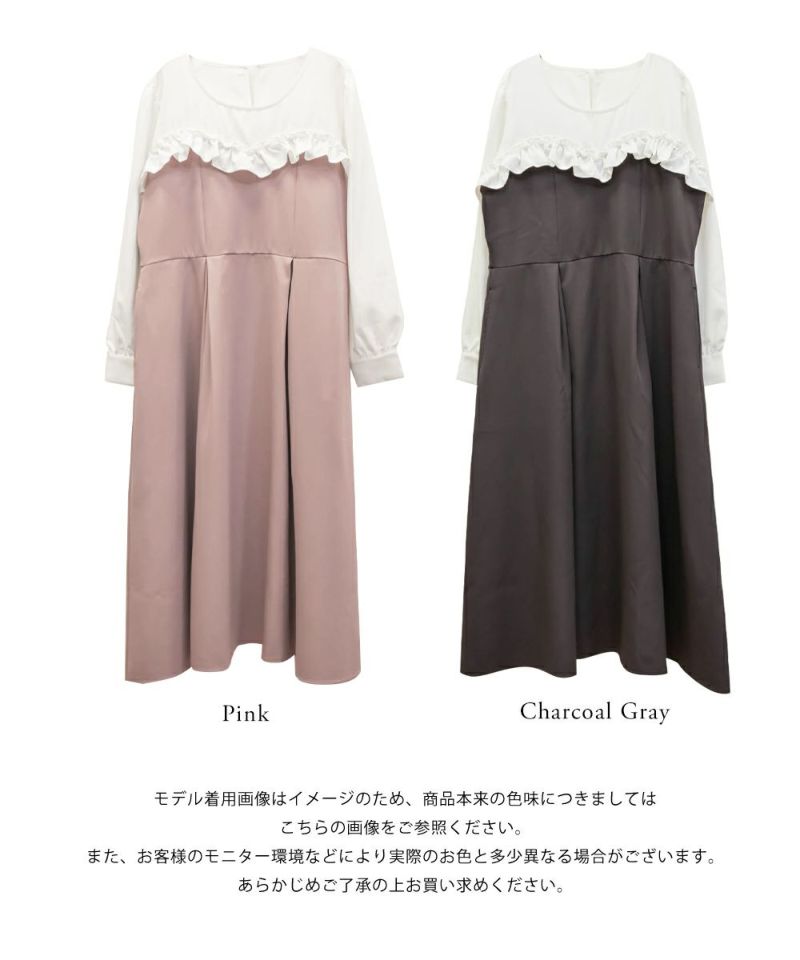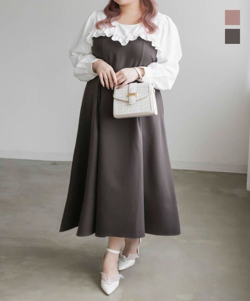 3Lサイズを着用してちょうどいいサイズ感でした。ウエストは後ろゴムなのと首回りも詰まっていないのでとっても楽ちんな着心地です!お腹やヒップはフレアに広がるスカート部分がしっかりカバーしてくれます!1枚でさらっと着られるけど、デザインが可愛いし、こなれた印象になれるワンピースです♪ドッキング切替になっていて、ブラウスを重ね着しているような着こなしになれます◎胸元のフリルが華やかで、女性らしく着こなせます!