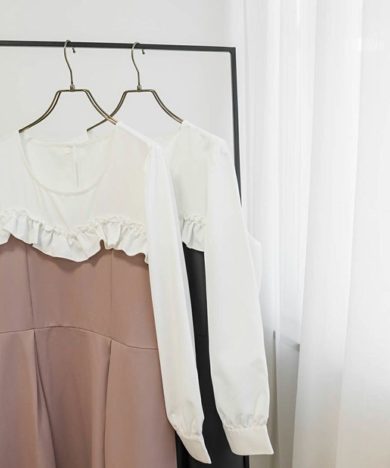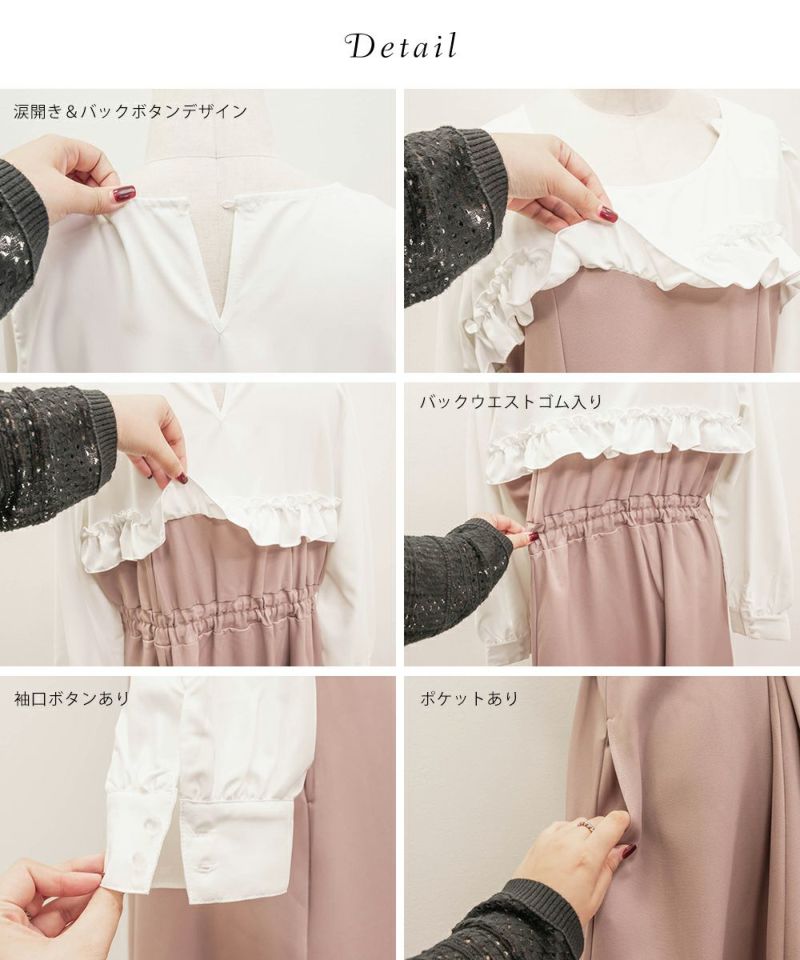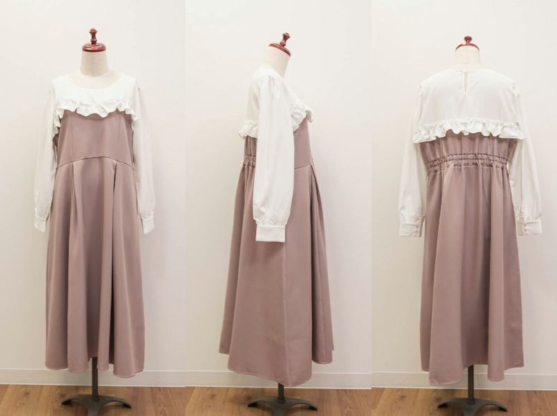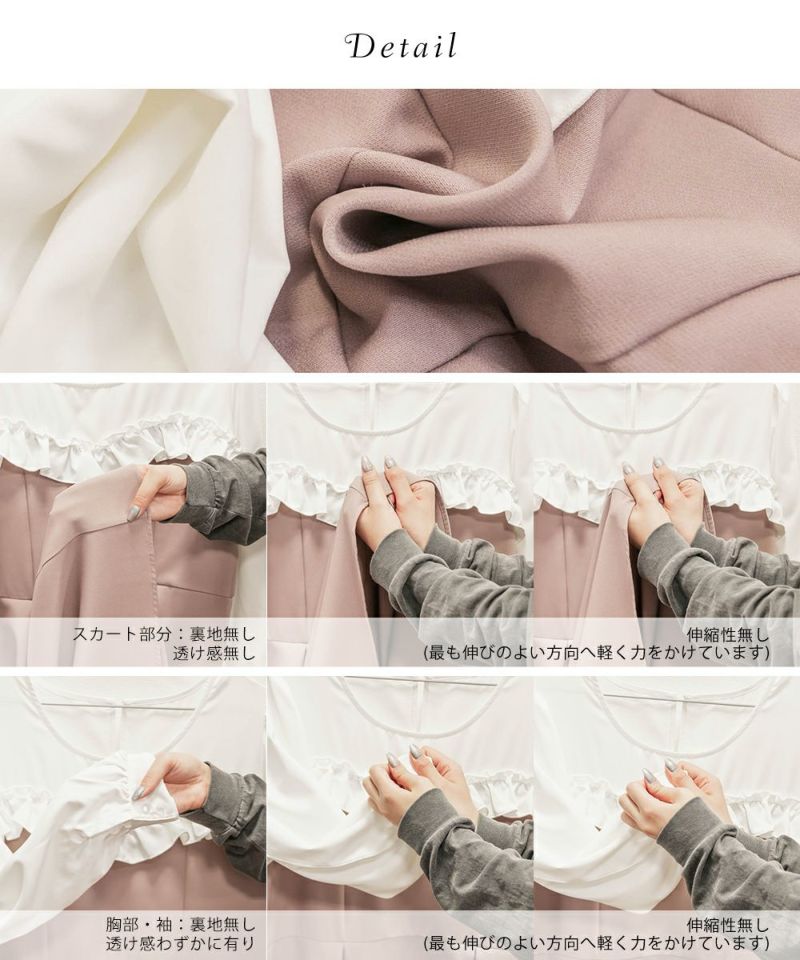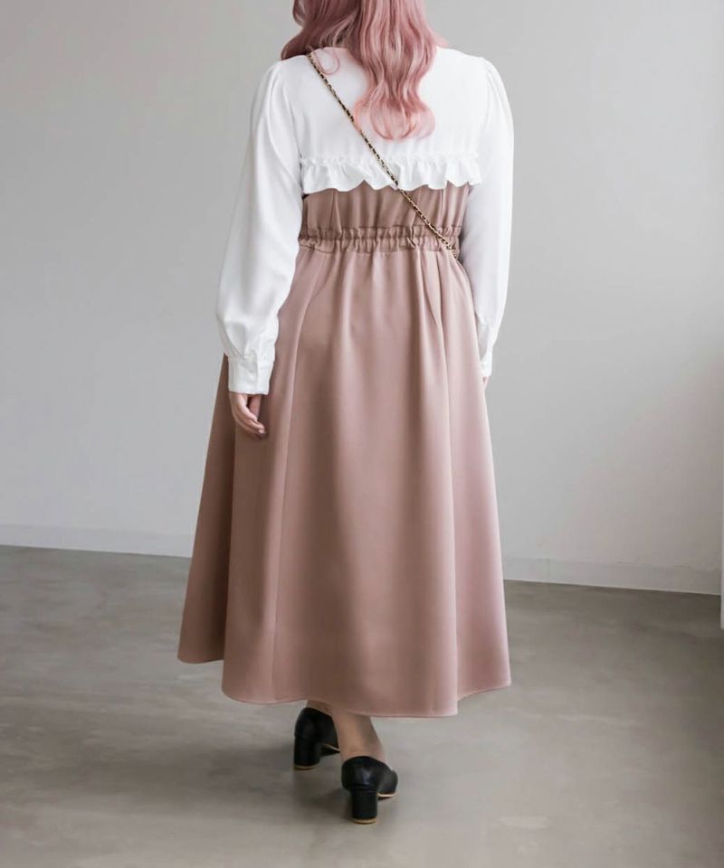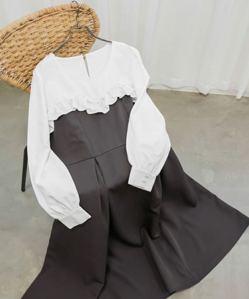 3Lサイズを着用してちょうどいいサイズ感でした。ウエストは後ろゴムなのと首回りも詰まっていないのでとっても楽ちんな着心地です!お腹やヒップはフレアに広がるスカート部分がしっかりカバーしてくれます!1枚でさらっと着られるけど、デザインが可愛いし、こなれた印象になれるワンピースです♪ドッキング切替になっていて、ブラウスを重ね着しているような着こなしになれます◎胸元のフリルが華やかで、女性らしく着こなせます!