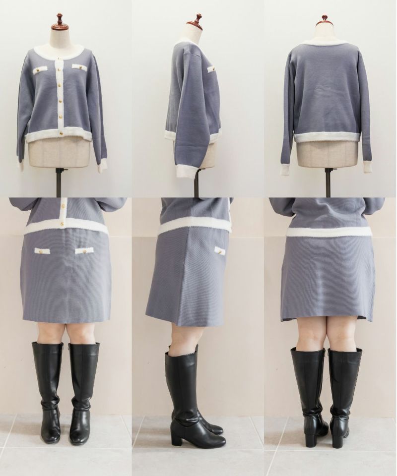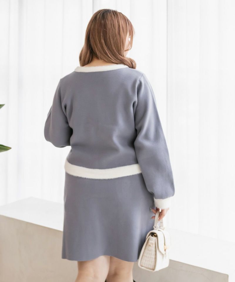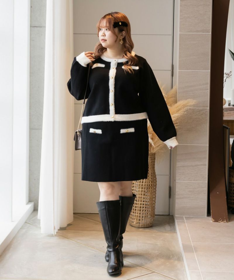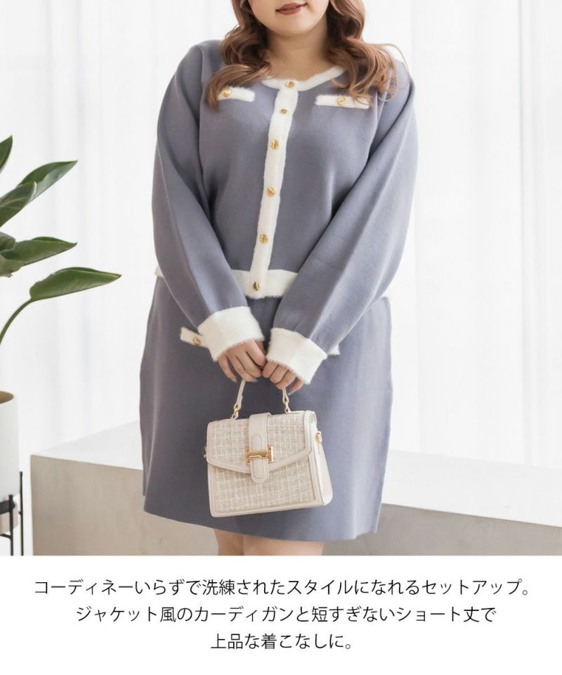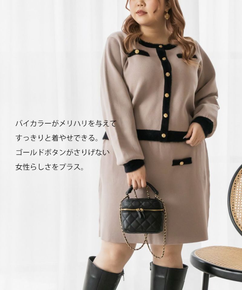 3Lサイズを着用してちょうどいいサイズ感でした。網目が詰まった高級感のあるニット素材になっているので、上品に着こなすことができます◎しっかりした素材感なのでボディラインも拾いづらいです!トップスはゆとりがありつつすっきりとコンパクトな印象に着られて、スカートはお腹やお尻のシルエットが出にくいように少しゆとりがありました!ニットはボディラインを拾いやすいイメージがありますが、このアイテムなら安心感して着ることができます。スカートもミニ丈になり過ぎずに上品な丈感です。ニットなので、伸縮性があって着心地が良いのも嬉しいです。配色がアクセントになって、全体的にすっきりとフェミニンに着こなせます!大きいサイズでこういったデザインは少ないので、いろんな方におすすめしたいセットアップです♪