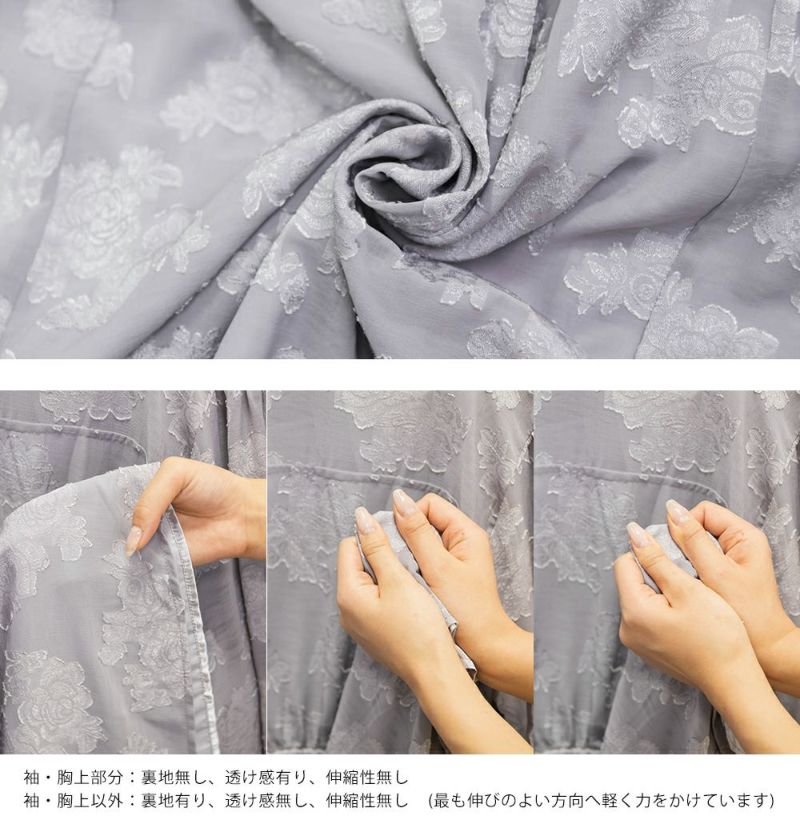 裏地・透け感・伸縮性 袖・胸上部分:裏地無し、透け感有り、伸縮性無し / 袖・胸上以外:裏地有り、透け感無し、伸縮性無し