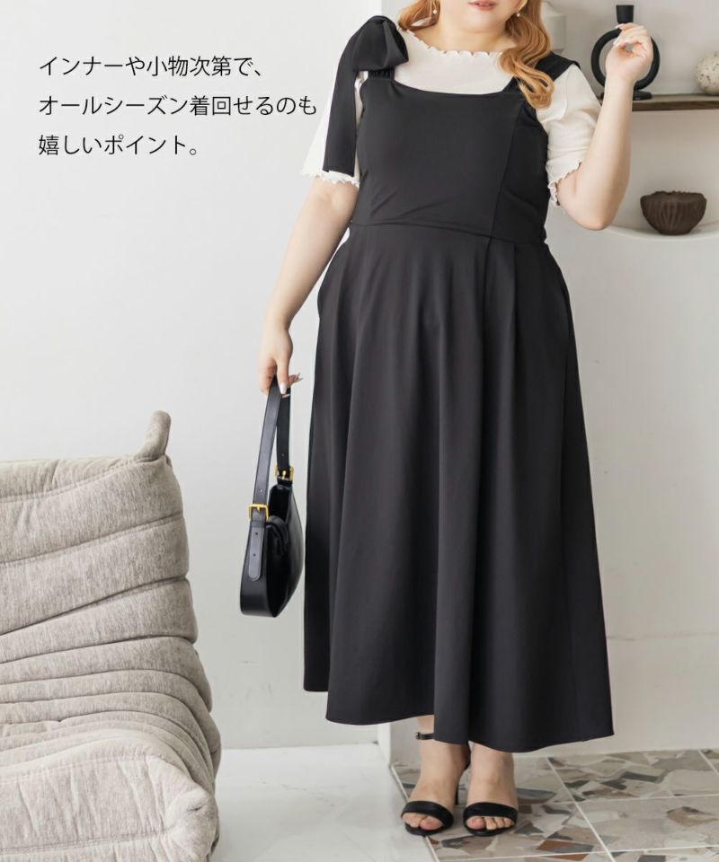 3Lサイズを着用しましたが、肩まわりやバストまわりも窮屈感なく、全体的にちょうどいいサイズ感でした◎生地に少しハリがあって、体のラインを拾いにくいのが嬉しいです!しっかり伸びもあるのでらくちんな着心地でした。肩のリボンがアクセントになっていて、甘くなりすぎず、さりげなく可愛さをプラスしてくれます。ノースリーブでも着用できるよう肩紐が隠せるデザインになっているのがポイントで、インナー次第でロングシーズン使えてたくさんの着回しが可能です♪