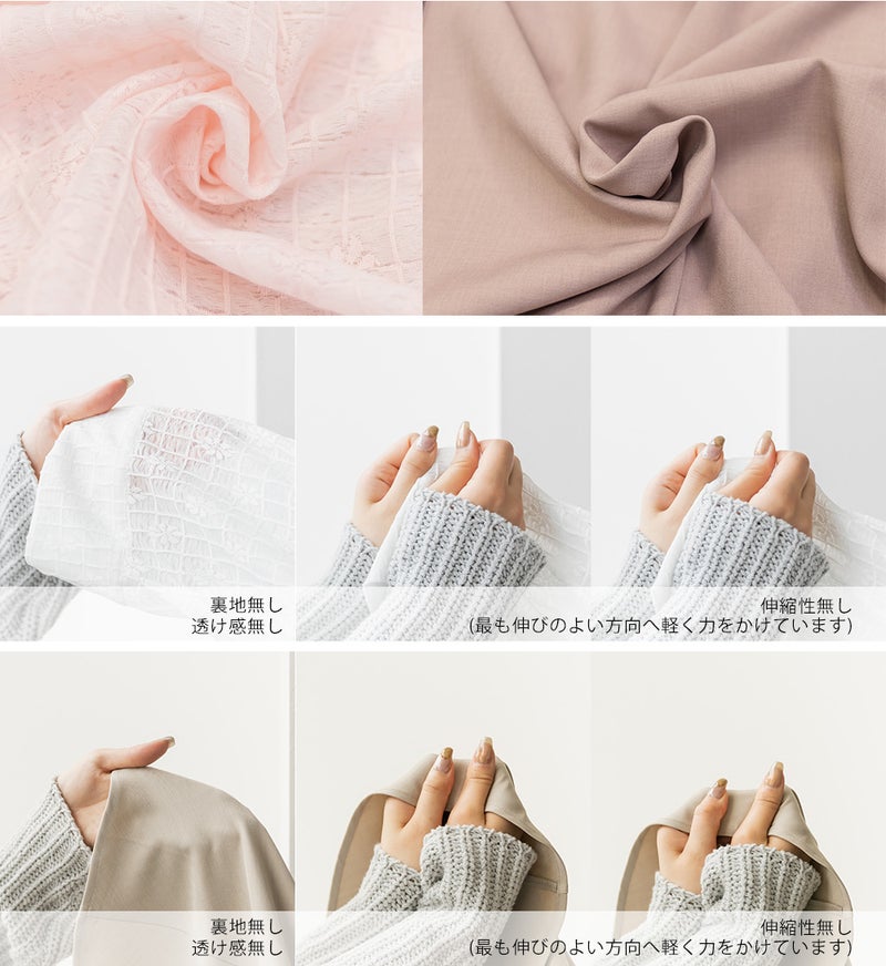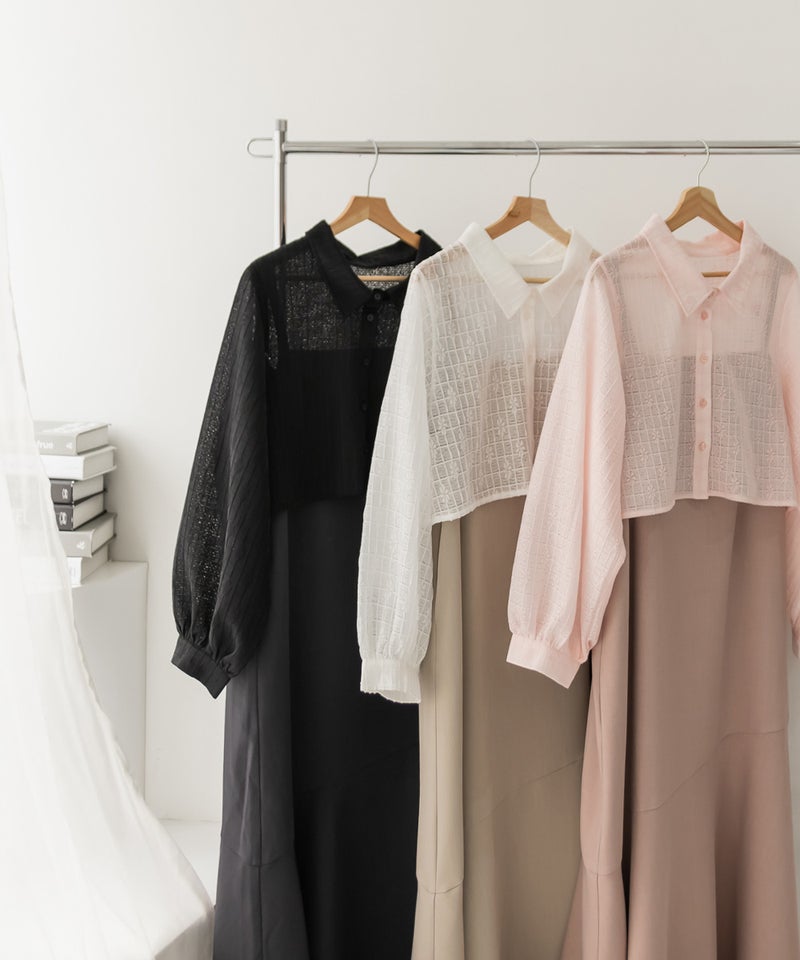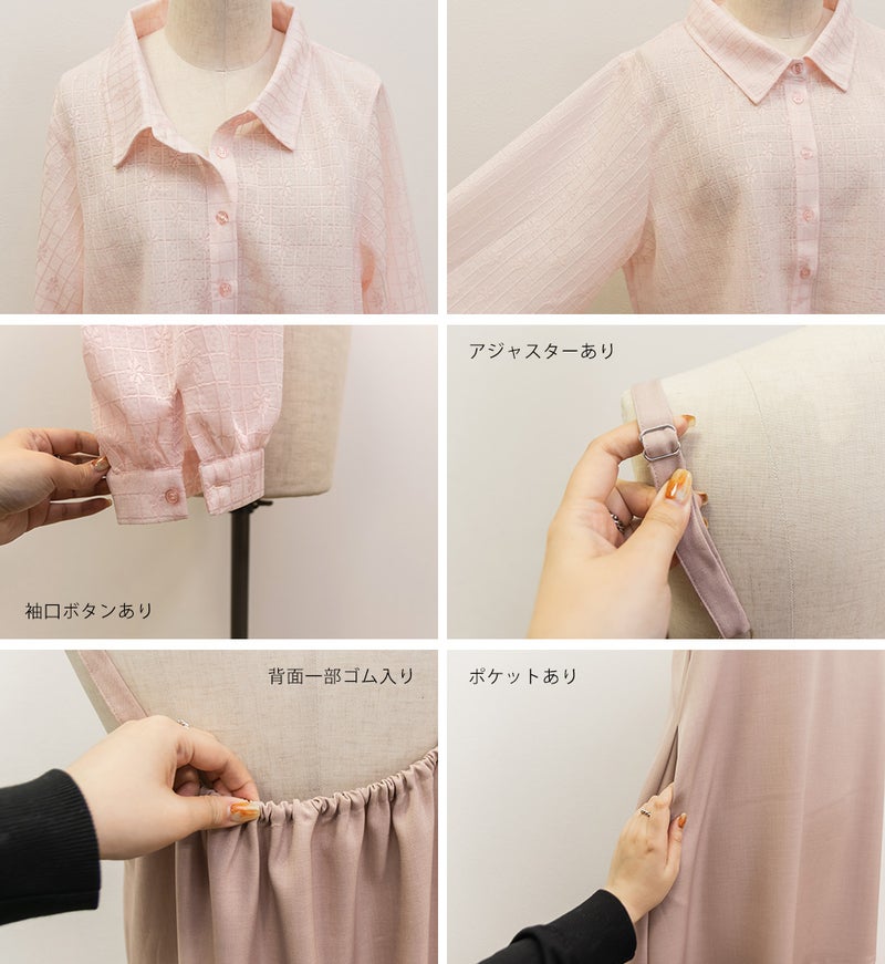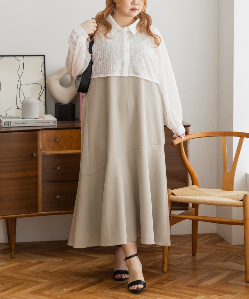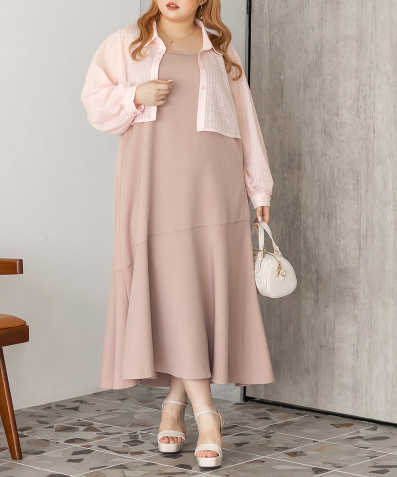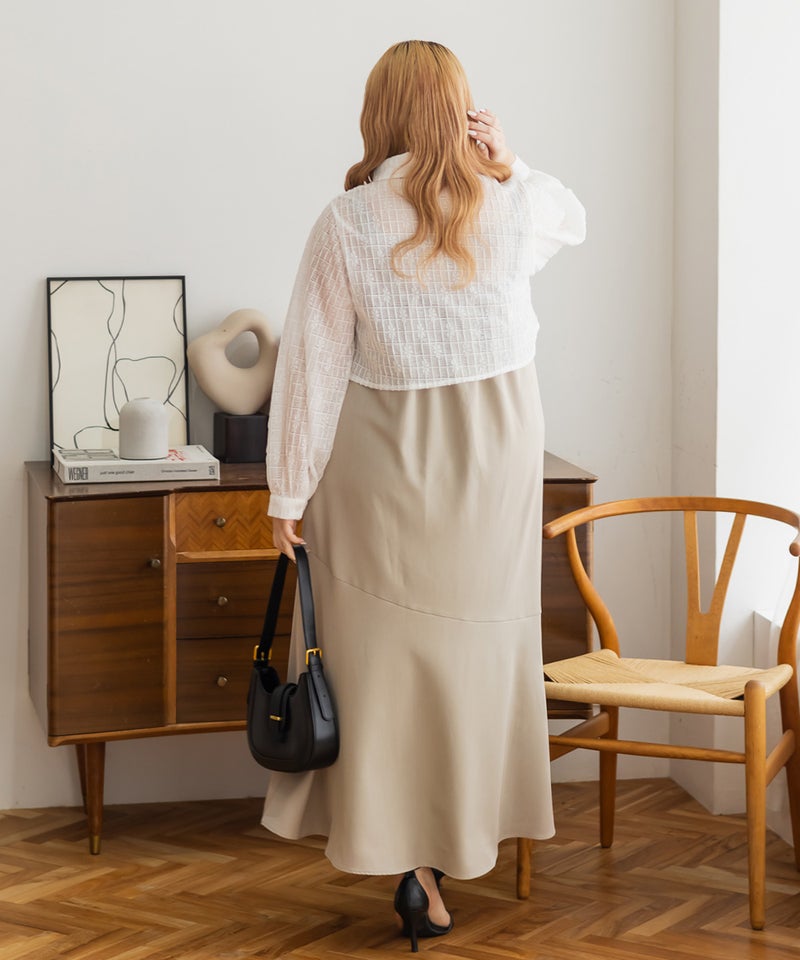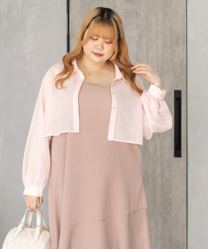 3Lを着て、ウエスト部分は締めつけ感がなく、程よくゆとりがありながらも、すっきりとしたシルエットなので、ちょうどいい着用感でした。レースシャツとワンピースのセットで着るだけでコーデが完成するのが嬉しいです◎ワンピースはストンと落ちるシルエットで、すっきりとした印象に見せてくれます。レースシャツは羽織るだけでこなれ感が出て、着こなしの幅が広がるのもポイントです。セットで着るのはもちろん、それぞれ単体でも使えて着回し力抜群です♪