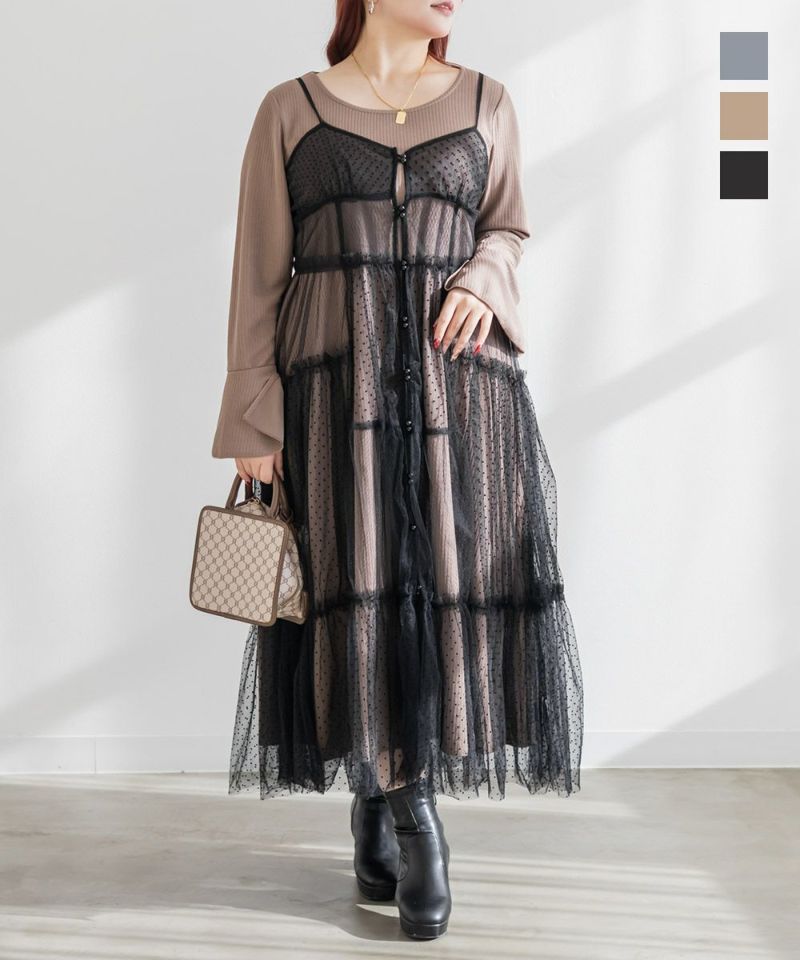 ダイヤ柄とドット柄のチュールをパッチワーク調に組み合わせたキャミワンピースに、インナーのリブワンピースもセットになったコーディネートいらずのアイテム。ふんわりとしたティアードシルエットのチュールは透け感が軽やかな風合い。
