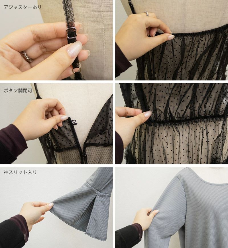 インナーワンピースは程よくしっかりとしたリブカットソー。キャミワンピースはダイヤ柄とドット柄の柔らかいチュール素材。真夏以外のロングシーズン着用可能な生地感です。