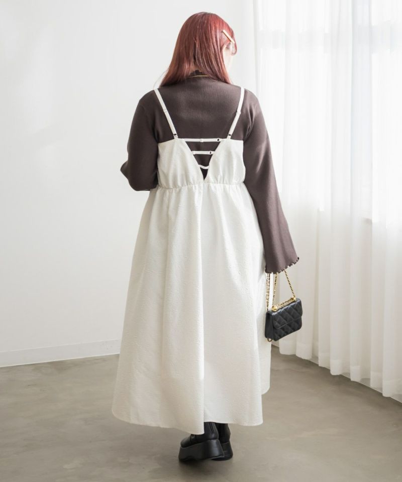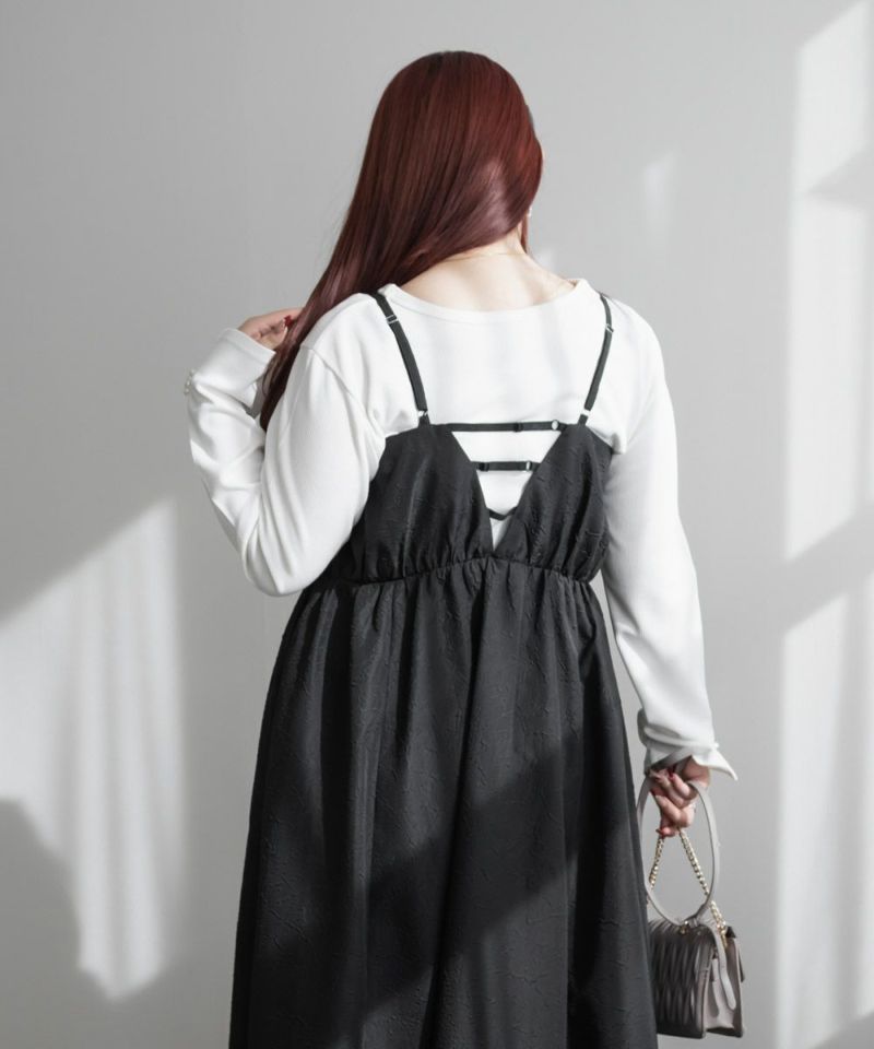 3Lサイズを着用して丁度いいサイズでした。気になる部分を隠してくれるから、気持ちも着心地もストレスフリーでした◎フロント部分はホックのデザインになっていて大人っぽい雰囲気で、甘くなりすぎずに今っぽい着こなしが完成します!凹凸のある生地感でボディラインをカバーしてくれます!後ろのデザインも可愛いので、ちょっと違った雰囲気でお洒落です!