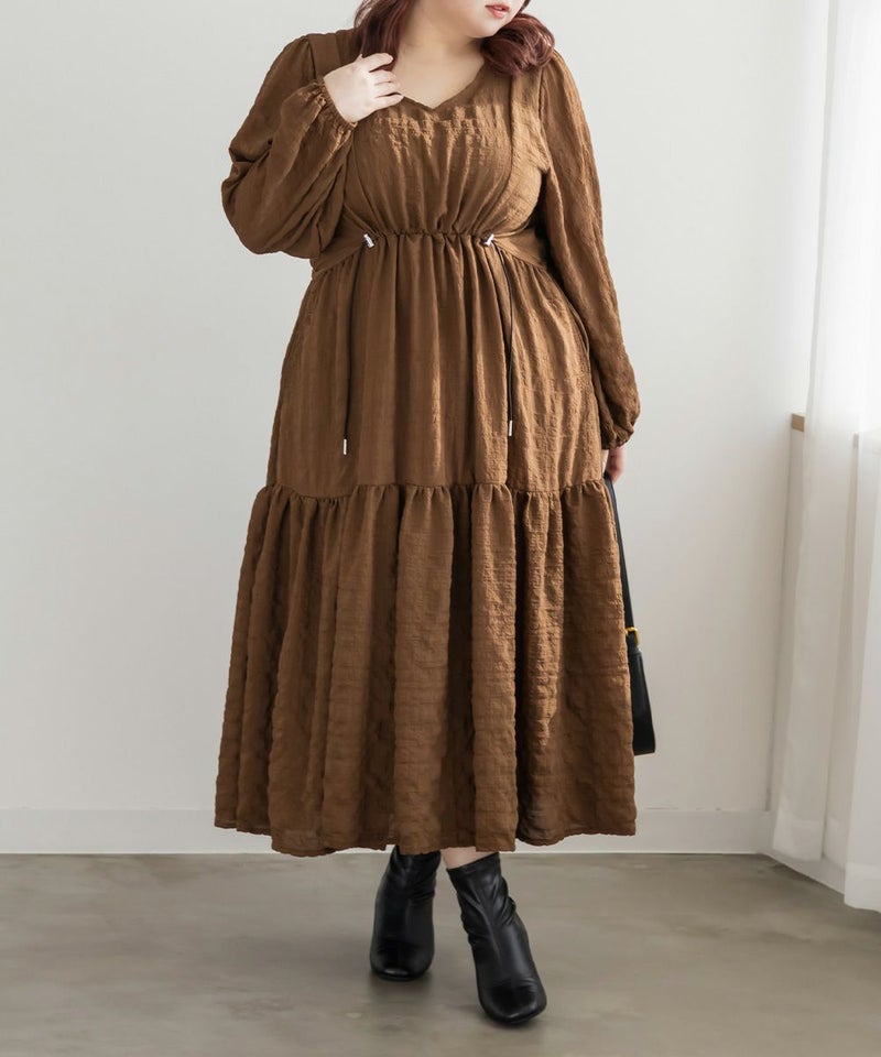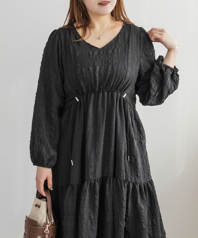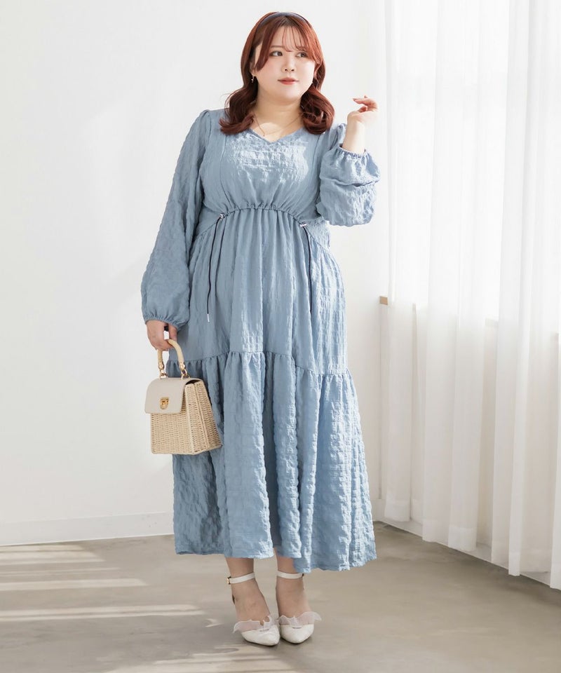 カジュアルになりすぎないスポーツミックスデザインなドロストワンピース。足を長く見せるカーブしたウエスト切替と、フレアに広がるシルエットで着やせできるデザイン。顔回りすっきりなVネックと二の腕カバーができるふんわりした袖デザインもポイント。