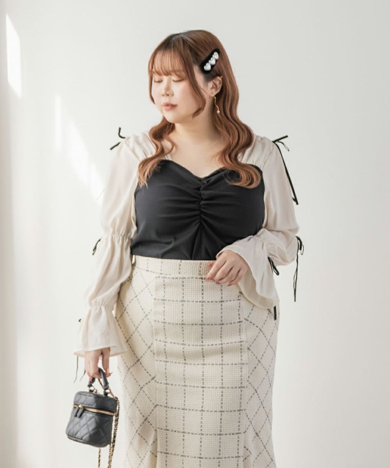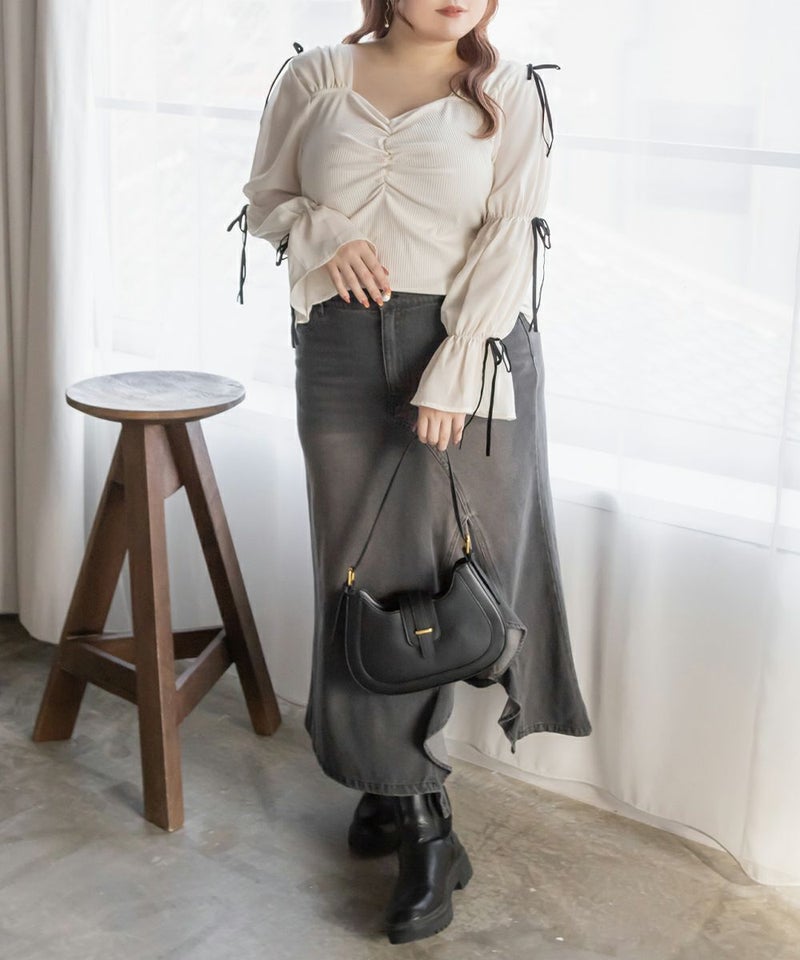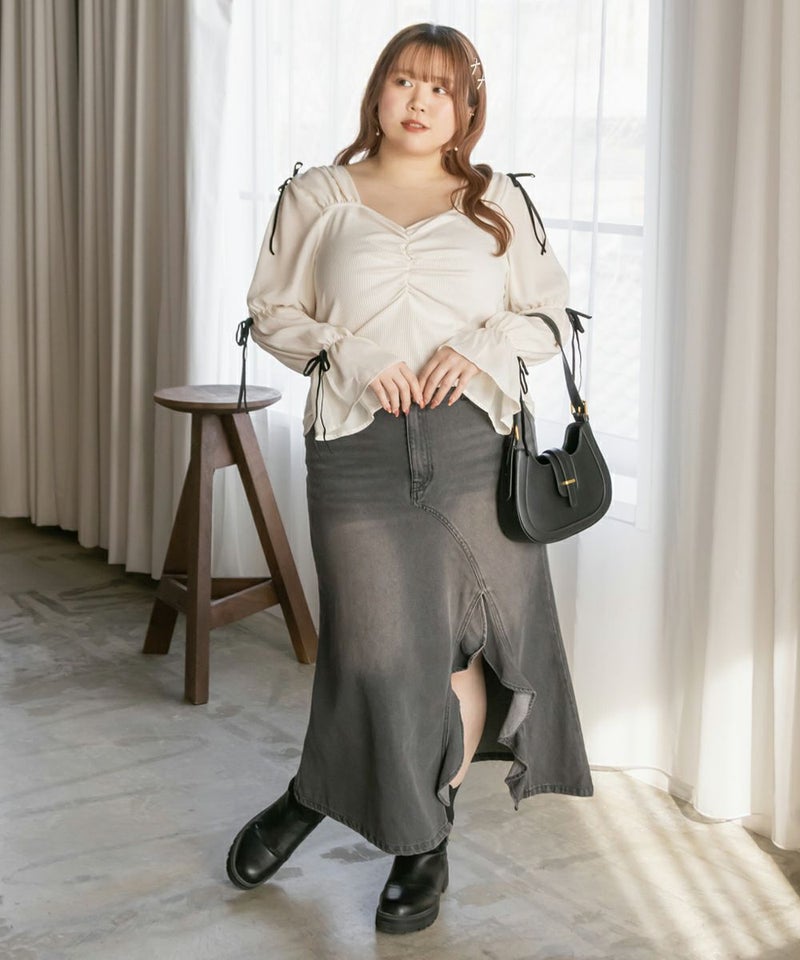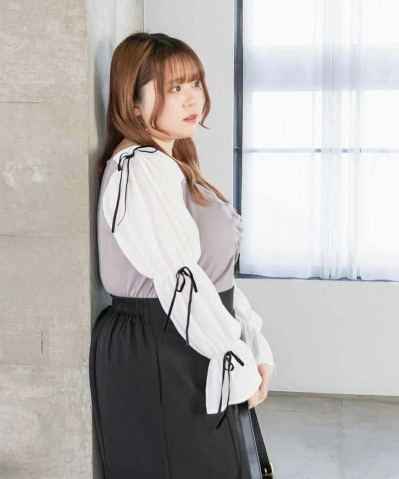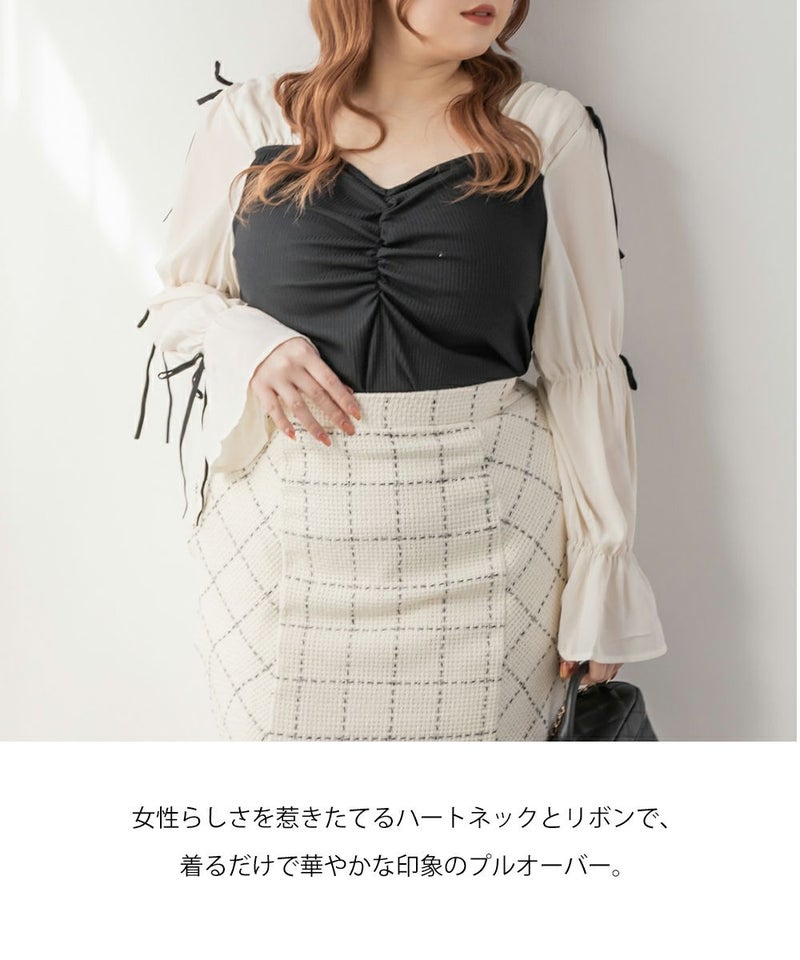 3Lサイズを着用してちょうどよい着心地でした。窮屈に感じるところがなくノンストレスでした。ネックラインはハートに開いていて、フェミニンで顔回りもすっきりとした印象で着られました◎見頃はらくちんなリブカットソーなのもポイント!なにより袖デザインが可愛くて1枚で華やかになれるプルオーバーです♪1枚で主役になるアイテムなのでシンプルなボトムとコーデしても華やかになれます!