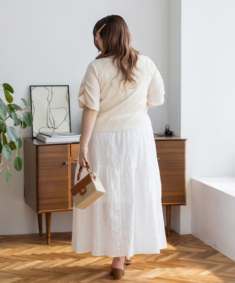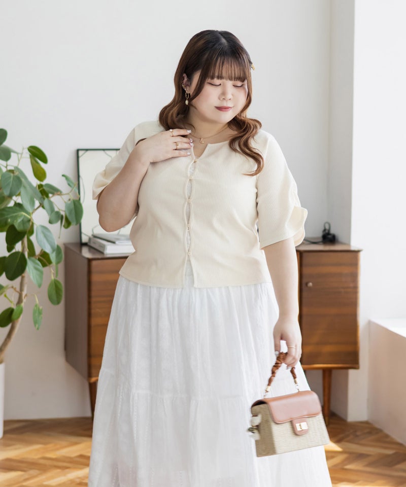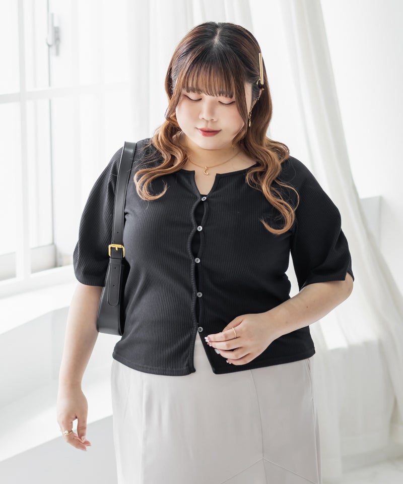 3Lを着て丁度良いサイズ感でした。程よくゆとりを持って着られるサイズ感で、締めつけ感もなく快適な着心地です。デコルテがすっきり開いたネックラインで、シンプルながらも着映えする1枚です!カットソー素材で伸縮性もあり、動きやすくてストレスフリーなのもうれしい◎さらっとしたリブ素材なので真夏でも過ごしやすいと思います♪スカートにもパンツにも合わせやすい丈感で、デイリーに活躍してくれそうです!前は開く仕様になっていて着脱も楽だし、羽織としても使えそうです!シンプルなボトムでも、デニムでも合わせやすくTシャツ感覚で着られる1枚です。