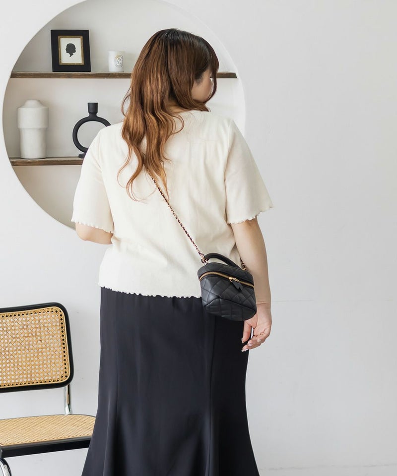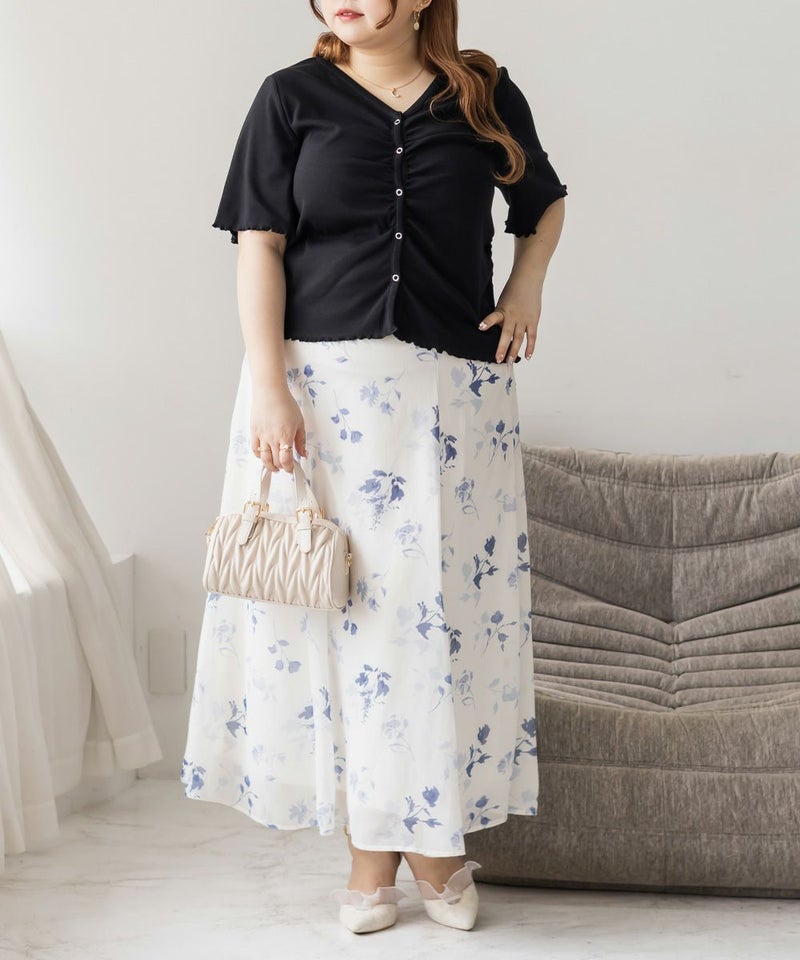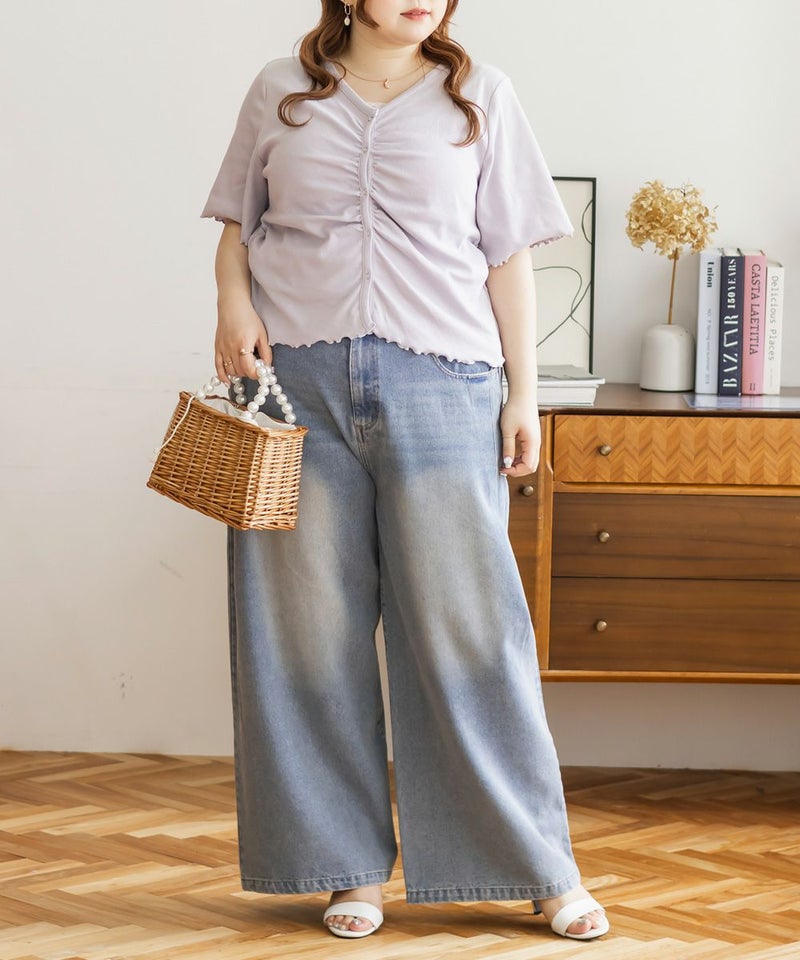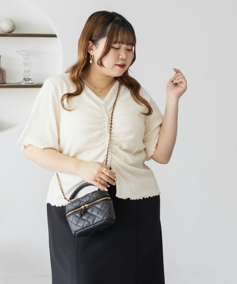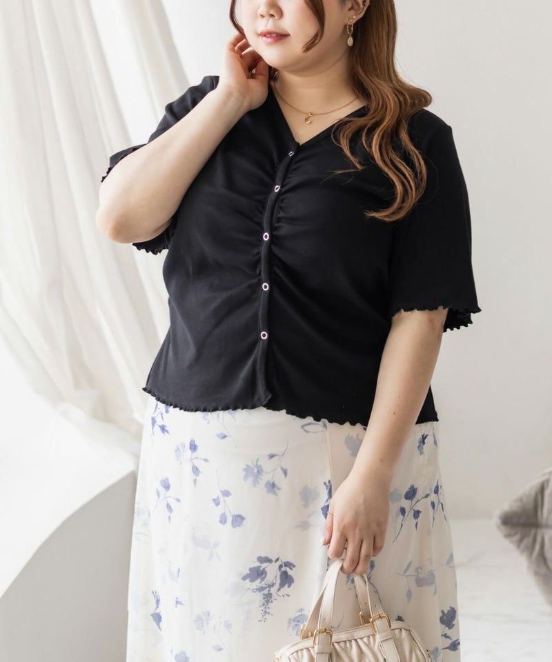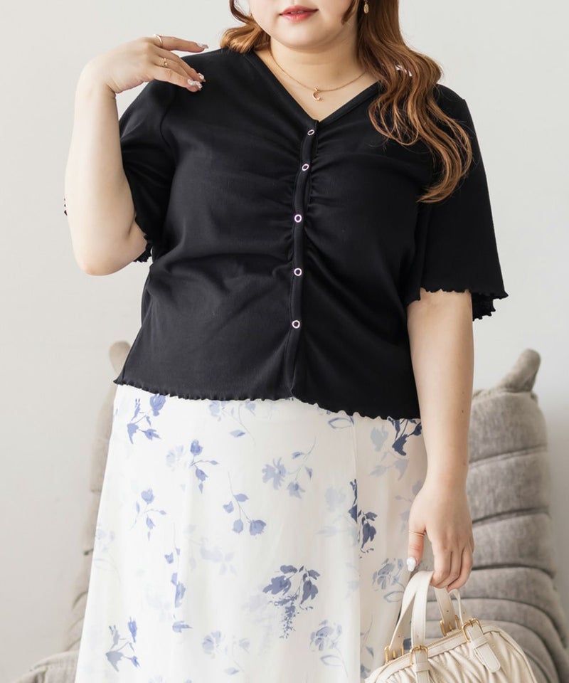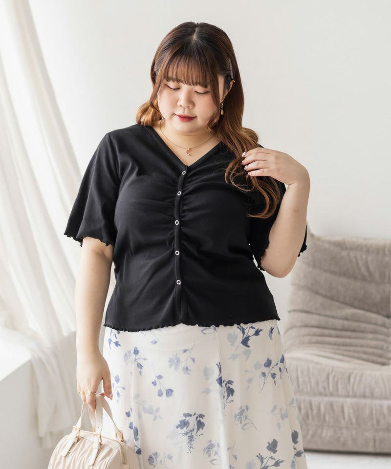 3Lを着て丁度良い着心地でした。ピタッとしすぎないシルエットで着心地抜群のトップスです。フロントのスナップボタンとギャザーがポイントで、着やせ効果も◎着丈も長すぎずちょうどいいので、インせずに着られるのも嬉しいです。前は開く仕様になっていて着脱も楽だし、羽織としても使えそうです!シンプルなボトムでも、デニムでも合わせやすくTシャツ感覚で着られる1枚です。