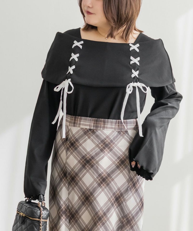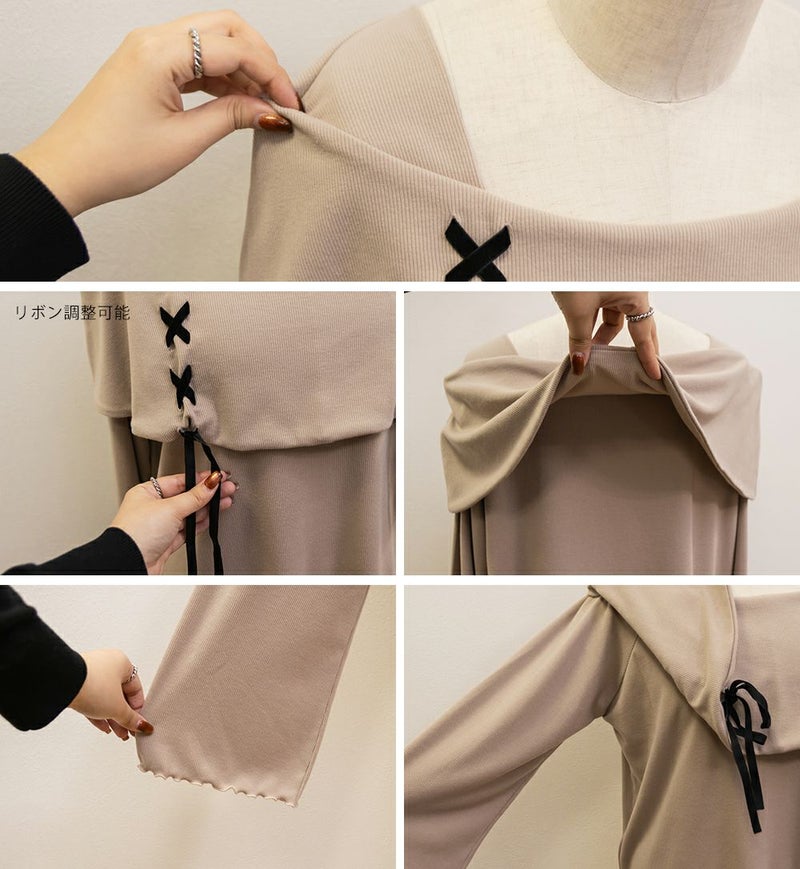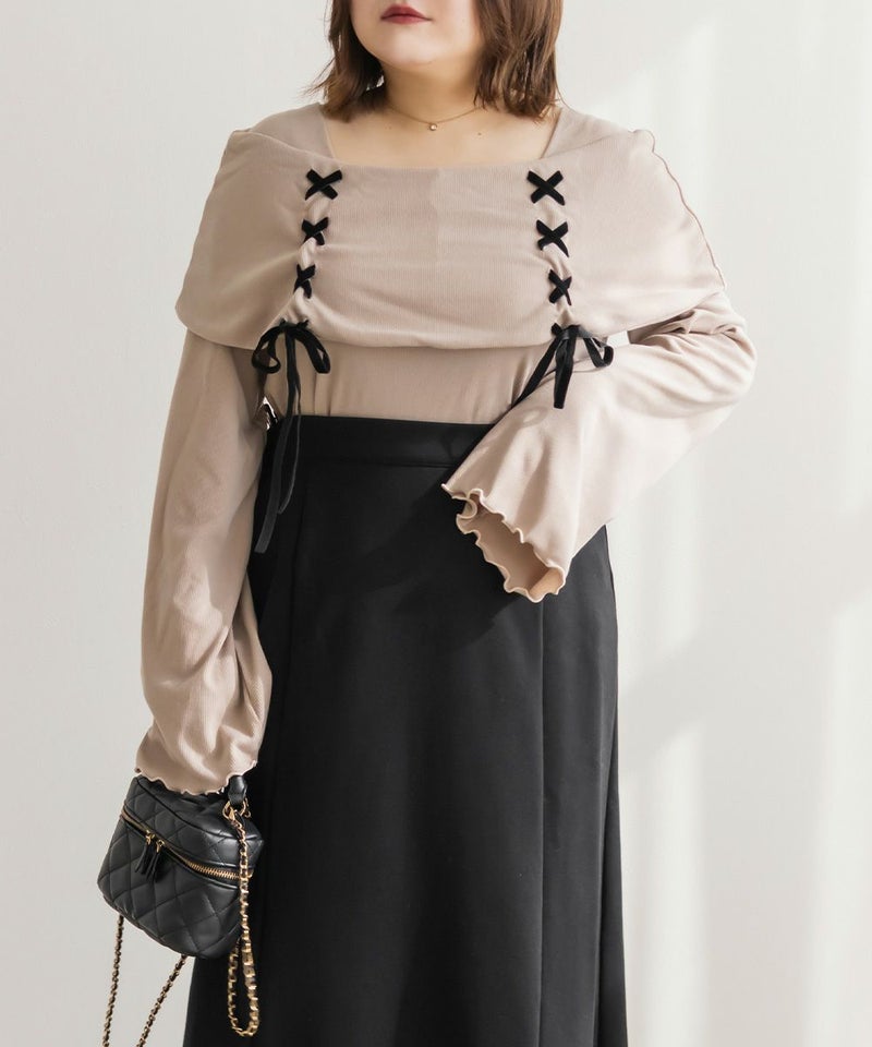 LLを着用してちょうどいいサイズ感でした。ネック回りが綺麗に開きながら、下着の肩紐が見えないようなデザインになっているのがポイントでインナーに困らないのが嬉しい!オフショルは苦手だけど女性らしいデザインを探している方におすすめです♪レースアップのリボンがアクセントになっていて、メリハリのあるすっきりとした印象になれます!袖もフレアに広がっていて女性らしさたっぷりで手元もおしゃれで可愛い◎丈はタックインせずに着られるのでパンツともスカートも相性のいい1枚持っておきたいトップスです!