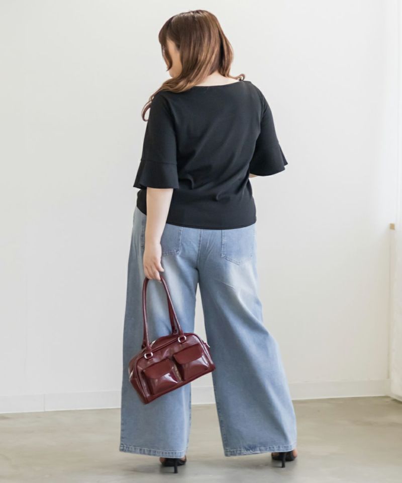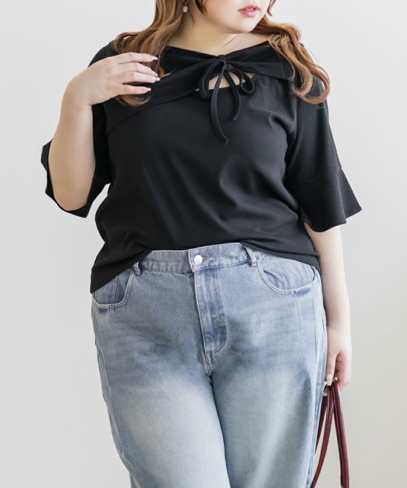 クレット 大きいサイズ プラスサイズ カットソー リブ トップス Tシャツ 肌見せ フレア袖 CLETTEオリジナル★デコルテノットリボンプルオーバー
