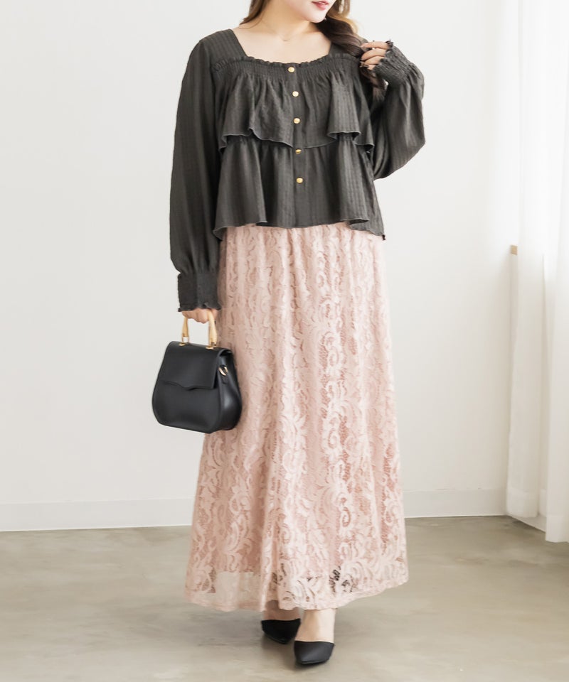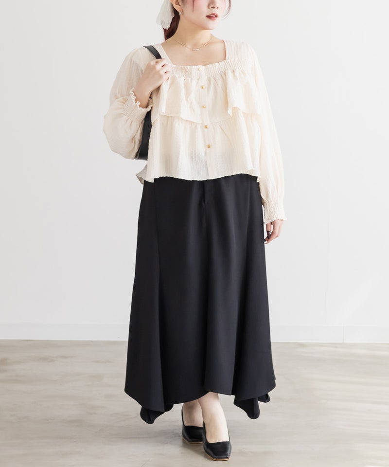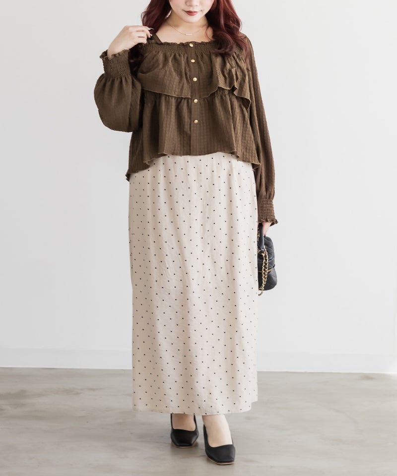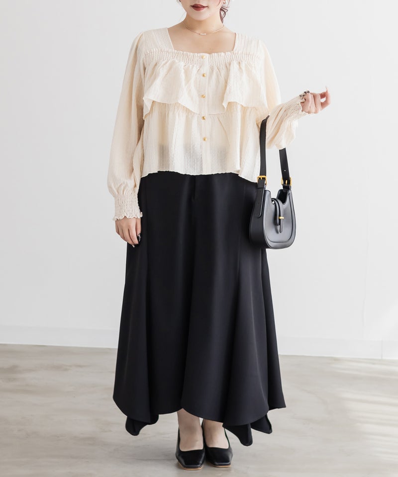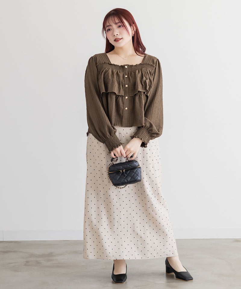 3Lサイズを着用して程よくゆとりを持って着られました!ピタッとせずに着られて、軽くてらくちん◎デコルテを綺麗に見せるスクエアネックと、メリハリのあるボタンデザインですっきり着やせした印象になれました♪生地自体も可愛いし、長袖なのでロングシーズン活躍します!デニムやスカート、どちらにも合わせやすくて、シンプルすぎず大人かわいく着こなせます!