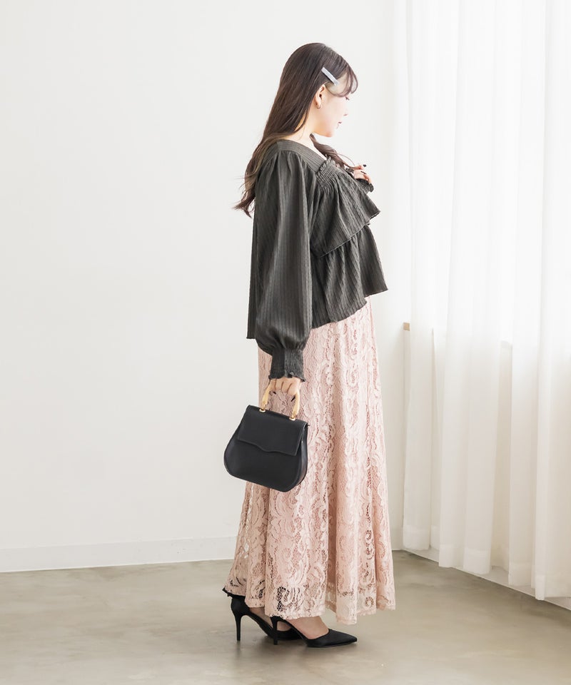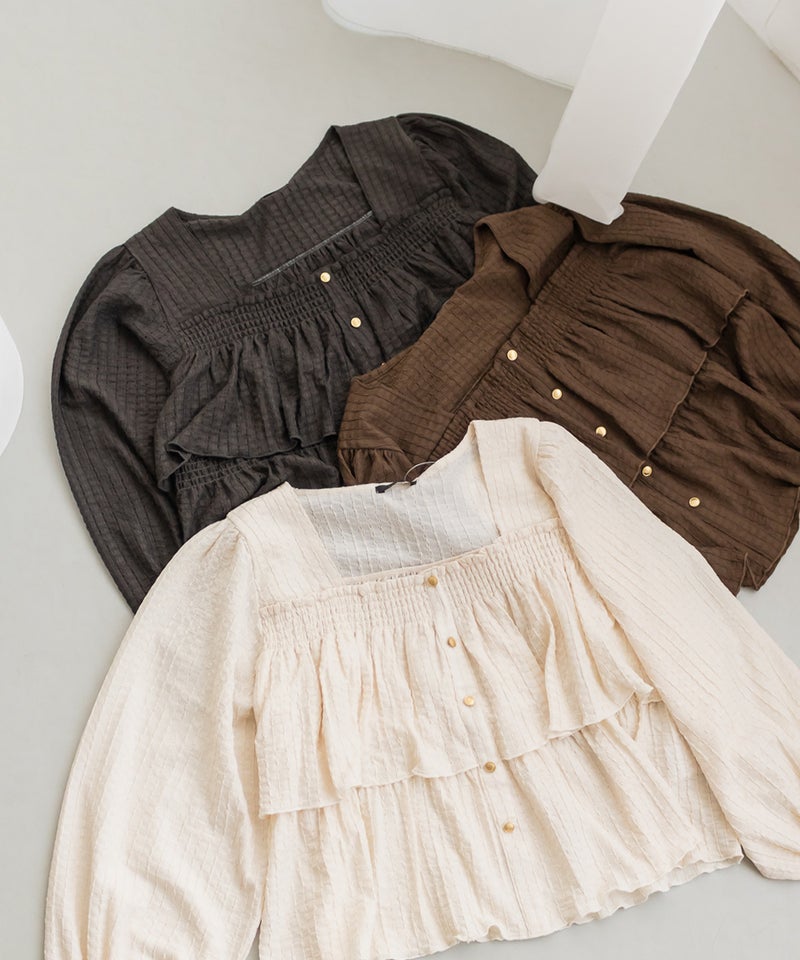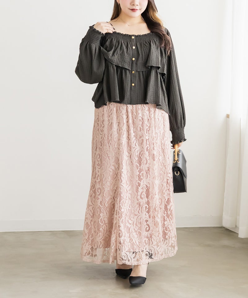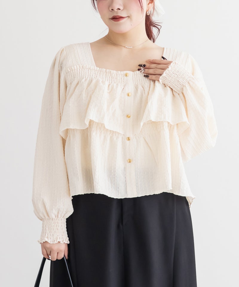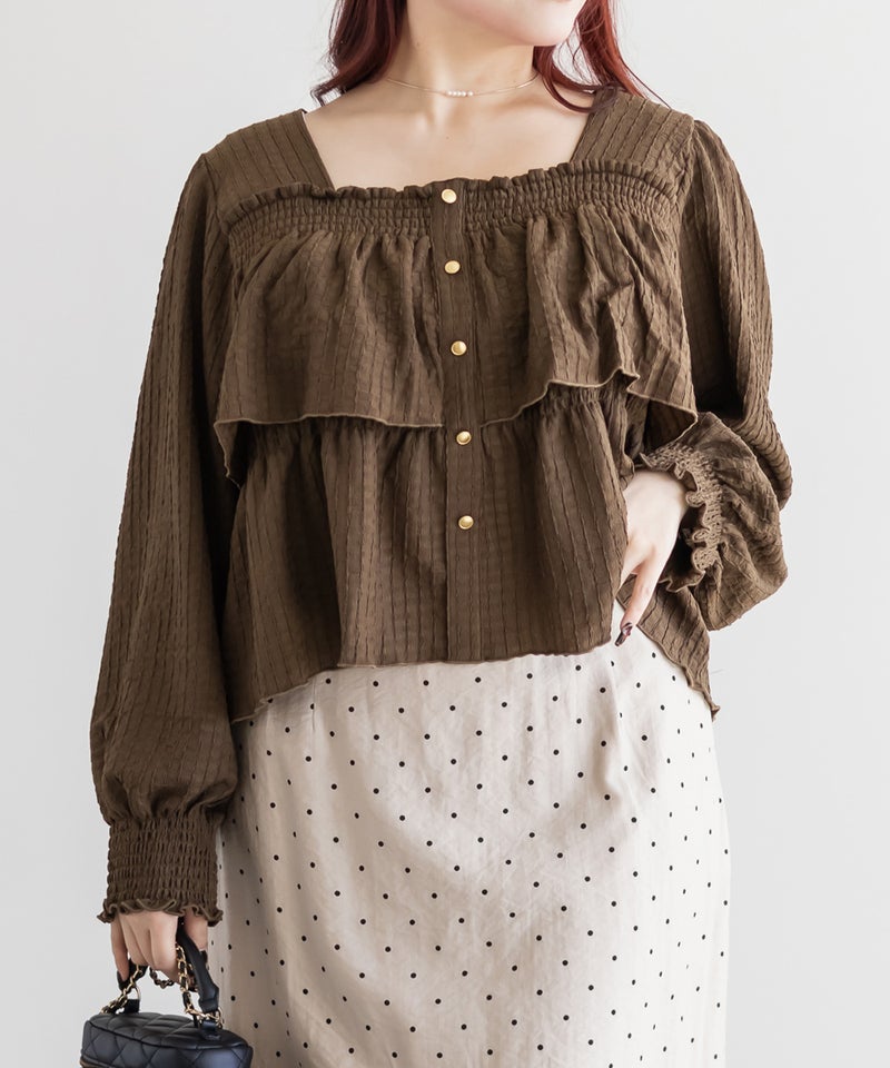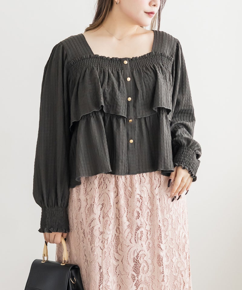3Lサイズを着用して程よくゆとりを持って着られました!ピタッとせずに着られて、軽くてらくちん◎デコルテを綺麗に見せるスクエアネックと、メリハリのあるボタンデザインですっきり着やせした印象になれました♪生地自体も可愛いし、長袖なのでロングシーズン活躍します!デニムやスカート、どちらにも合わせやすくて、シンプルすぎず大人かわいく着こなせます!