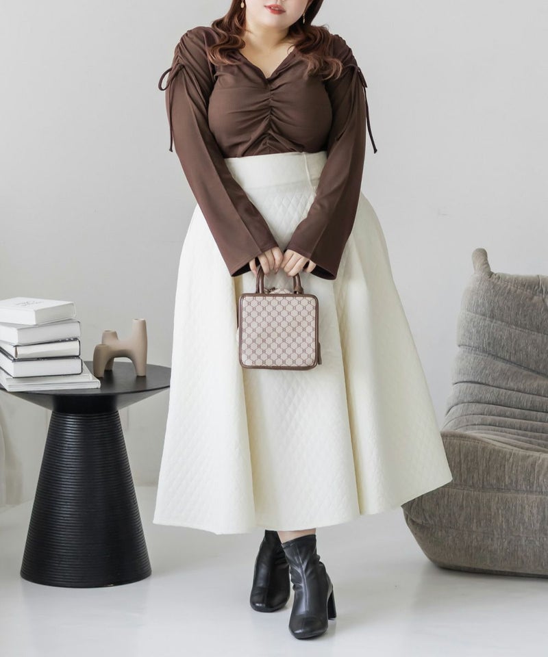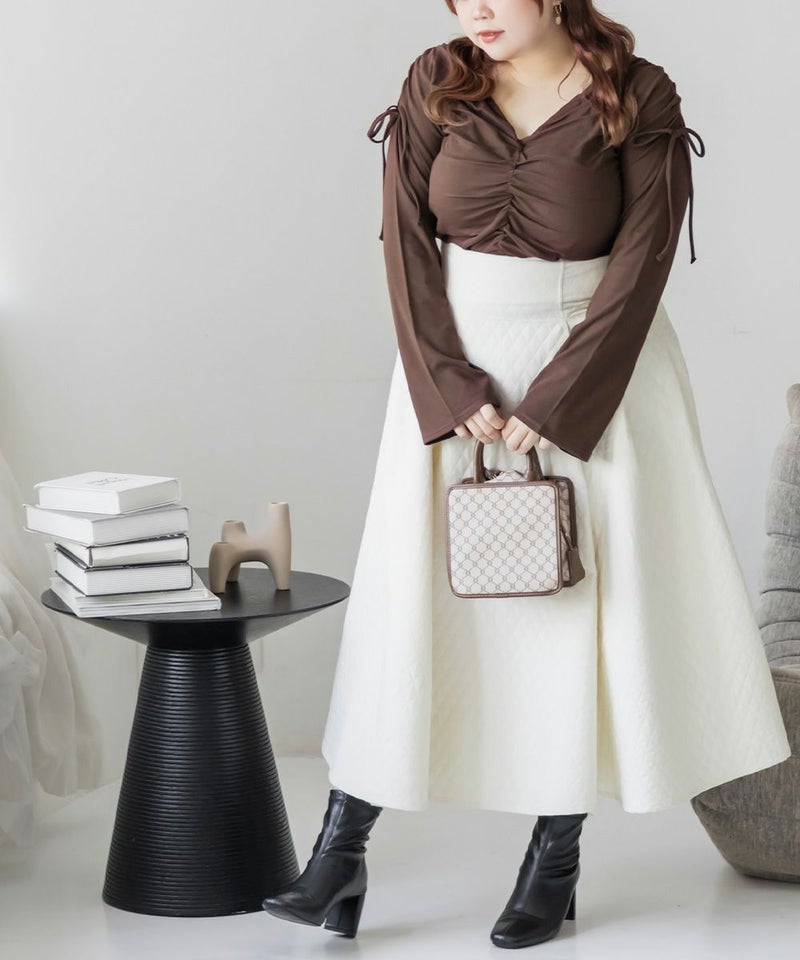 すっきりとしたシルエットだから、ワイドパンツやスカートと合わせるとスタイルアップして着る事ができます。裾周りはあえてギャザーなしにしているから、スカートにインしてもごわつきません。デザイン性の高い着映えするトップスだから、シンプルなボトムとあわせてもコーディネートがまとまります。