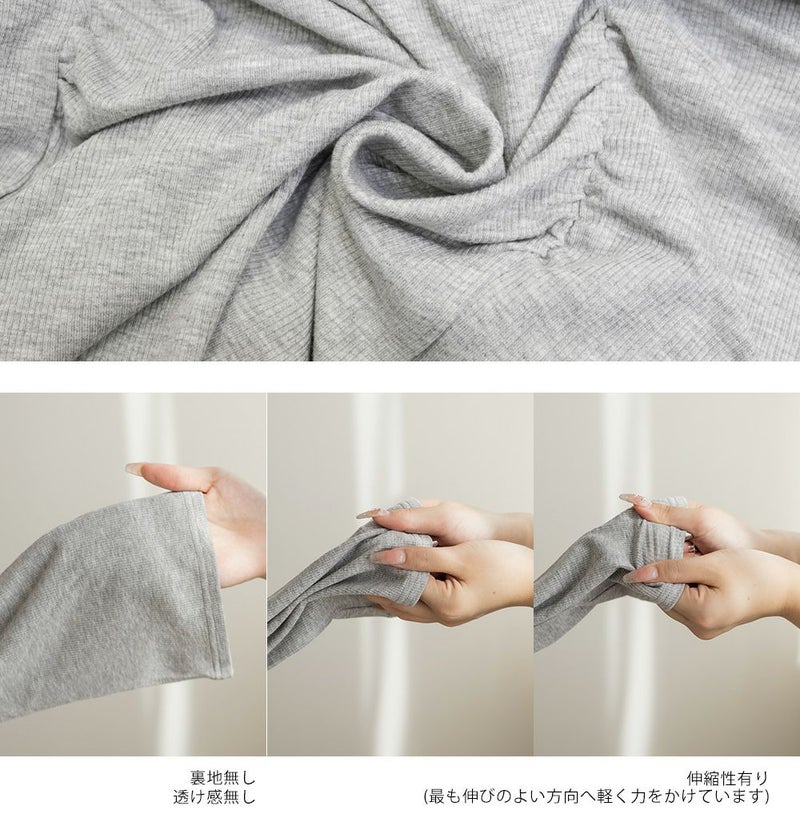 柔らかく伸縮性のある、細かめのリブカットソー素材。優しい肌触りで着心地も良いのは嬉しいポイント。