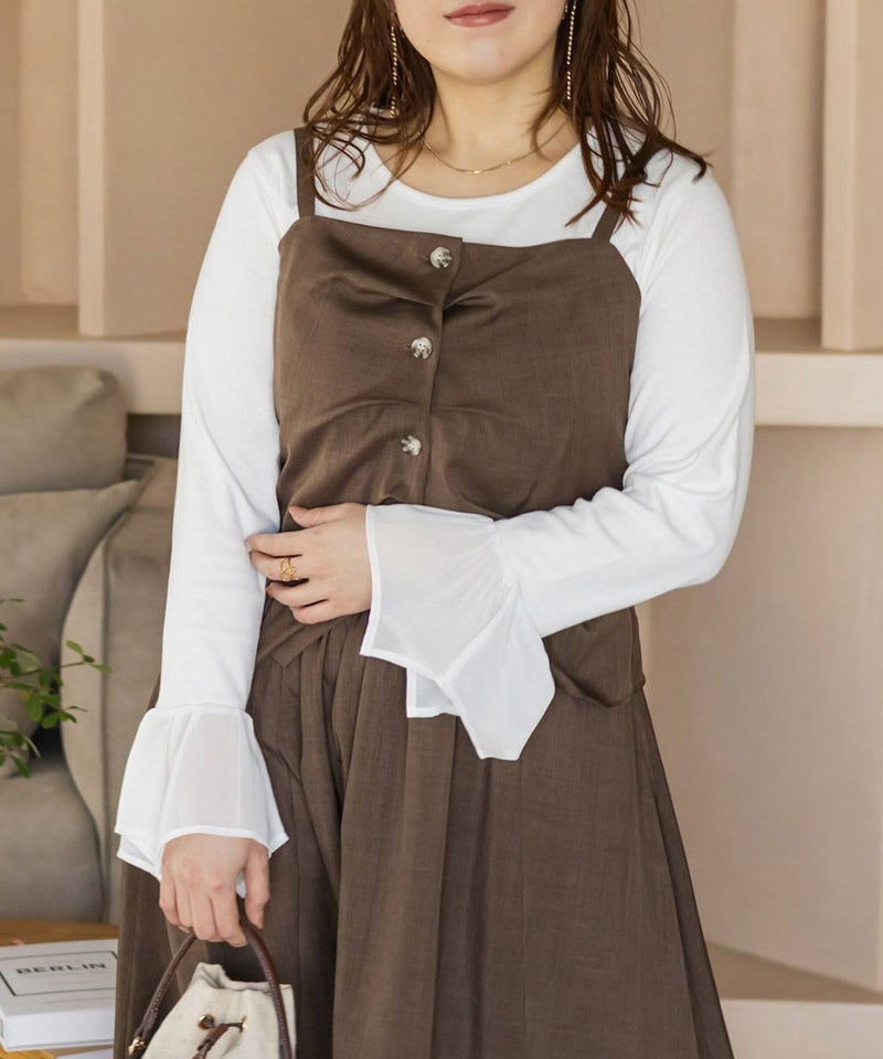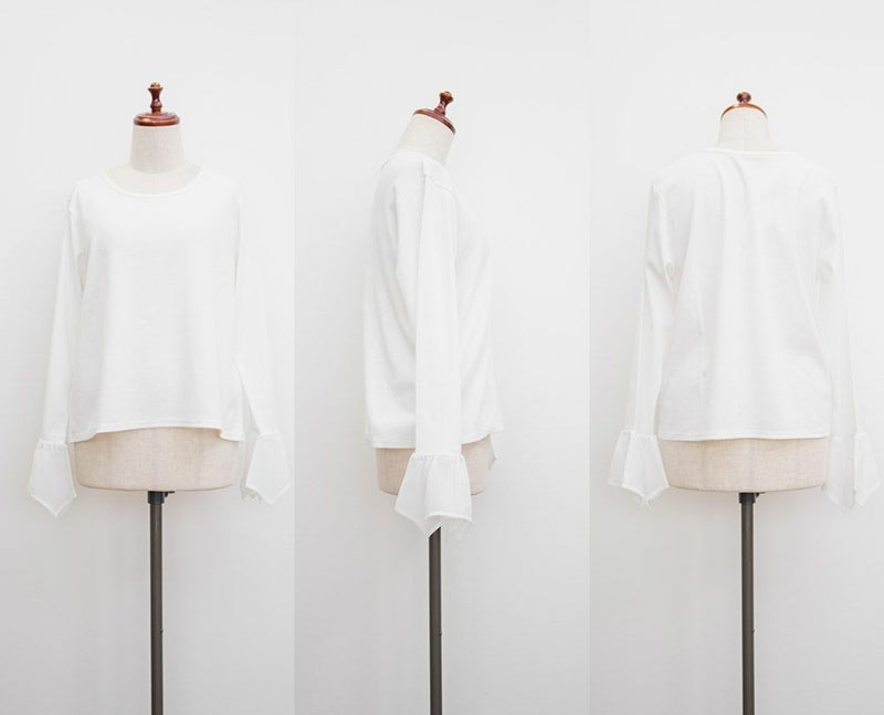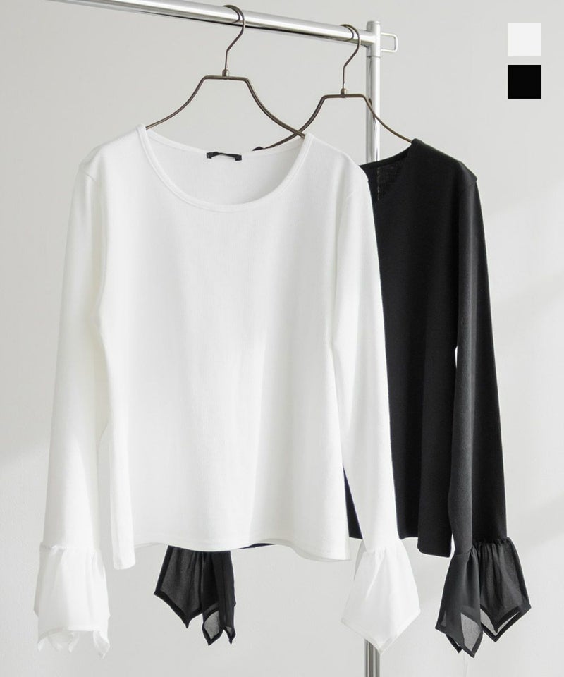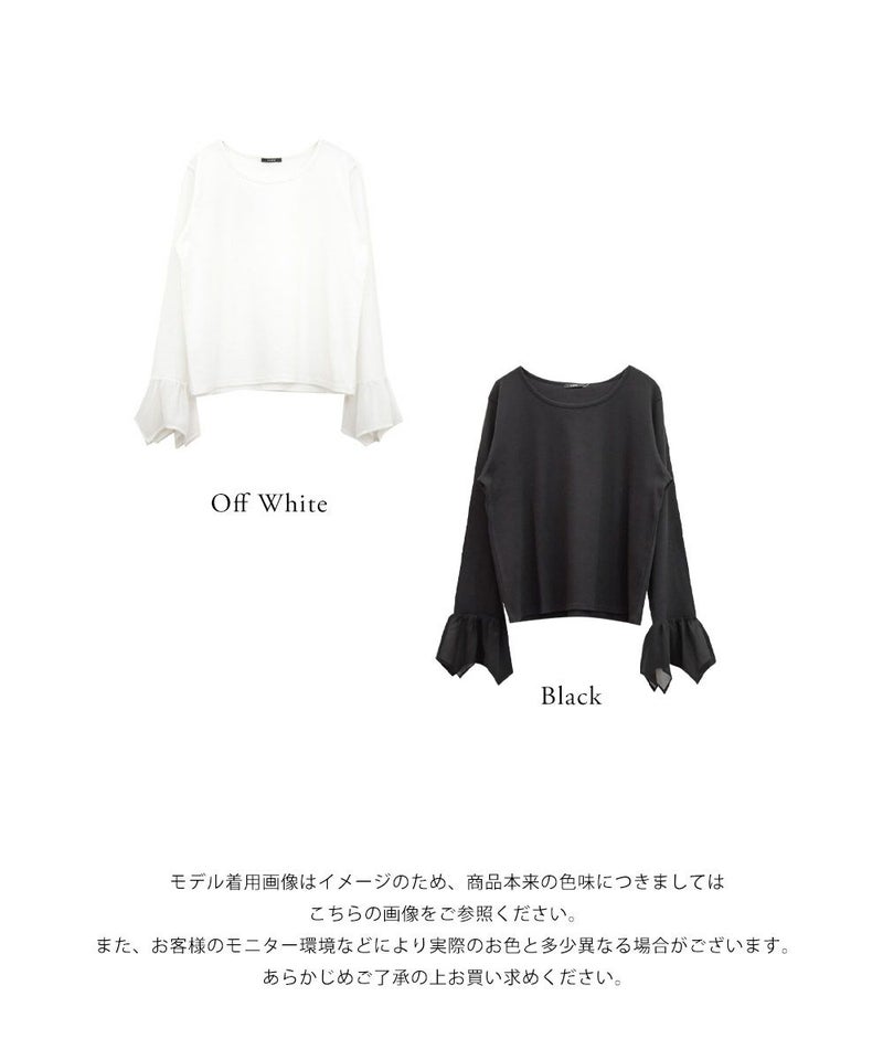 本体はリブカットソーで袖部分はさらりとしたジョーゼット素材。真夏以外のロングシーズン使える生地です。程よい生地感だからインナーとして着てももたつかず、コーデの主役トップスとして着る事も可能。