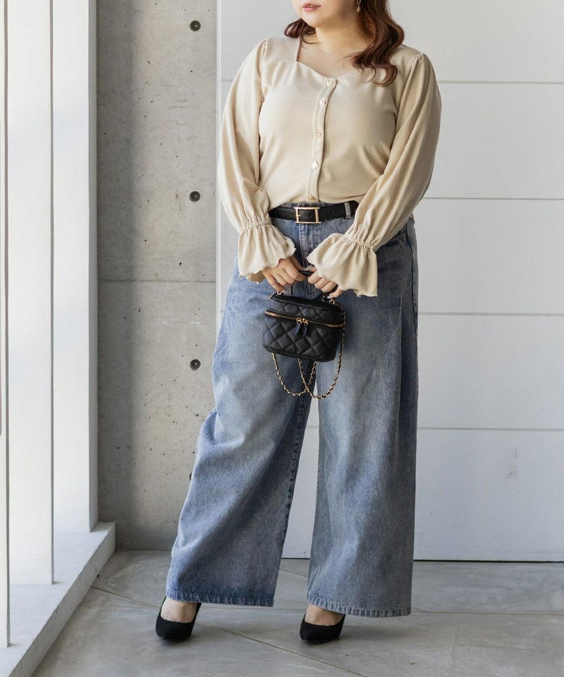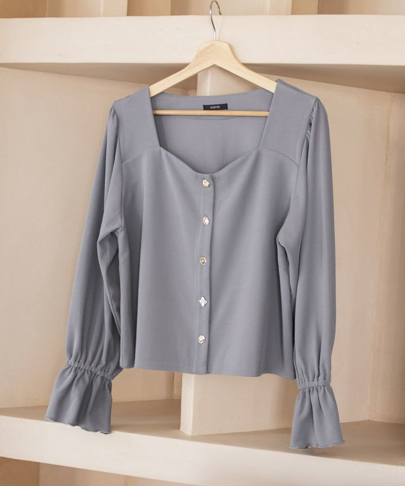 デザインちがいのアソートボタンが遊び心のあるフェミニンなプルオーバー。すっきりとした印象のスクエアネックと二の腕をカバーしつつ手元を華奢見せするキャンディースリーブで着やせ効果もアップ。
