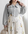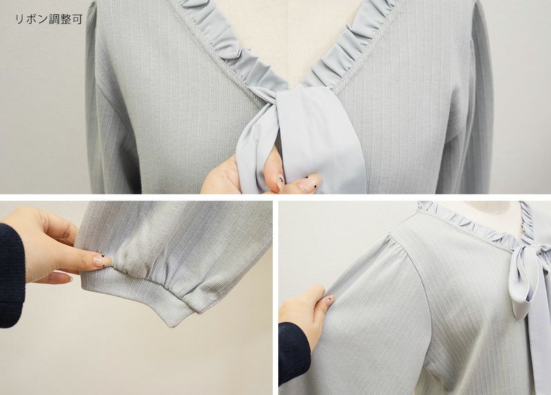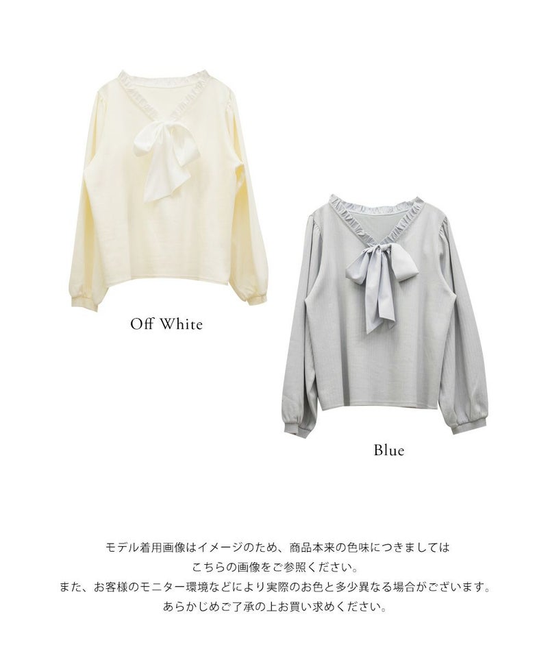 【design】襟のフリルと大きめリボンがフェミニンなポイントになったカットソー。着心地らくちんなのにデザイン性たっぷりの嬉しい1枚。【material】伸縮性があり程よくしっかりとしたリブカットソーに、襟とリボン部分には柔らかい布帛生地を使用しています。【styling】可愛らしい雰囲気なのでスカートと合わせてガーリーなスタイルにまとめるのがお勧めです。裾がごわつかないデザインなのでスカートに裾をインした、フィット&フレアシルエットで王道スタイルもしやすいアイテムです。
