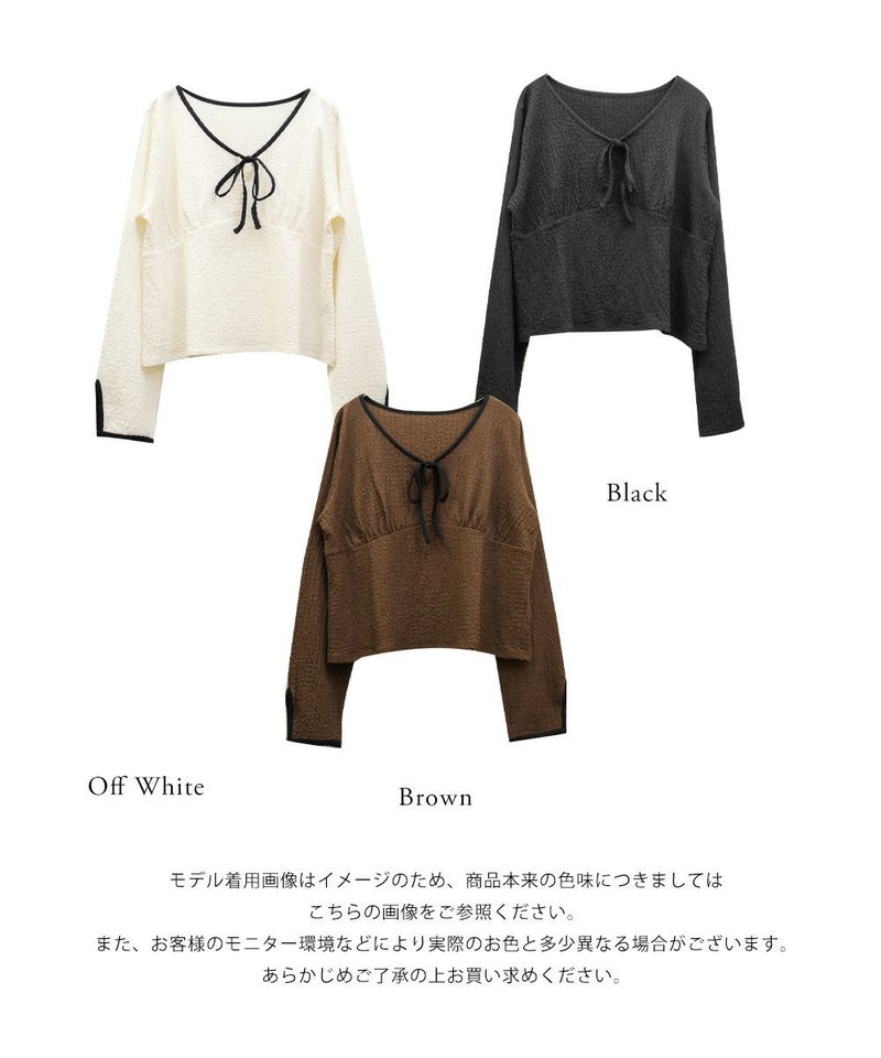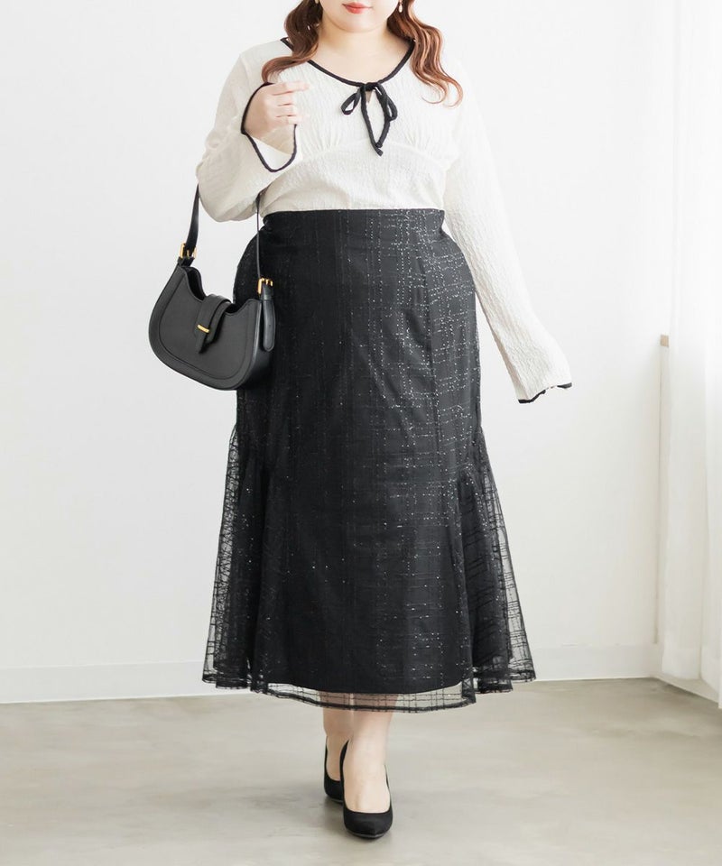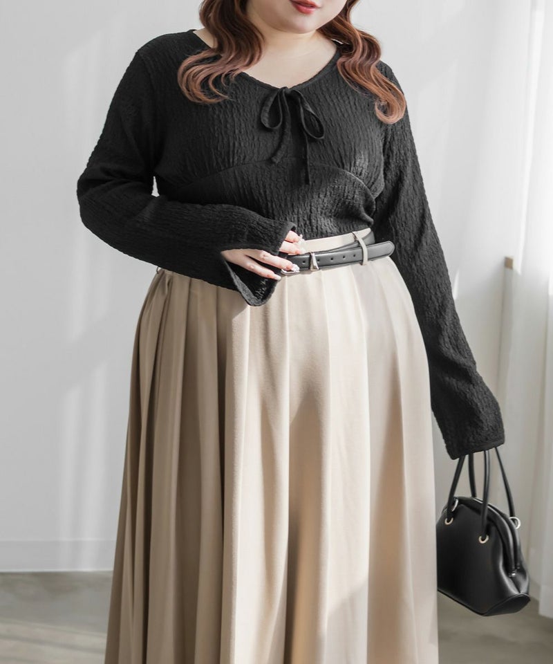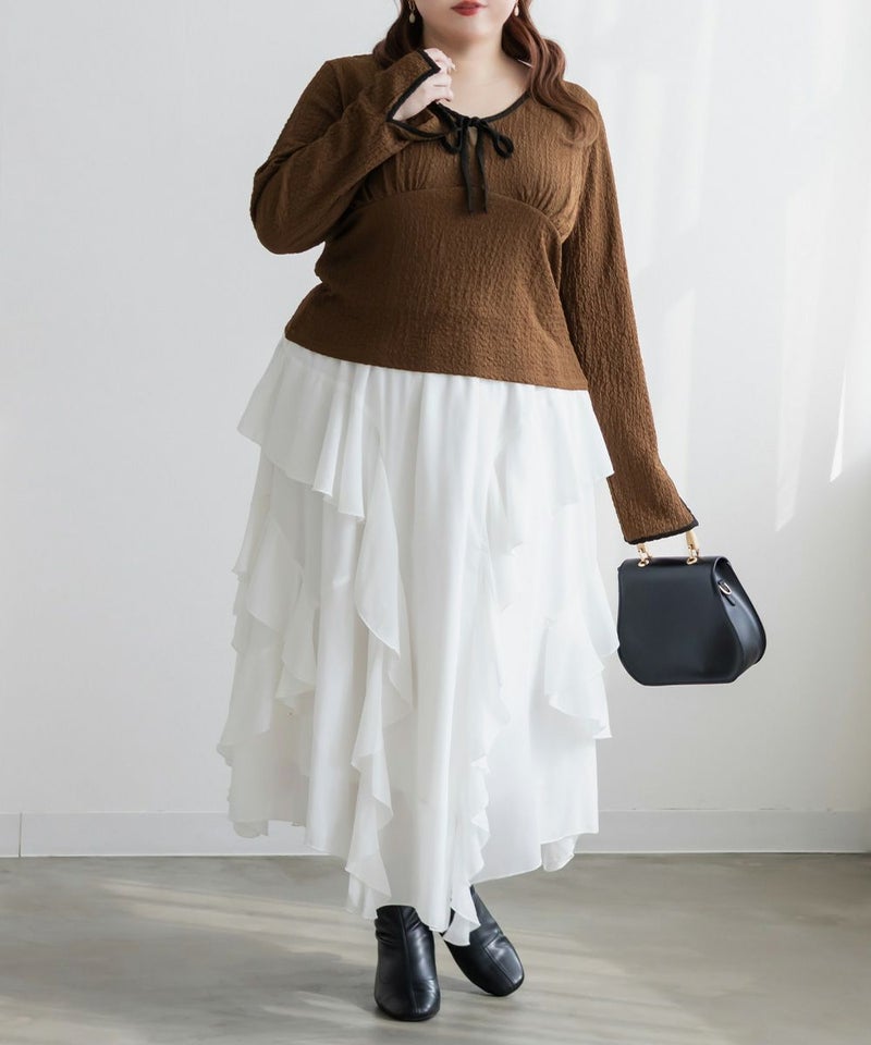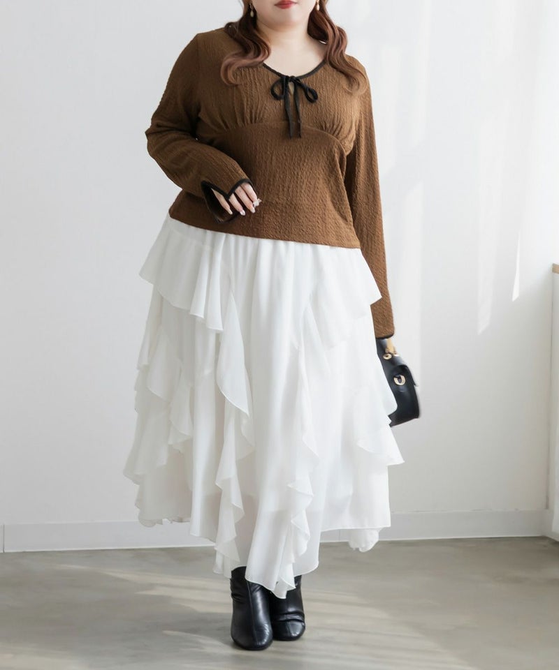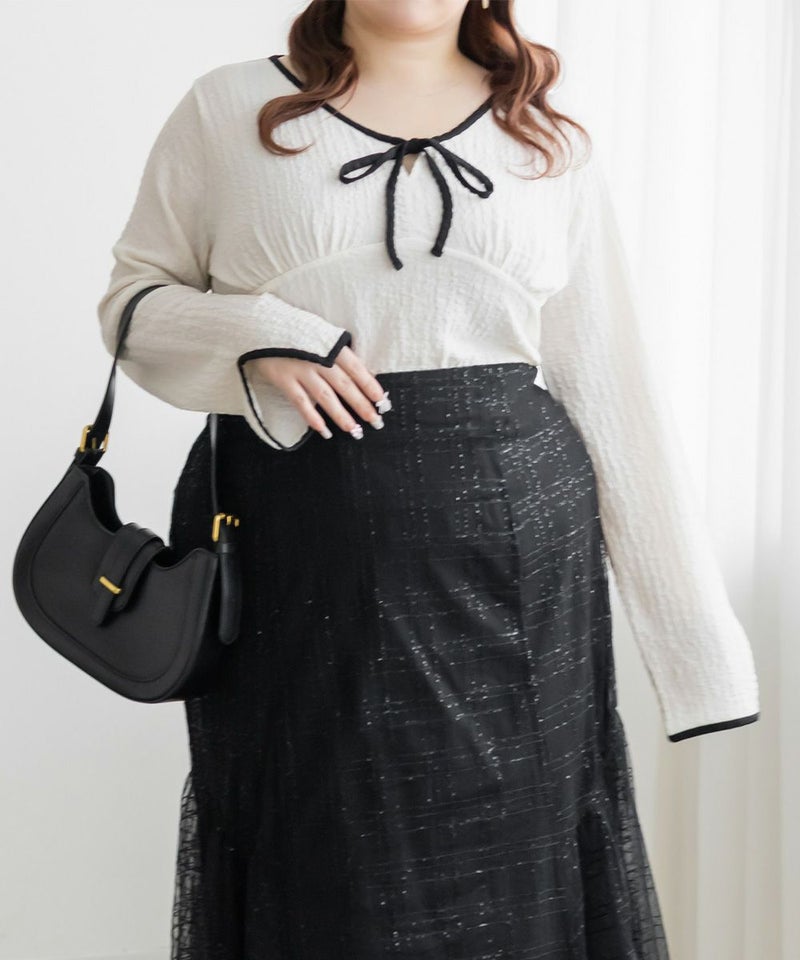 3Lサイズを着用しました。いつも着ているサイズ感と比べてちょうどよく、身幅や袖にも程よいゆとりがあって楽に着られました。配色デザインとリボン切り替えがポイントになって、1枚でしっかり着映え